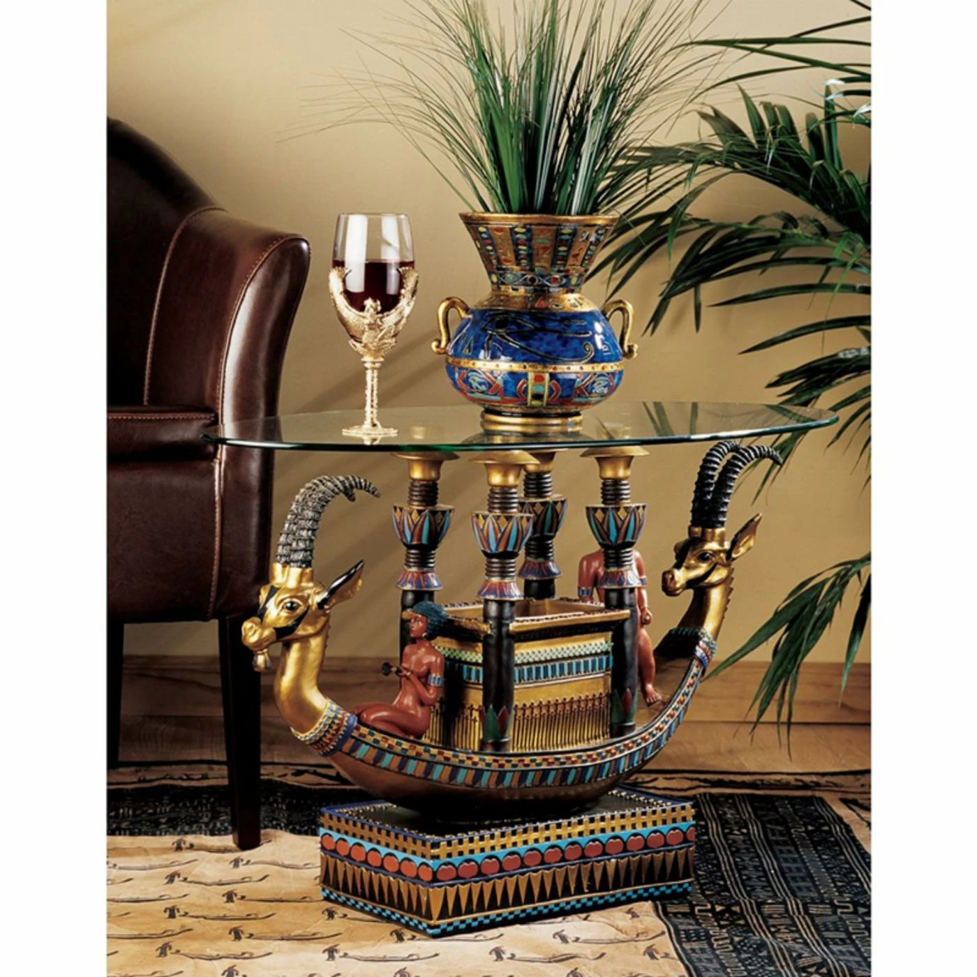 The Design Toscano Egyptian Barge to the Beyond Glass-Topped Table features an Egyptian motif in rich tones of gold, red, and teal. The base is constructed of resin and holds up an oval glass tabletop. This table is detailed enough to function as a sculpture, but also functional for use as a side table in your living area.