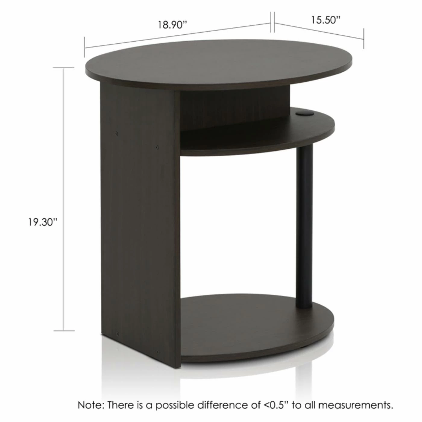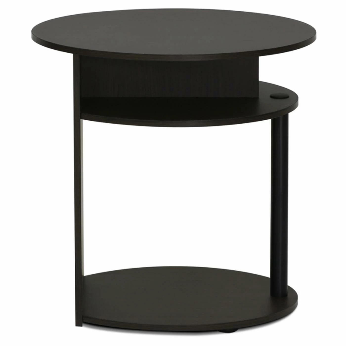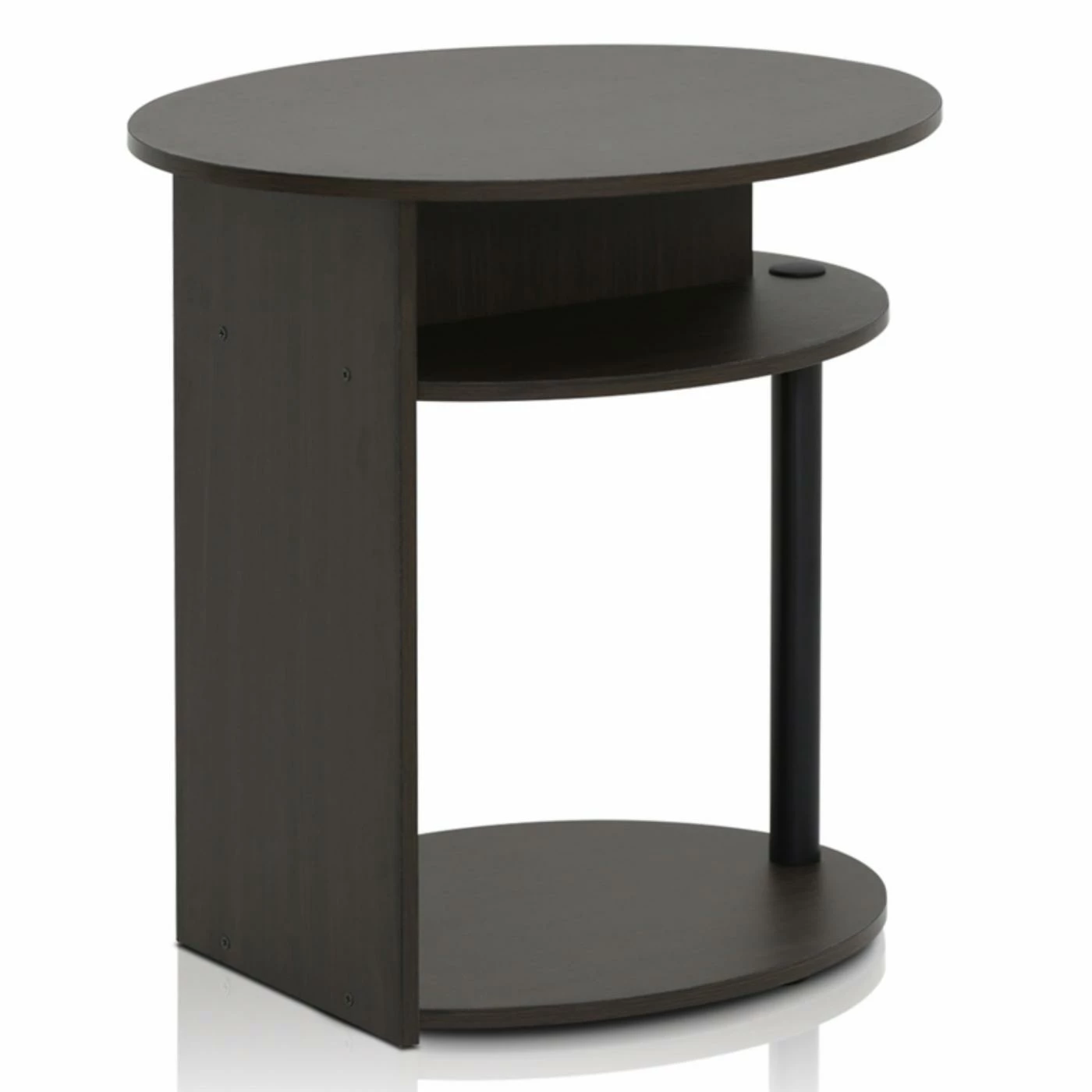 Fresh and modern, the Furinno Jaya Simple Design Oval End Table updates your space with a casually cool design. This end table has ample room for storage with a large lower shelf and center half-shelf, backed by a solid rectangular panel. Crafted of sturdy engineered, MDF wood, this sleek table resists warping and splintering for a lasting, smooth look. Finished in a rich shade of black walnut, this end table adds a hint of urban-edge to your dΓ©cor.