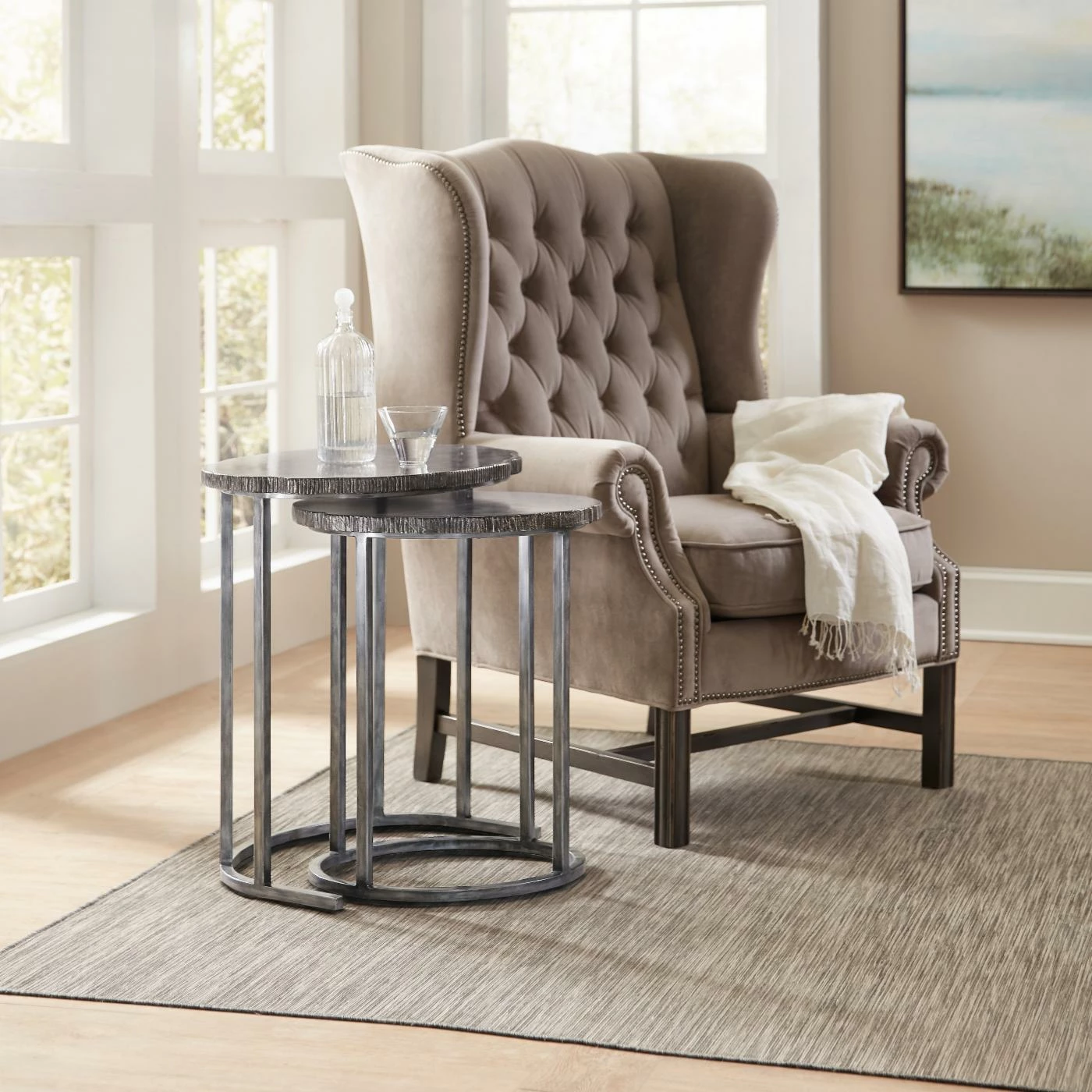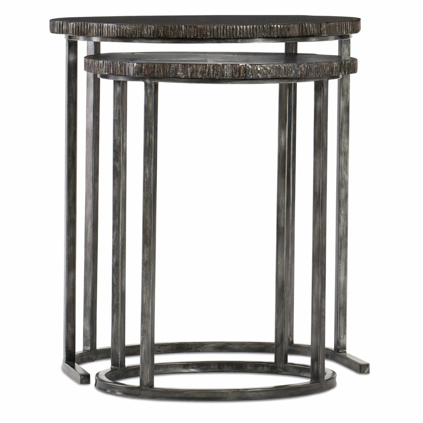 Style the Hooker Furniture Petrified Wood Nesting Tables in your entryway or living room and top with favorite pieces. Or use this set of two nesting tables as side tables, wherever they’re needed most. Petrified wood stone tops and oval-shaped metal tube bases are painted in an industrial gray with brass lacquer frame finish.