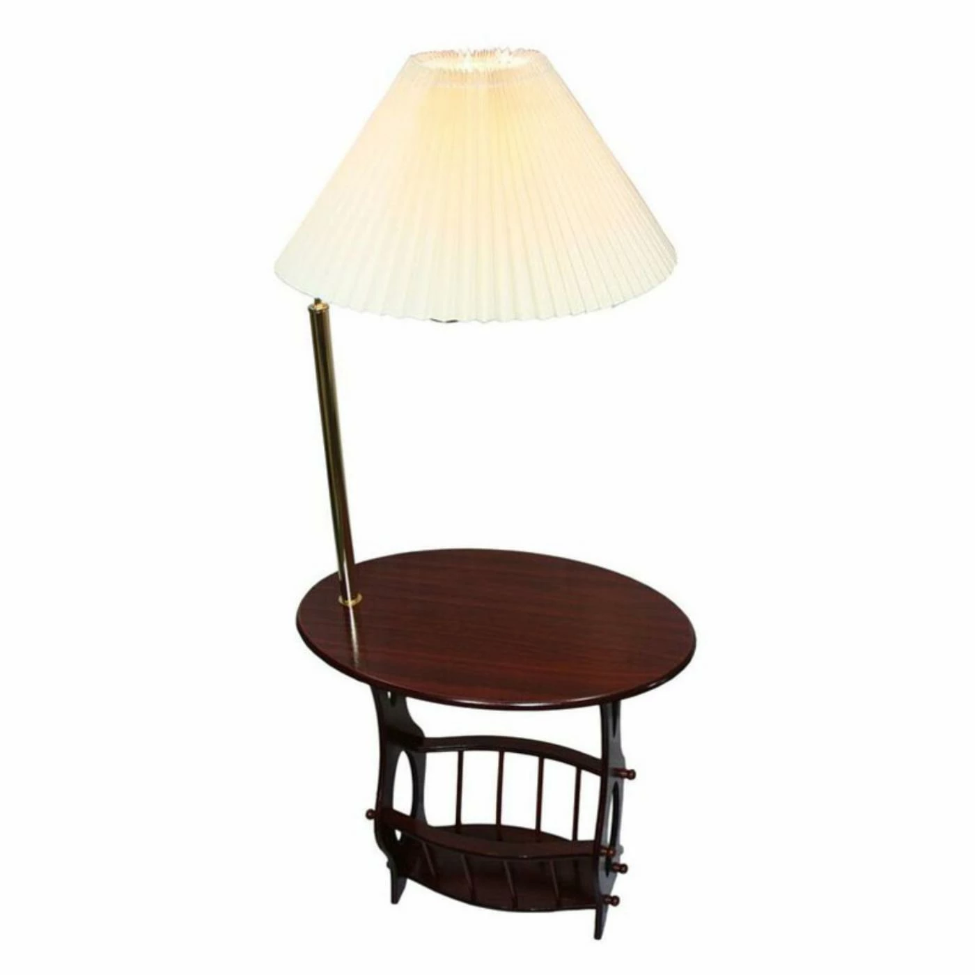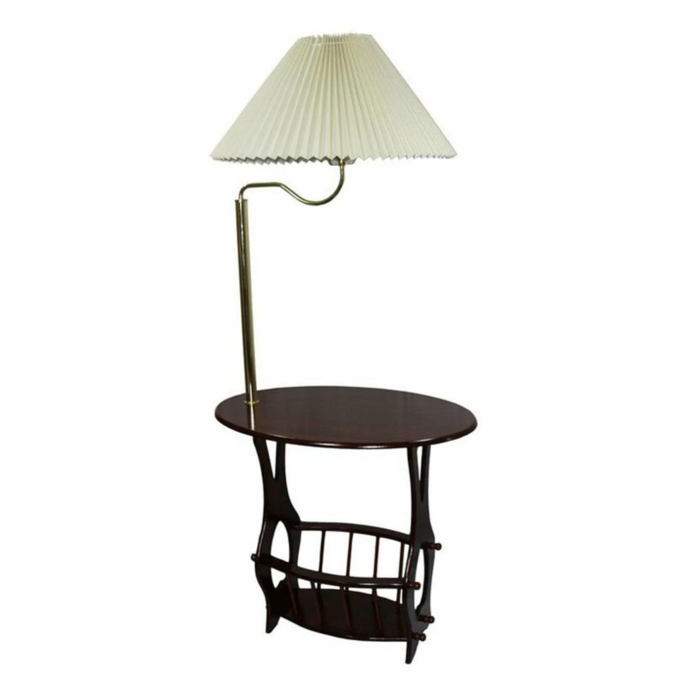Bring a decorative and functional note to your setting with the ORE International Brass Lamp End Table with Magazine Rack. An ideal furnishing to pair with your favorite reading chair, this end table features a brass lamp and magazine rack base. With each feature integrated into one, this accent is a great space saver. The table and rack features a rich cherry finish. Its lampshade is crafted from pleated ivory hard paper that’s sure to pair well with any decorative plan.