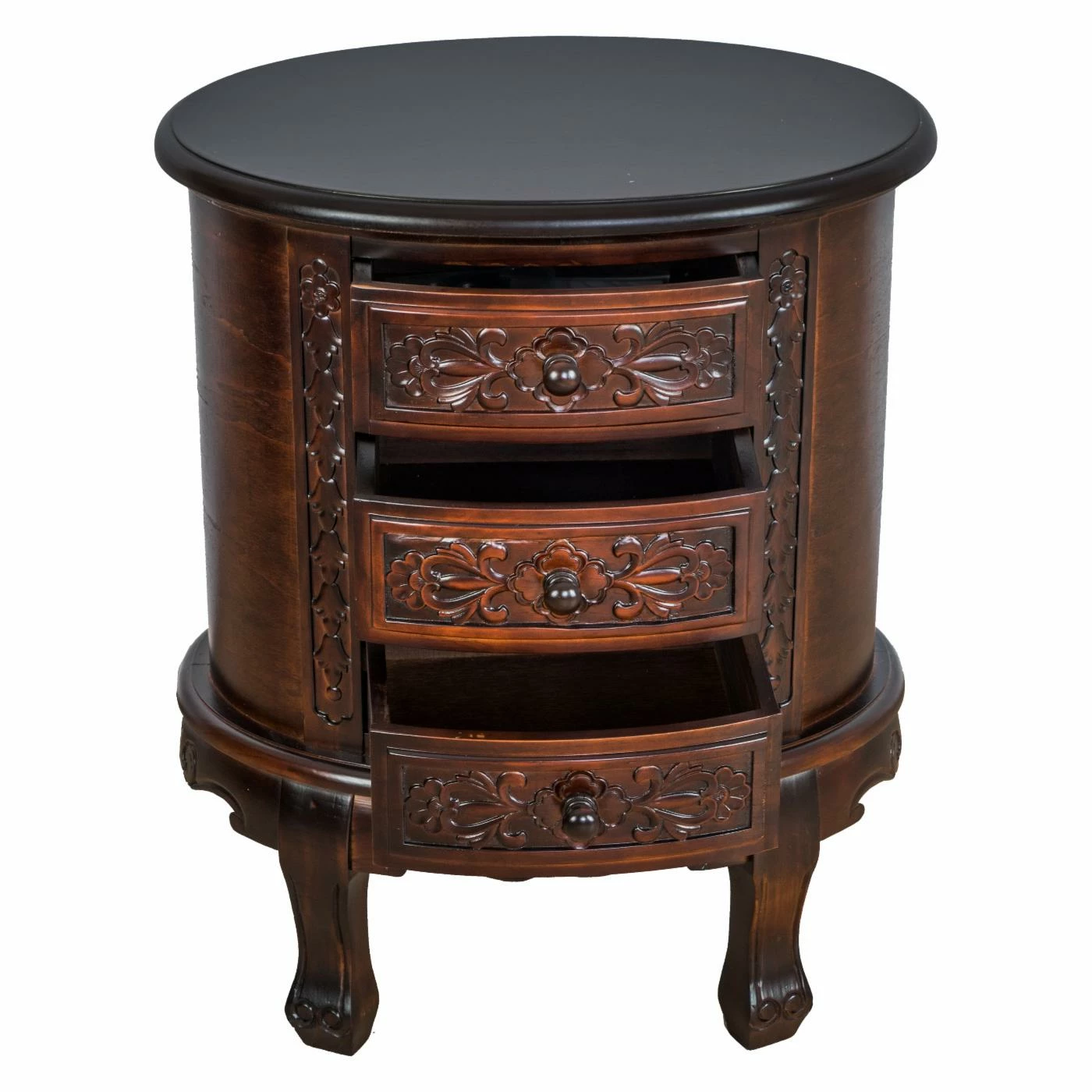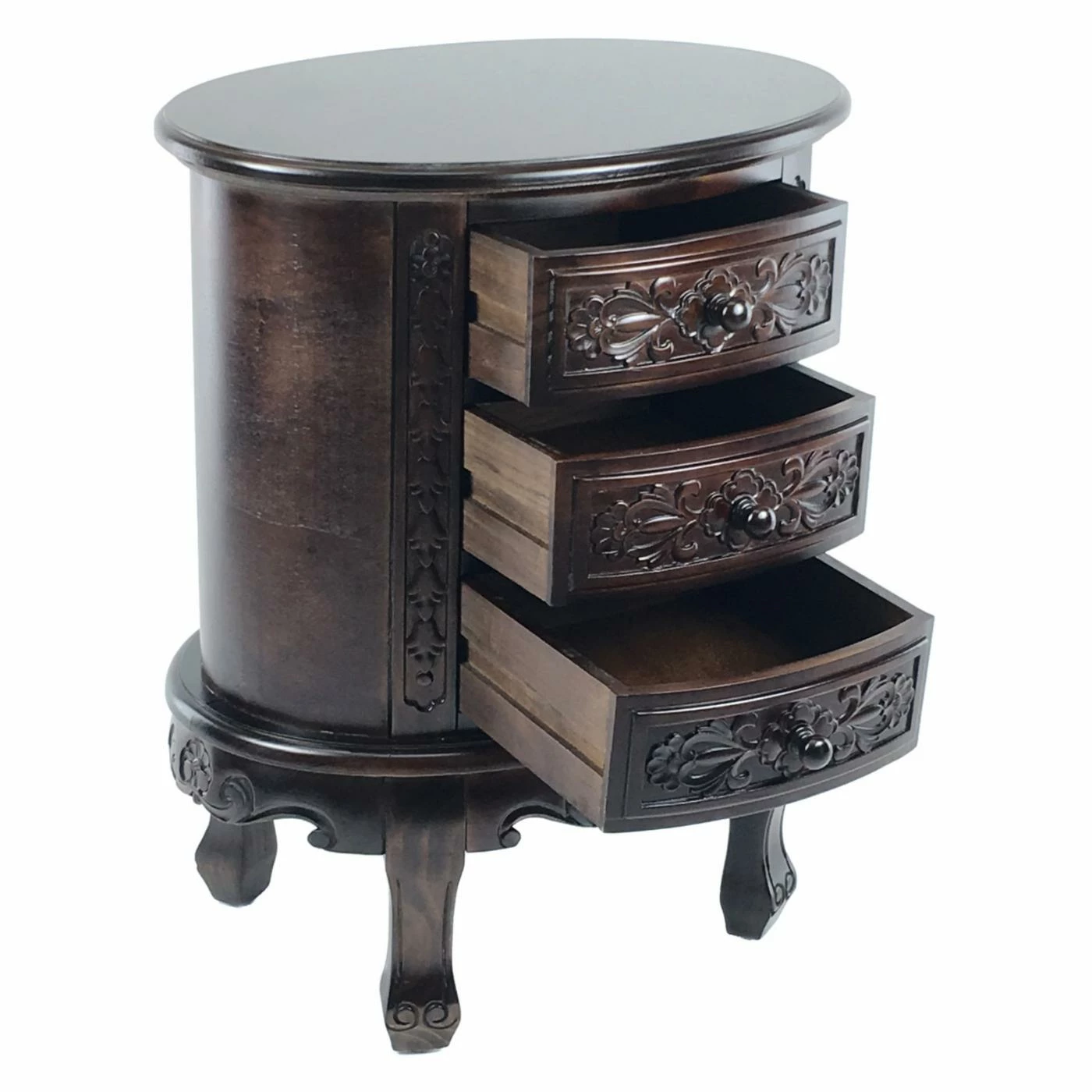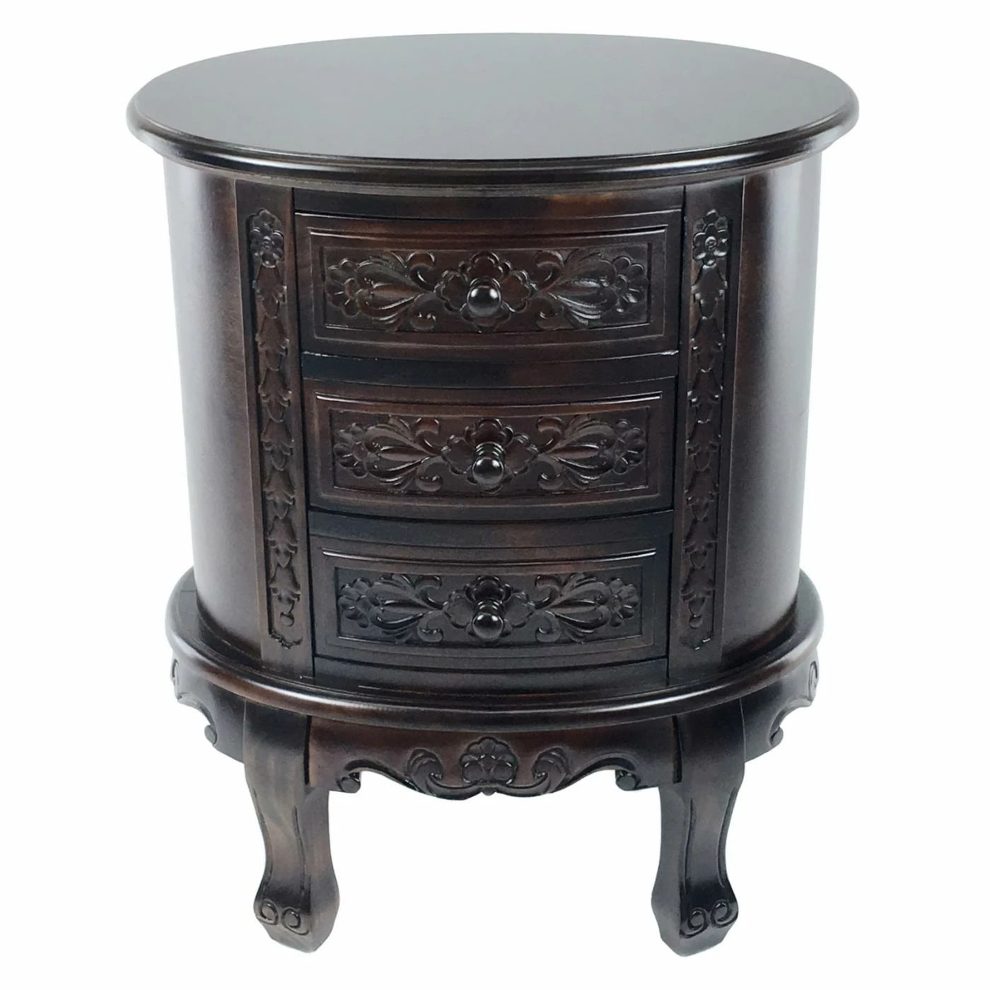 Give your storage the royal treatment with the Wayborn 3 Drawer Oval Side Table. This durable birch wood side table features intricate carved detailing and charming Queen Anne legs for a classic, antique look. It includes three drawers for all your chair-side or bedside essentials, and a flat oval top to display your favorite dΓ©cor. This table’s rich brown finish and old-world appeal are sure to warm up any space.