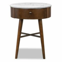 The Poly & Bark Andover Side Table offers a classic take for your contemporary world. Boasting a unique rounded wooden silhouette in a rich walnut finish with a touch of antiquing, itβs topped by a beautifully cut circle of artificial white Italian marble brimming with gorgeous natural veins and shading. A drawer spacious enough for a few books or TV remotes features a vintage-inspired metal drawer pull in brass finish. The tapered legs are well-braced by powder-coated steel crossbars. Place this chic side table by your bedside or sofa for refined allure thatβs forever in vogue.
