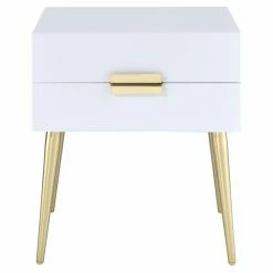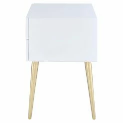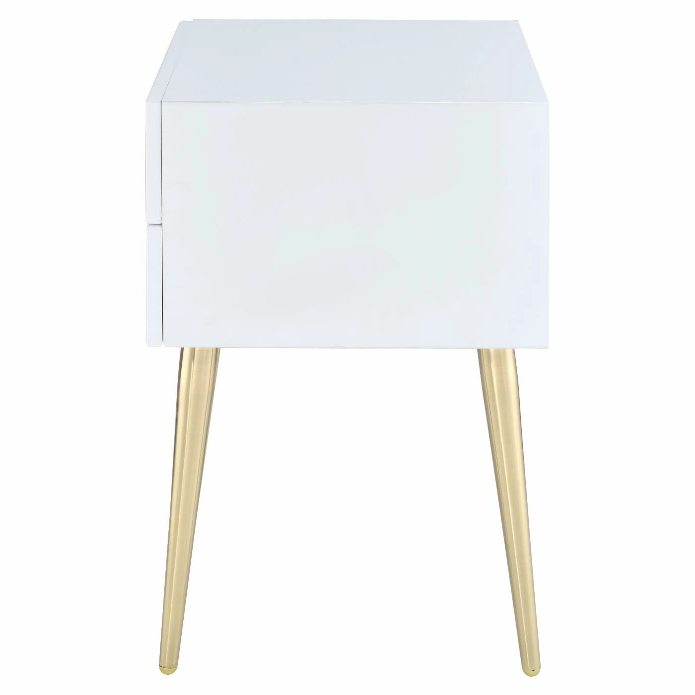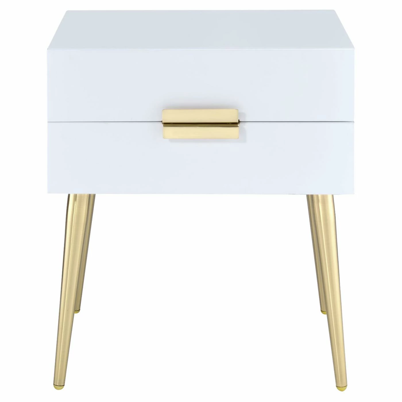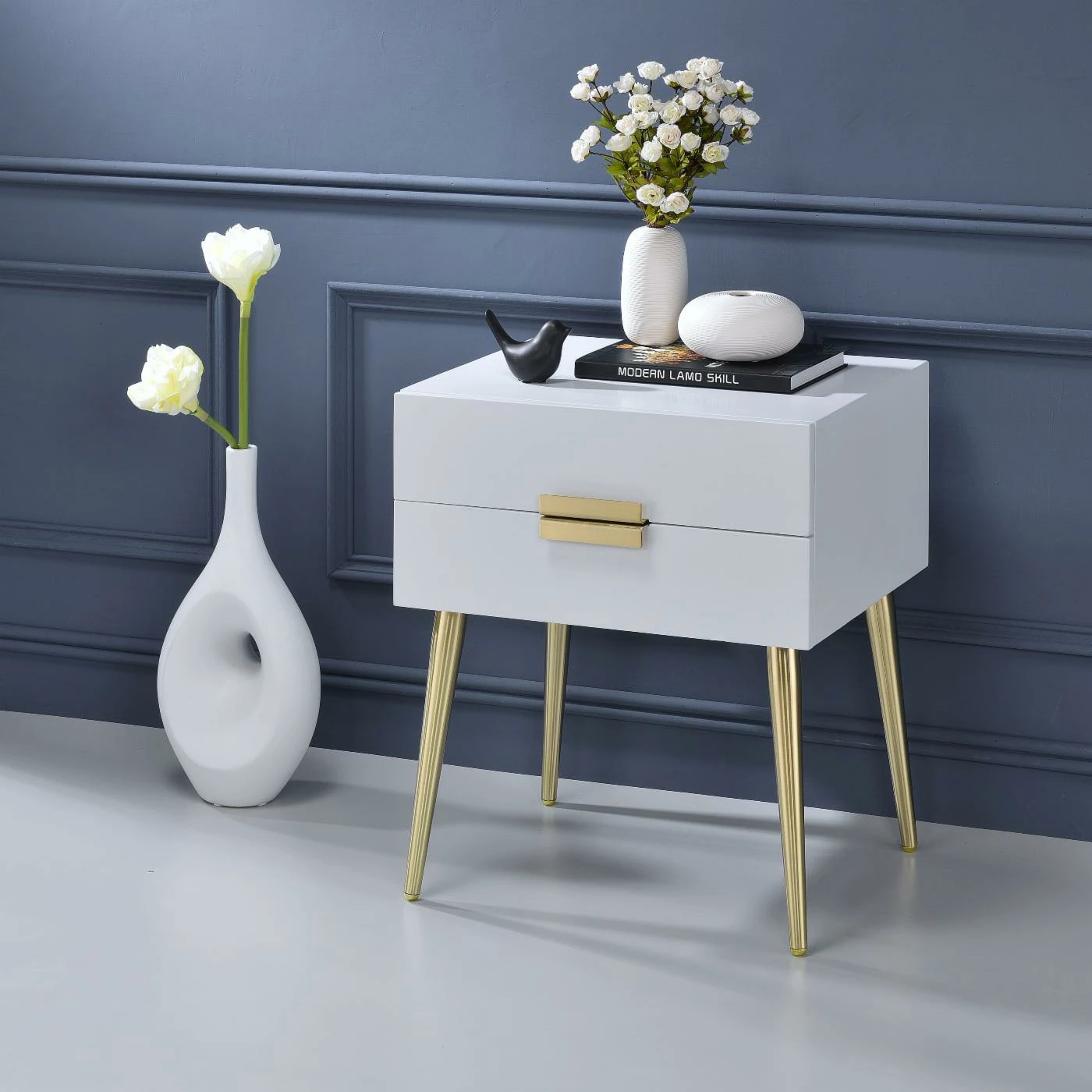 Mid-century modern meets glam with the Acme Furniture Denvor End Table, highlighted with gold tapered legs and gold-finished hardware. This ultra-modern end table comes in your choice of available finish to craft the ideal look to your chic living space or bedroom. Two drawers offer hidden storage for accessories, clothing, and other essentials.