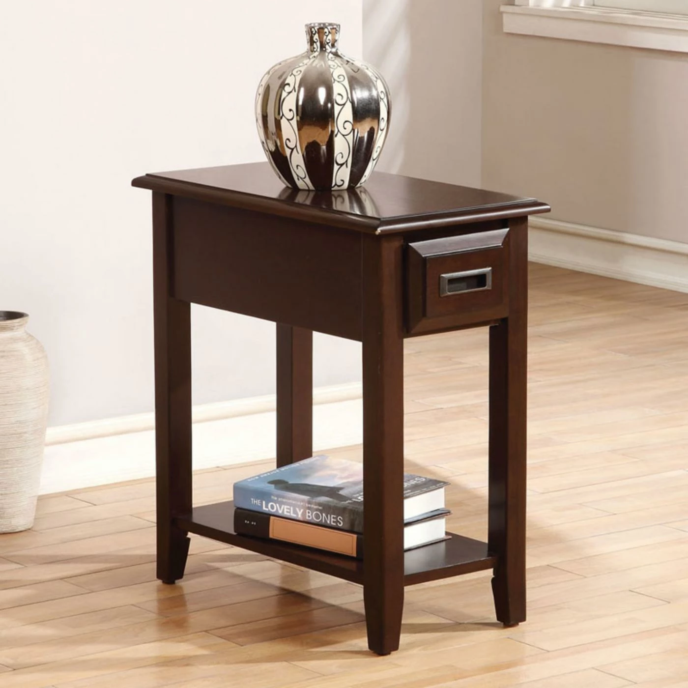 An engaging blend of contemporary appeal and practical function, the Acme Furniture Flin End Table is a charming addition to any upscale home. With its simple yet elegant look and beautiful dark cherry finish, this table will make its presence felt in any setting. A small drawer and lower shelf make storing remotes and phone chargers a breeze. Sturdily made from rubberwood and cherry veneers, this end table will offer many years of practical function.