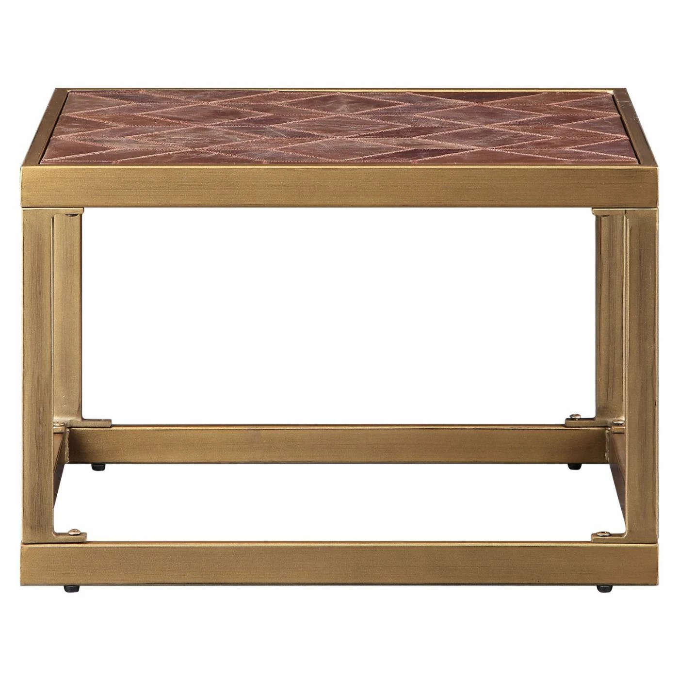 Outfit your den or living room with the Acme Furniture Genevieve Leather Top End Table for a useful surface that does more for your decor than provide a place to set drinks. Thick metal slats constructs the open sled-style base, topped by an incredible brushed brass finish. The rectangular top is upholstered with rich brown top-grain leather and accented with a diamond decorative stitching design.