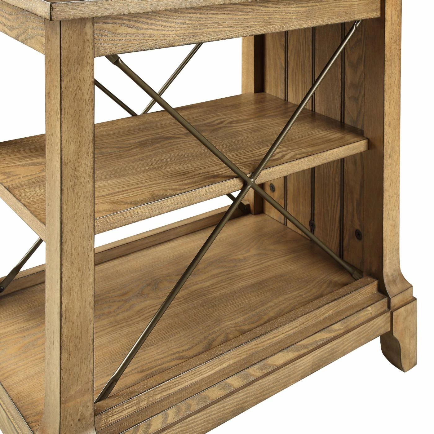 The Acme Furniture Hiroko End Table gives a distinctive look to your living room with its warm oak finish and thick wood construction. This rugged end table is accented with two open shelves under the rectangular top that are perfect for storage and display. A metal x-bar on each side adds a bit of industrial flair.