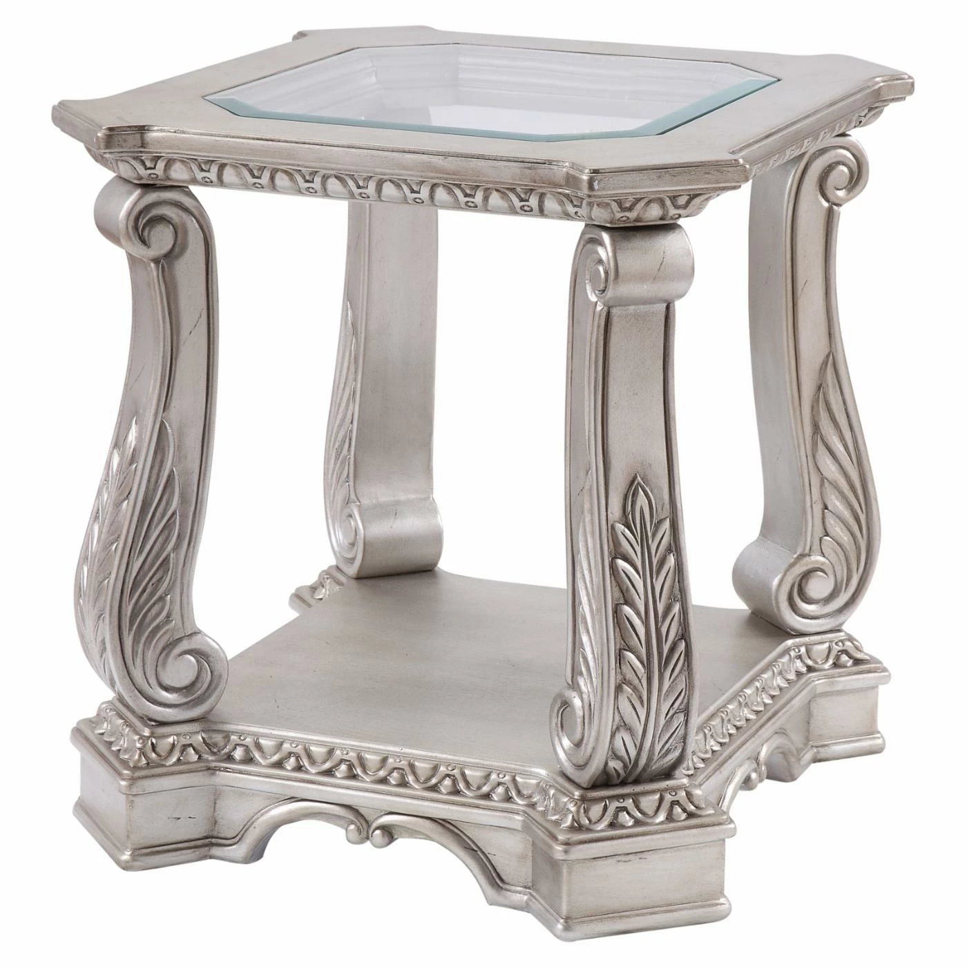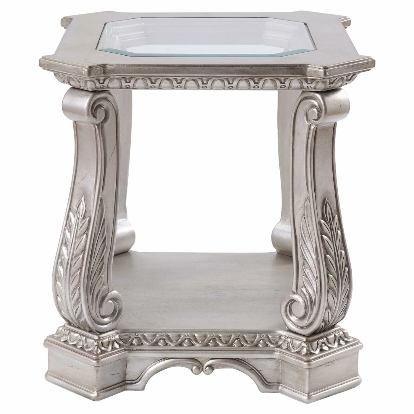 Elevate your interior design to something more sophisticated and stately with the Acme Furniture Northville End Table. This end table is modeled after classical European pieces, featuring ornate carved and molded resin details to form something you might see in a palatial estate. The frame is built from solid poplar hardwood with a silver finish. Scrolled legs, scalloped lines, and leaf carvings adorns the frame. The top comes with an inset piece of clear tempered glass at its center. A lower shelf are makes a perfect perch for a vase, jug, or potted plant.