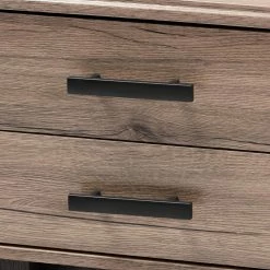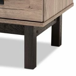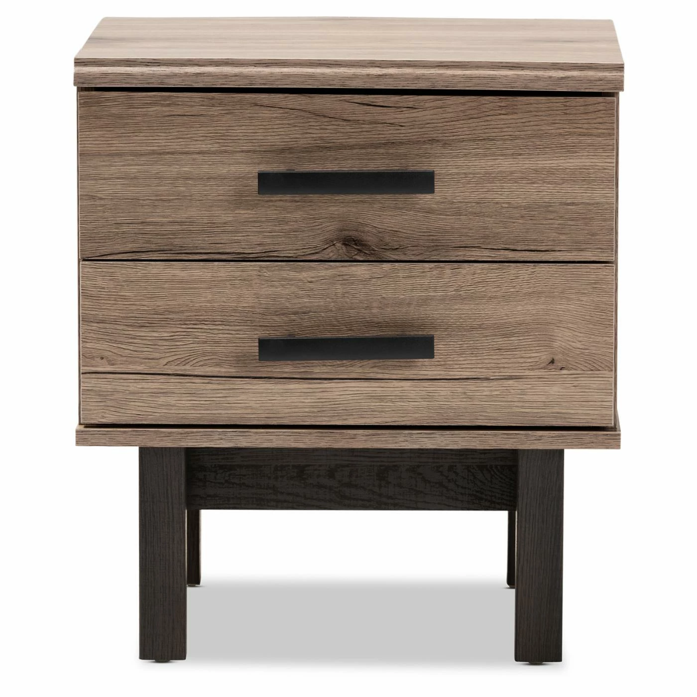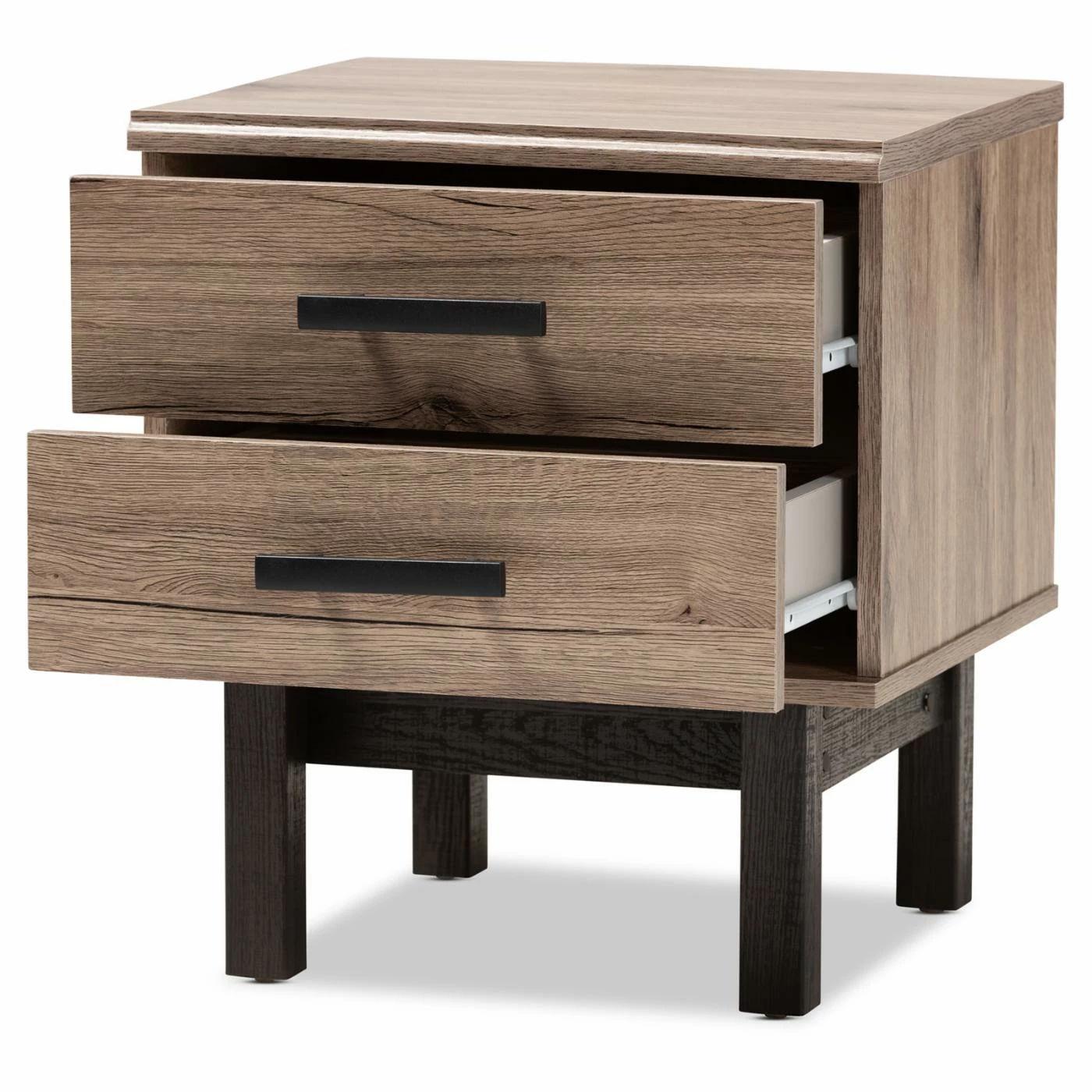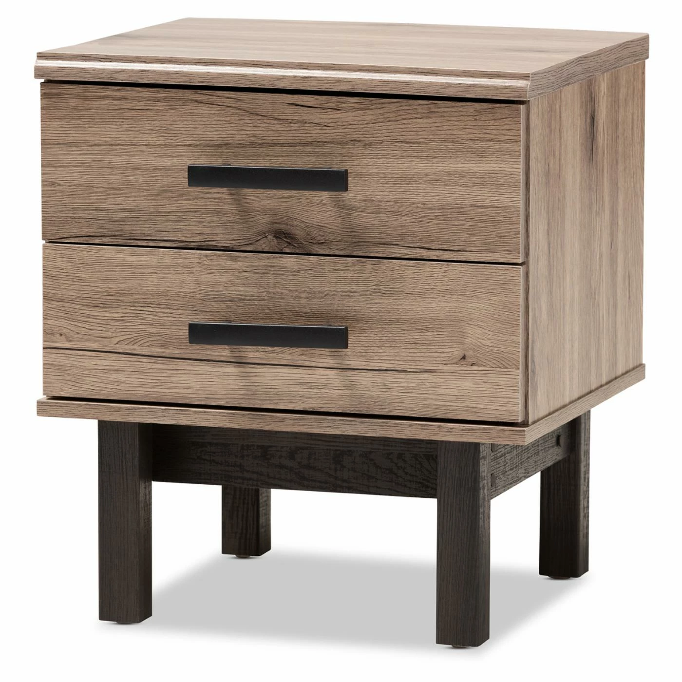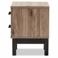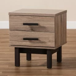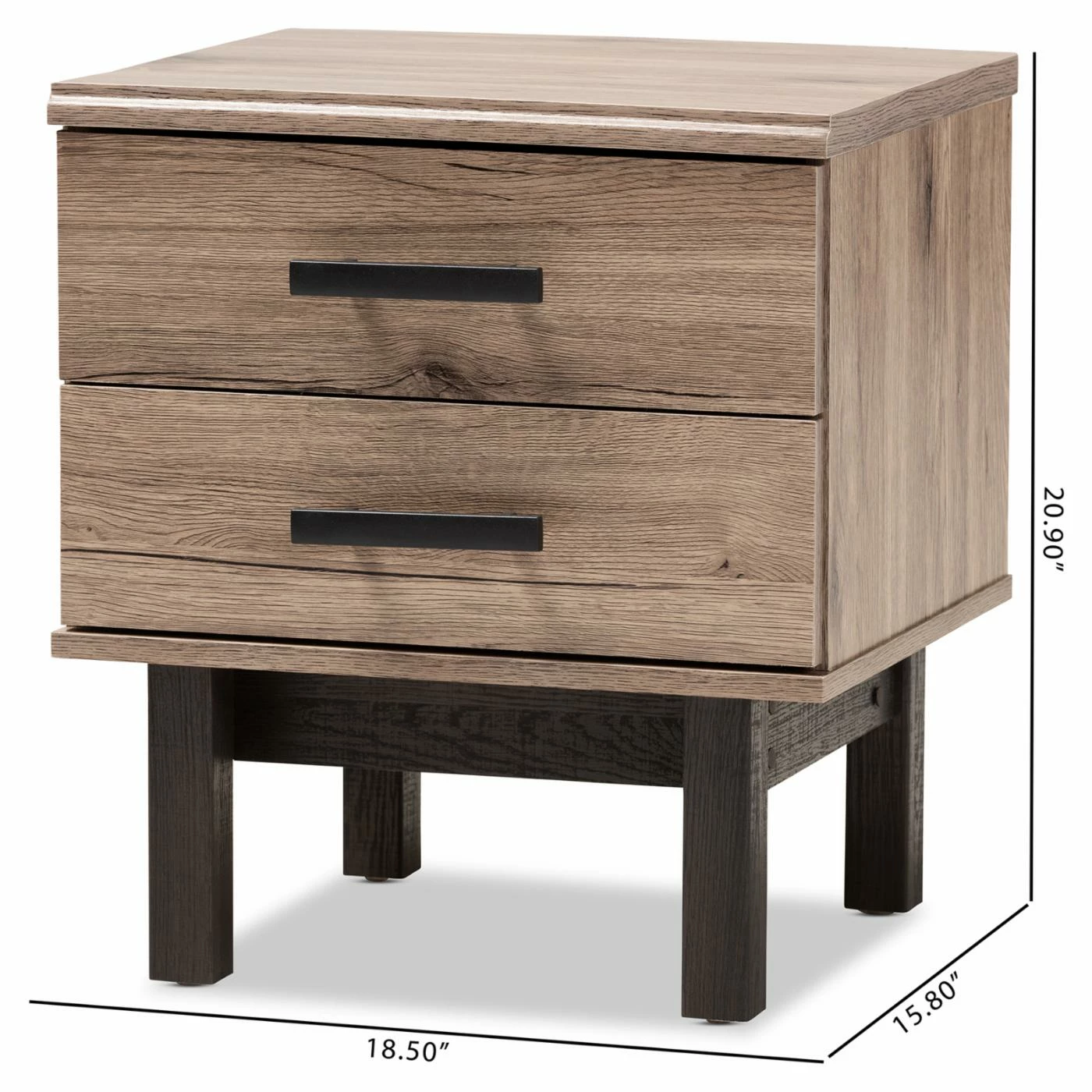 Pair your new sectional or sofa with the Baxton Studio Arend 2 Drawer End Table for a perfect perch for your table lamp and at-hand storage. The piece is rendered from engineered wood with block legs. Two drawers are built into the frame, each outfitted with black plastic bar handles. The cabinet top comes with a light oak veneer while the base is finished in ebony.