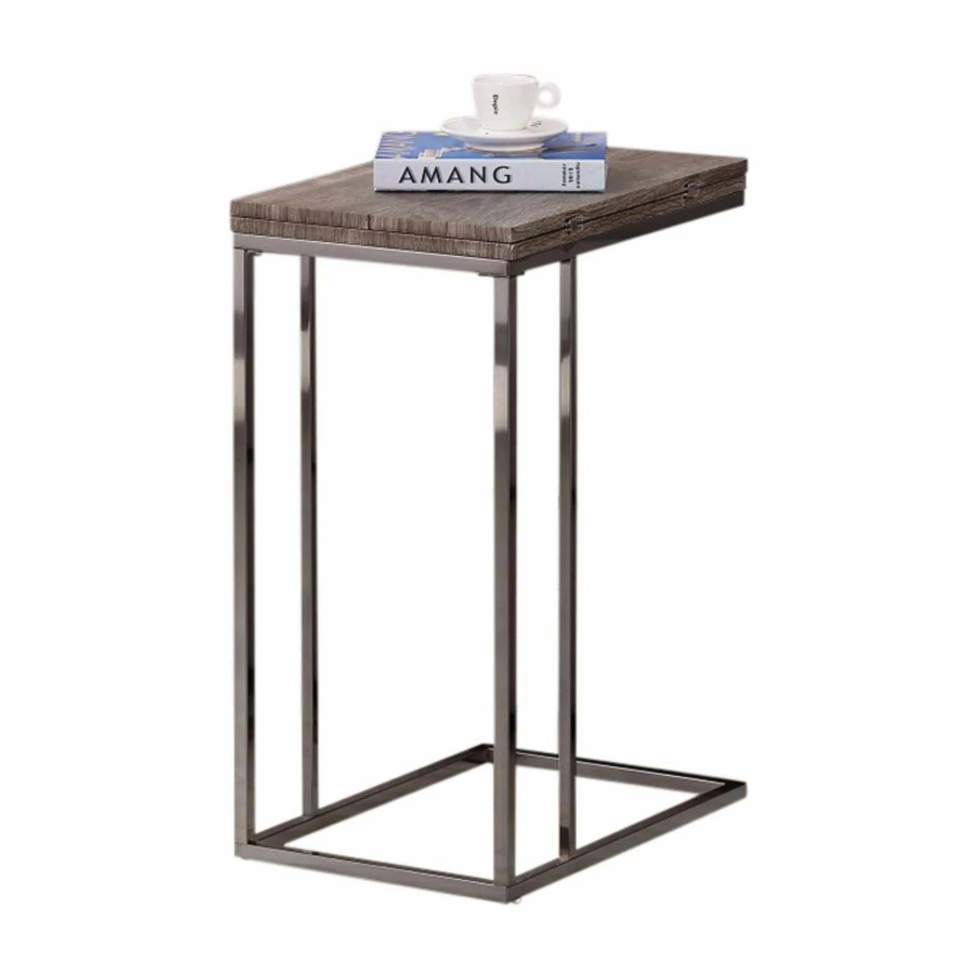The natural wood finish top on the Benzara Stylish Wooden Snack Table complements the silver, pewter finish. Slide the table up to your spot on the couch and enjoy your morning cup of coffee. The mixed materials of metal and wood join together to form the C-shaped design of this snack table.