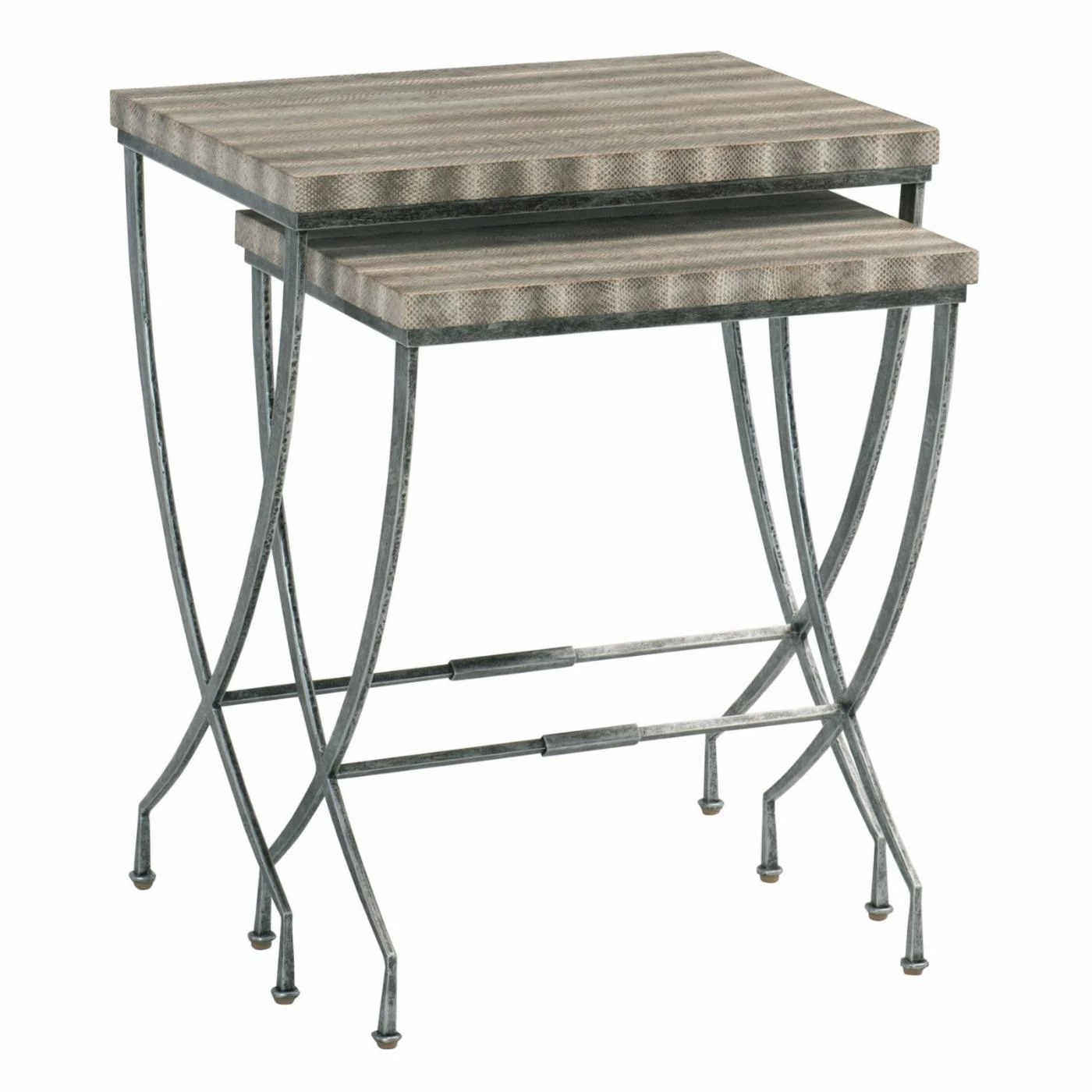 Bunch the Bernhardt Wyman Nesting Tables together for a chic and customized cocktail table. You could also nest these two tables to save space or style them separately to build a cohesive look throughout your living room. For a chic edge, the table tops are wrapped in brown and gray faux snakeskin. Traditionally curving iron stands in an aged pewter finish lend a sleek, traditional look. The set includes two nesting tables.