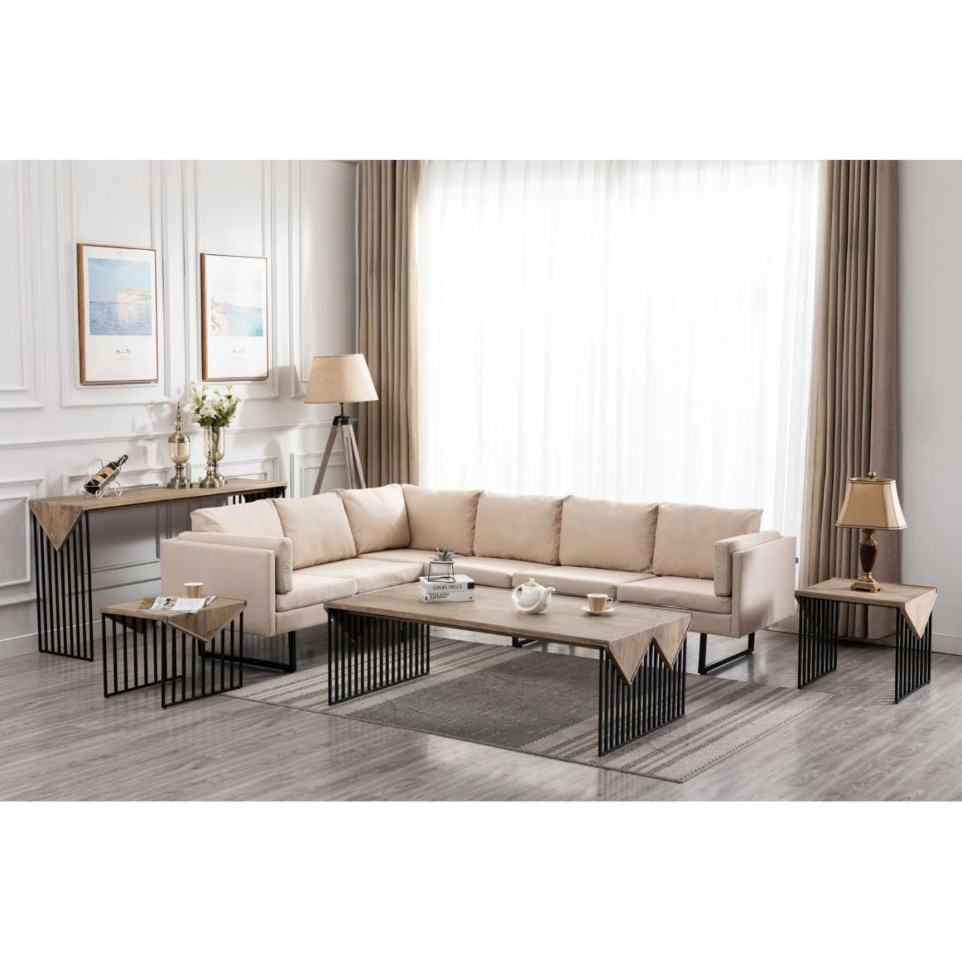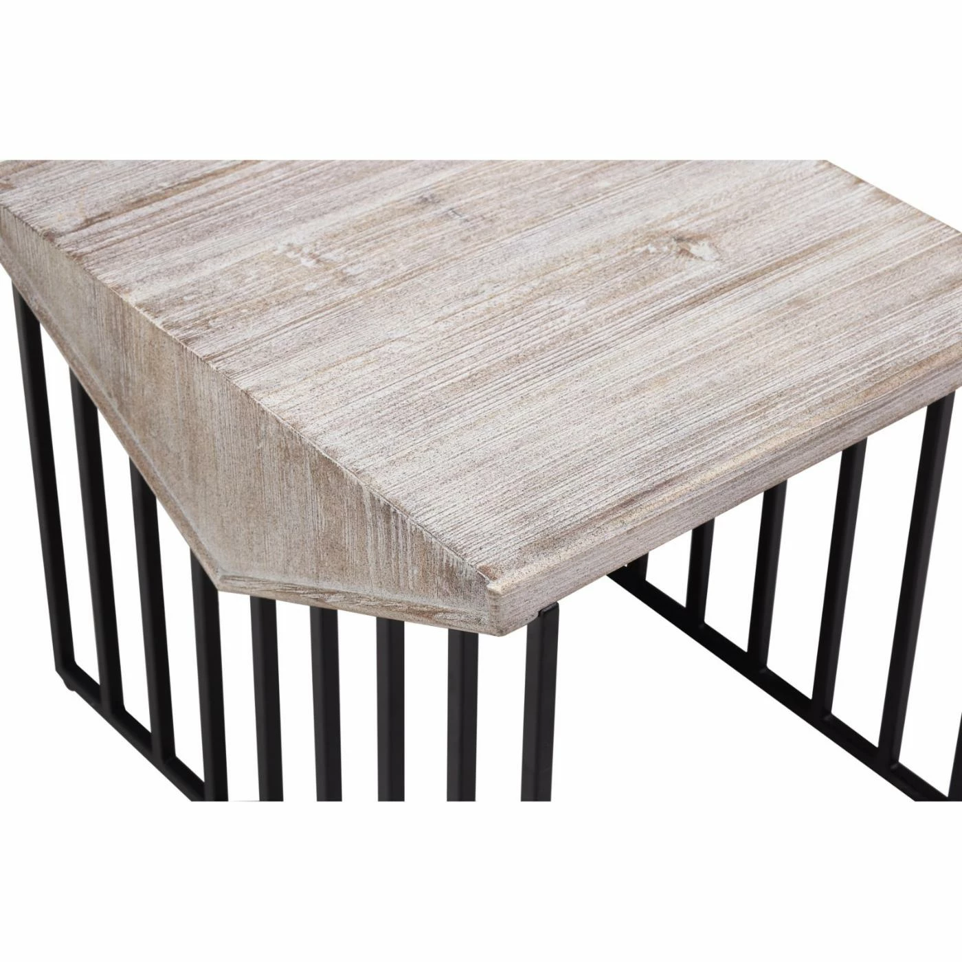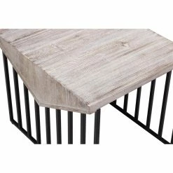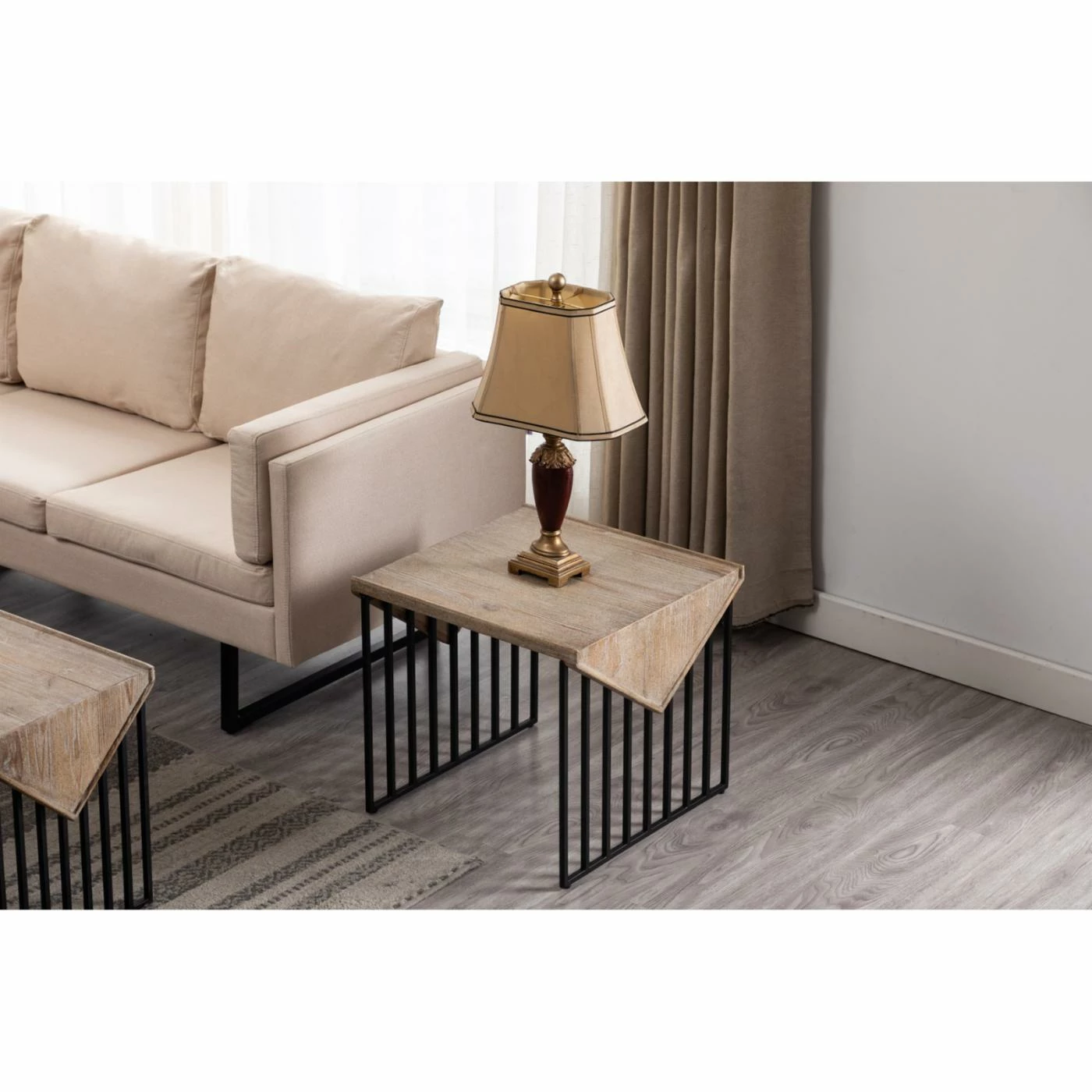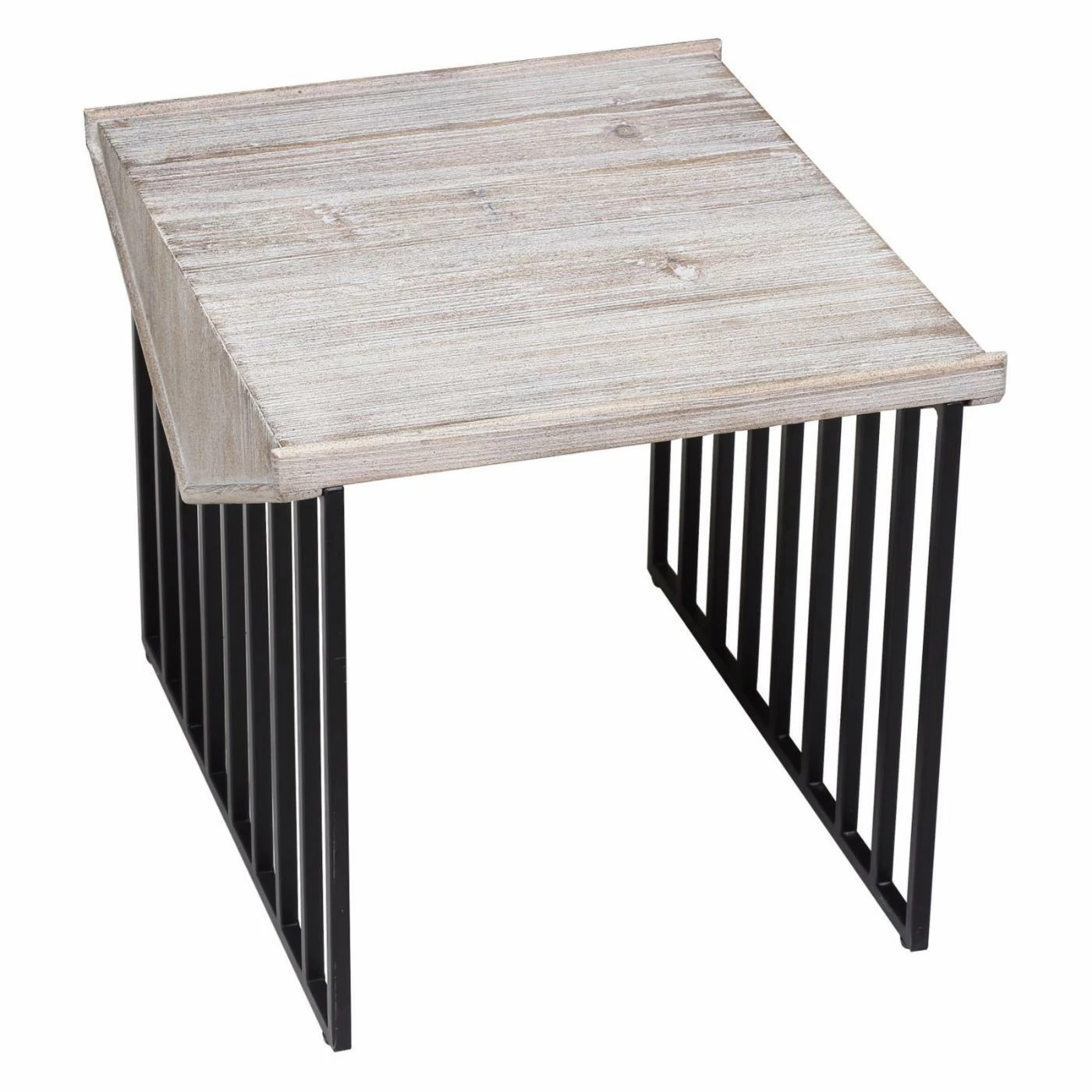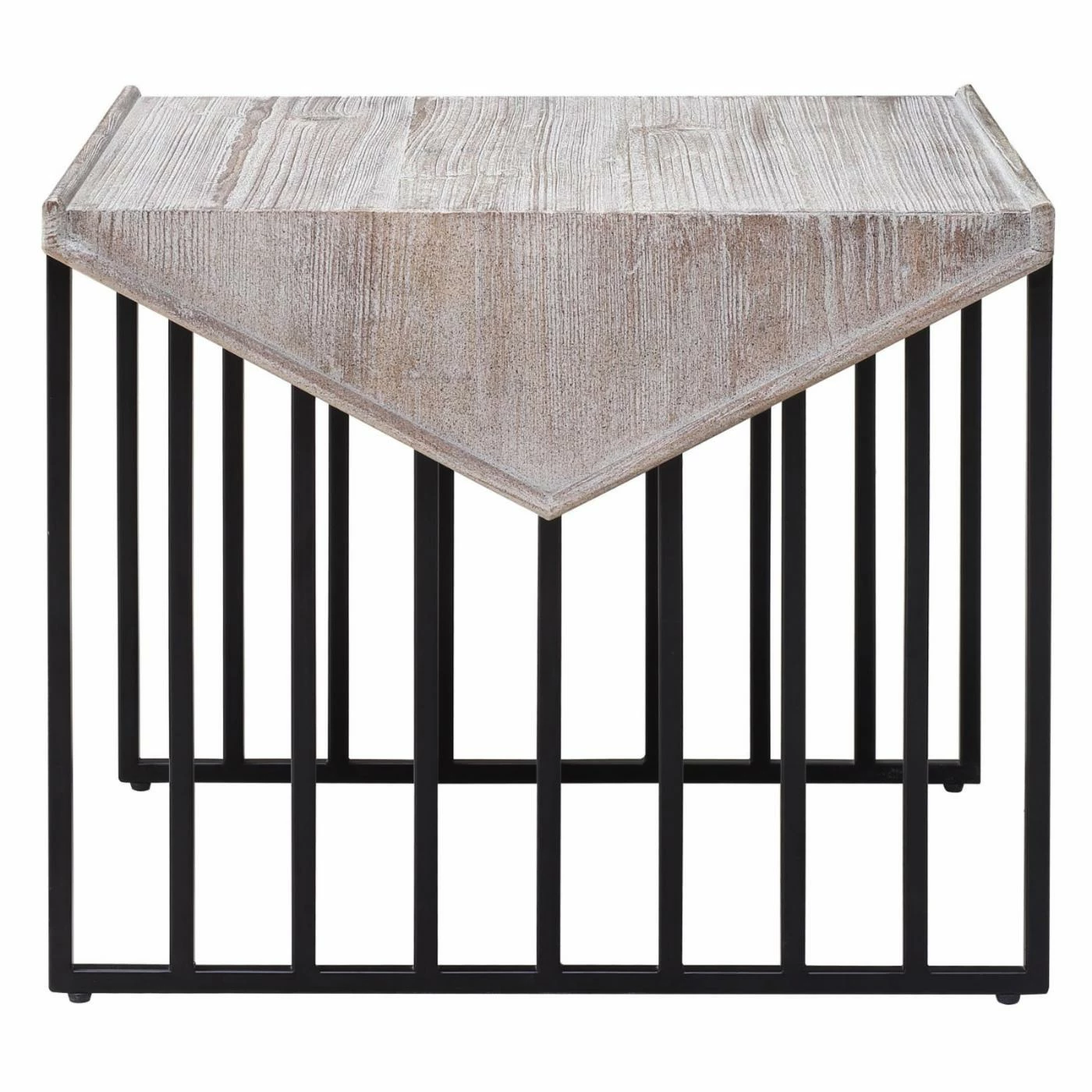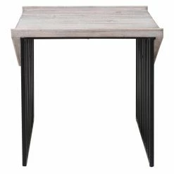 The architecturally inspired Burnham Home Designs Sandra Corner End Table is full of visual detail to add interest to your space. A black metal base features sled-style slats while the reclaimed pine wood top in a weathered gray finish overlaps each side with a distinctive triangle shape. Choose the size option that best suits your space. Pair with other items in the Sandra collection to complete the look.