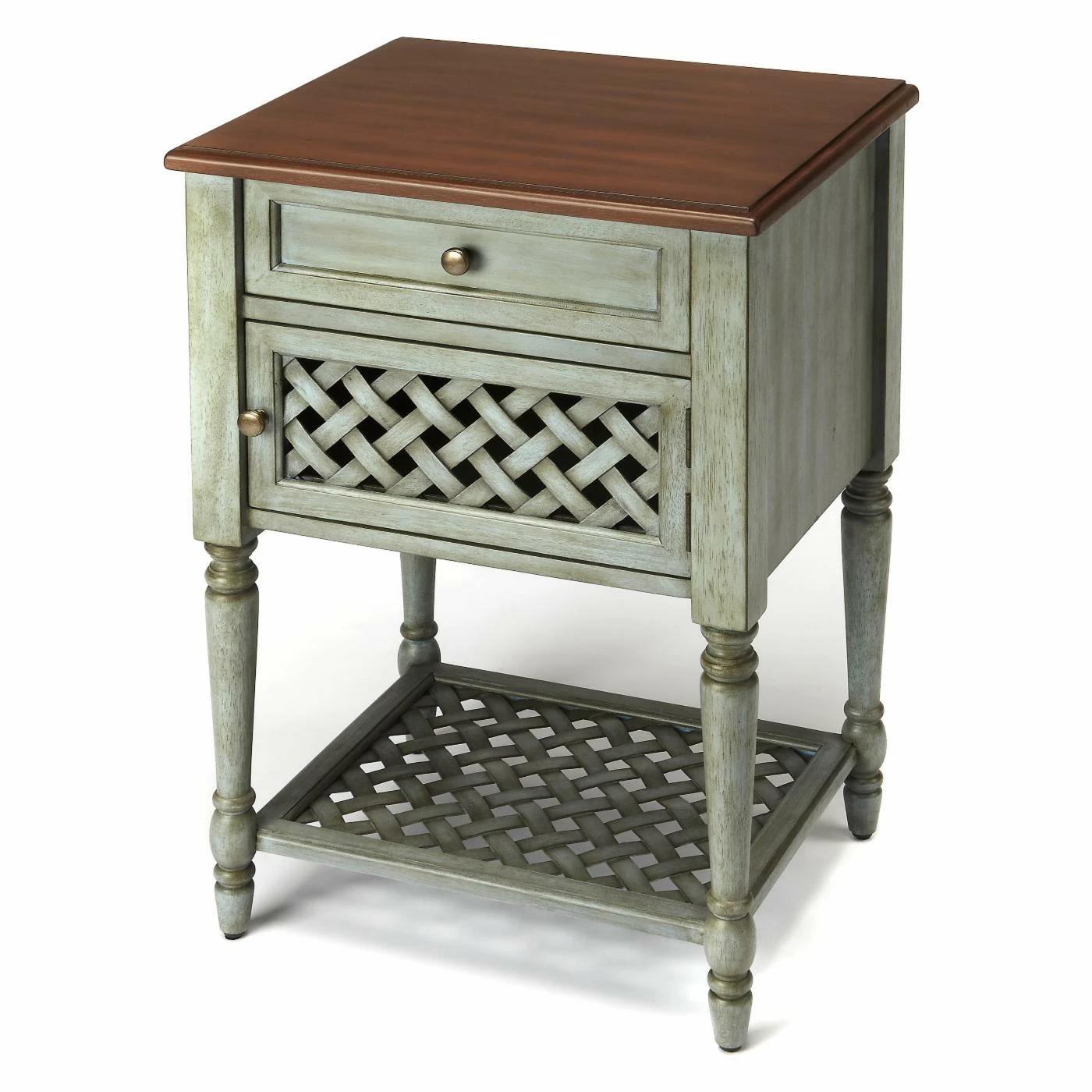 Add country-chic style to your bedroom or living room with the Butler Specialty Chadway End Table. Made from select hardwoods, this end table boasts a two-tone finish in distressed blue and mahogany to lend it an antique appearance. The lower door front and shelf feature a lattice design that adds to its country charm. Brass hardware is used to outfit the top drawer and cubby.