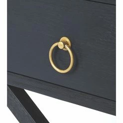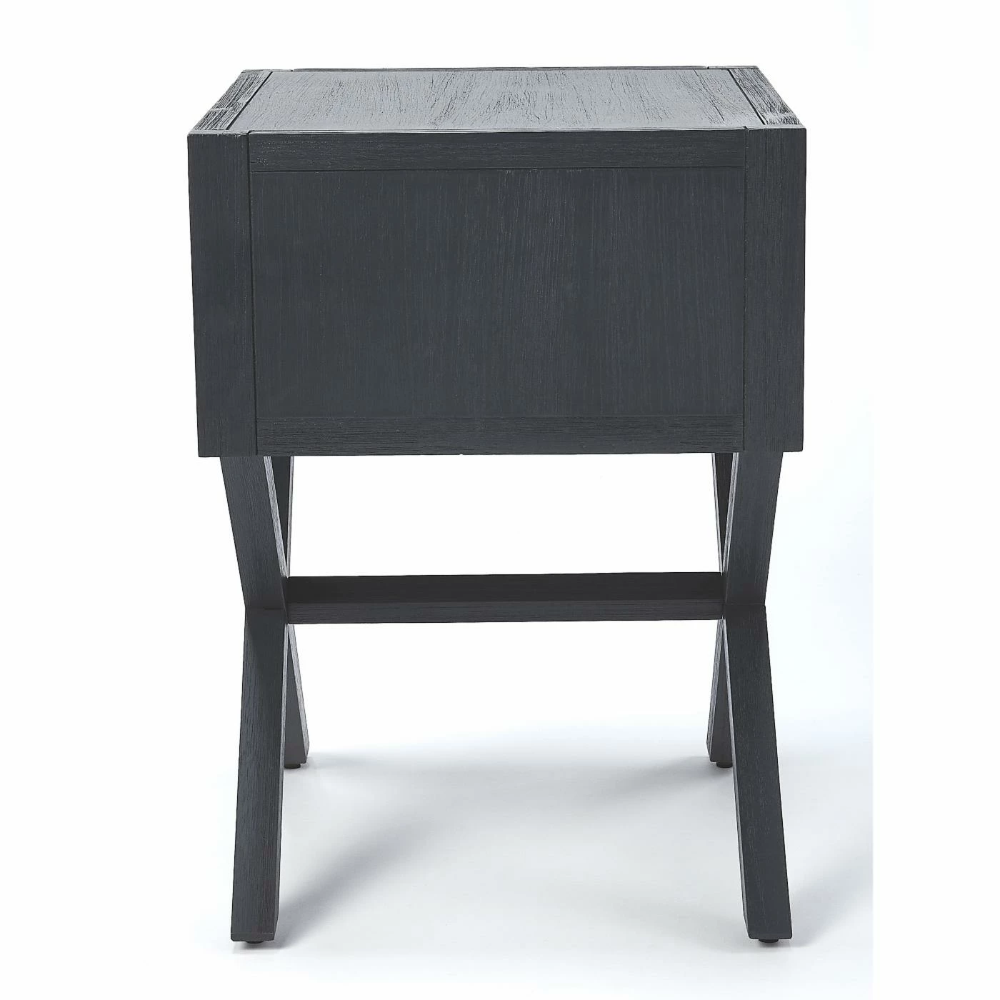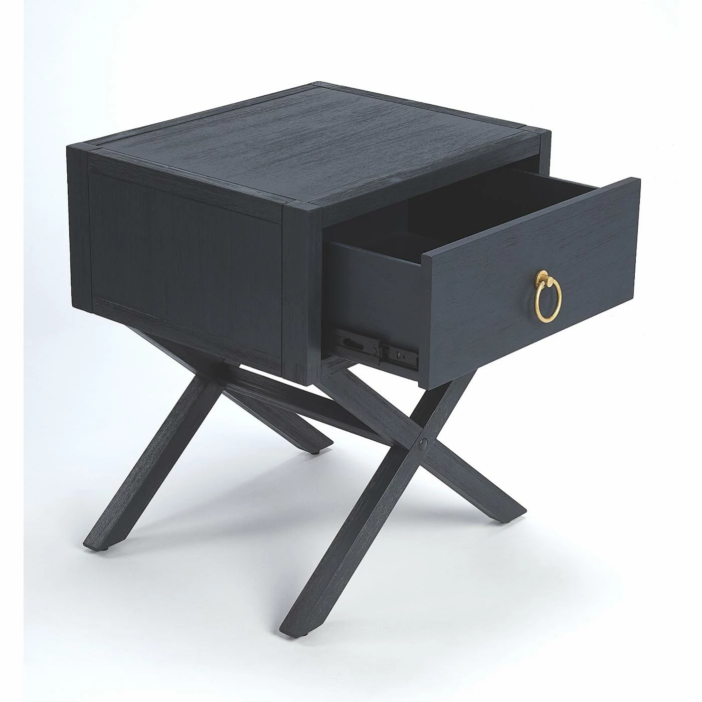 The X design base on the Butler Specialty Lark Cross Leg End Table provides a unique look for your living room or bedroom. The dark blue finish allows the gold finished steel round handle to stand out. Store a number of small items in the spacious single drawer. This end table is constructed from acacia and engineered wood with acacia veneer.