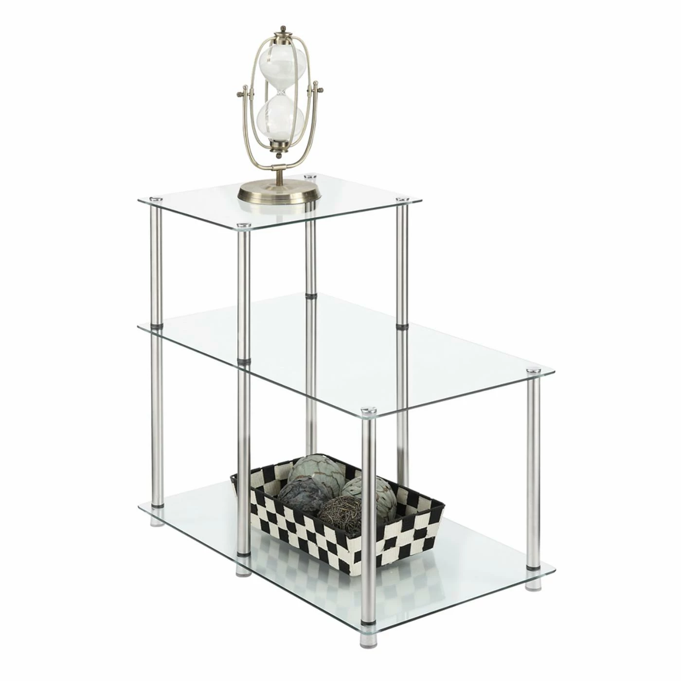 The Convenience Concepts 3 Tiered Glass Step End Table looks incredible next to your couch or bedside with a step-style design and 3 roomy open shelves. This modern end table has stainless steel legs with a sleek chrome finish and clear tempered glass shelves to bring it a contemporary enhancement. With plenty of room to display collectibles or books, this durable table is a smart choice to update your home.