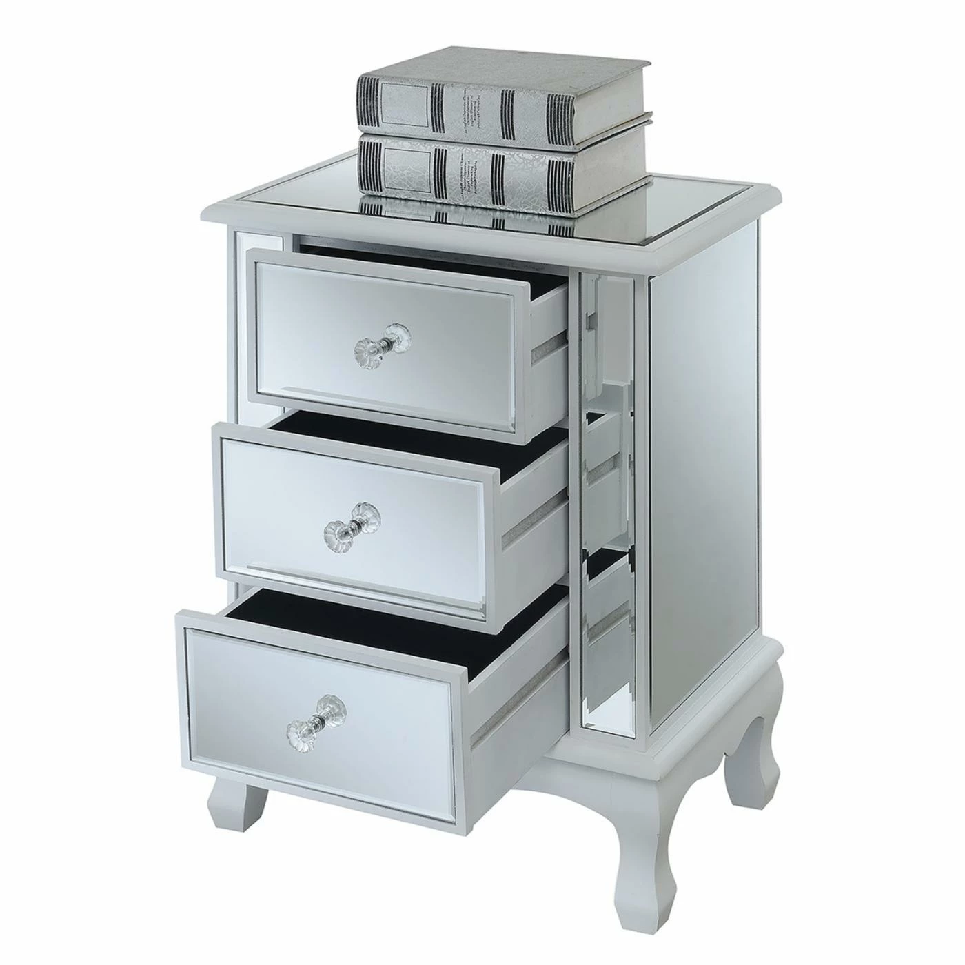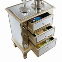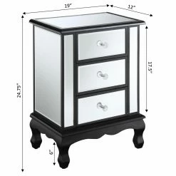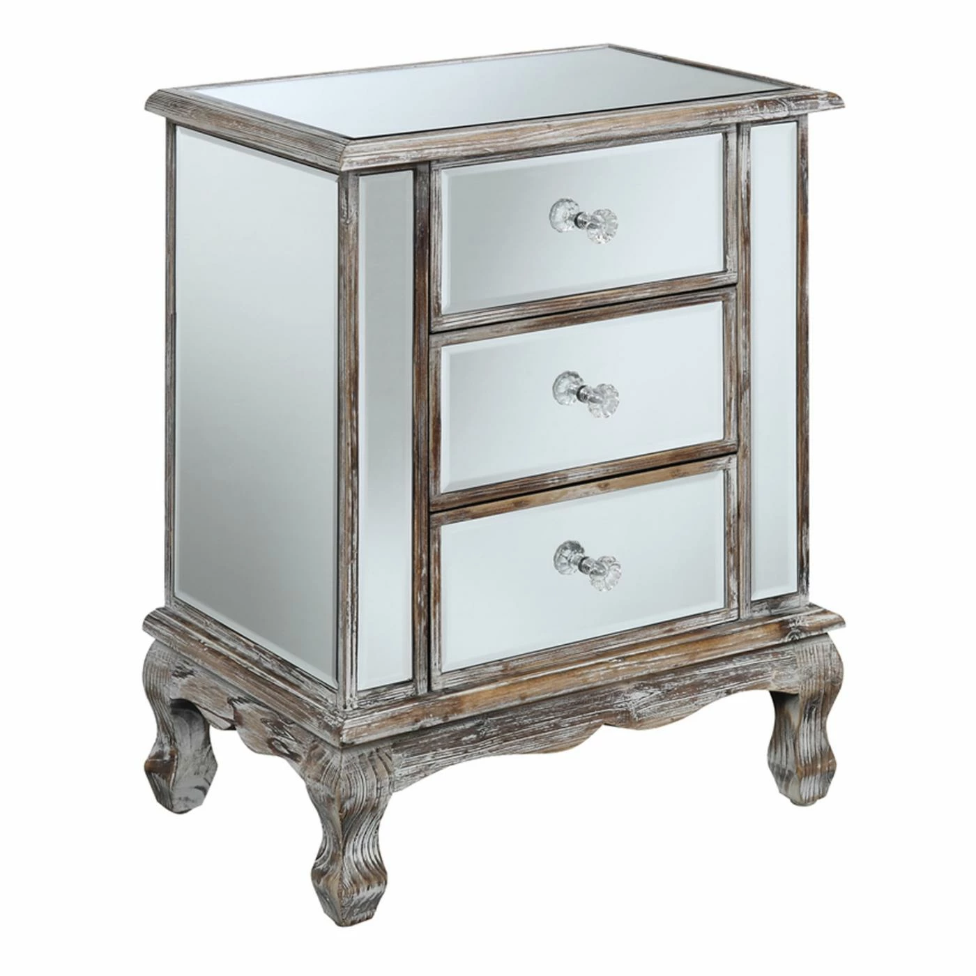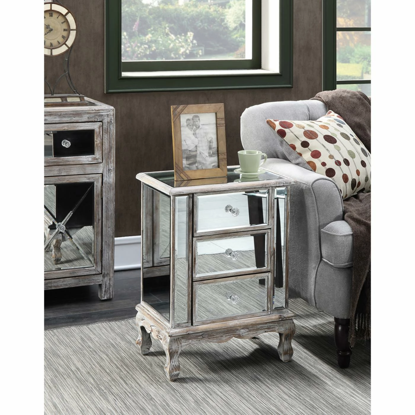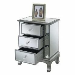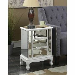 Get ready to wow your guests with the Convenience Concepts Gold Coast Vineyard Mirrored End Table featuring reflective mirrored panels on the top, sides, and front. This incredible end table has three drawers for roomy hidden storage. The piece is presented on sturdy turned legs and the wood frame is available in your choice of weathered finish.