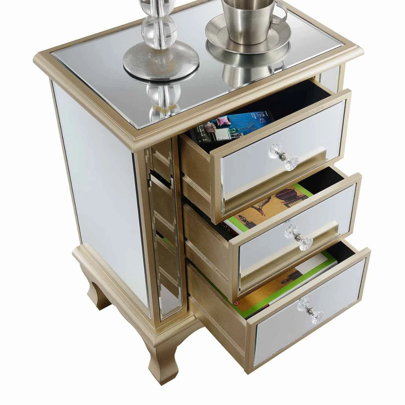 - Mirrored panels add a glamorous look