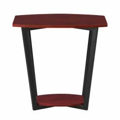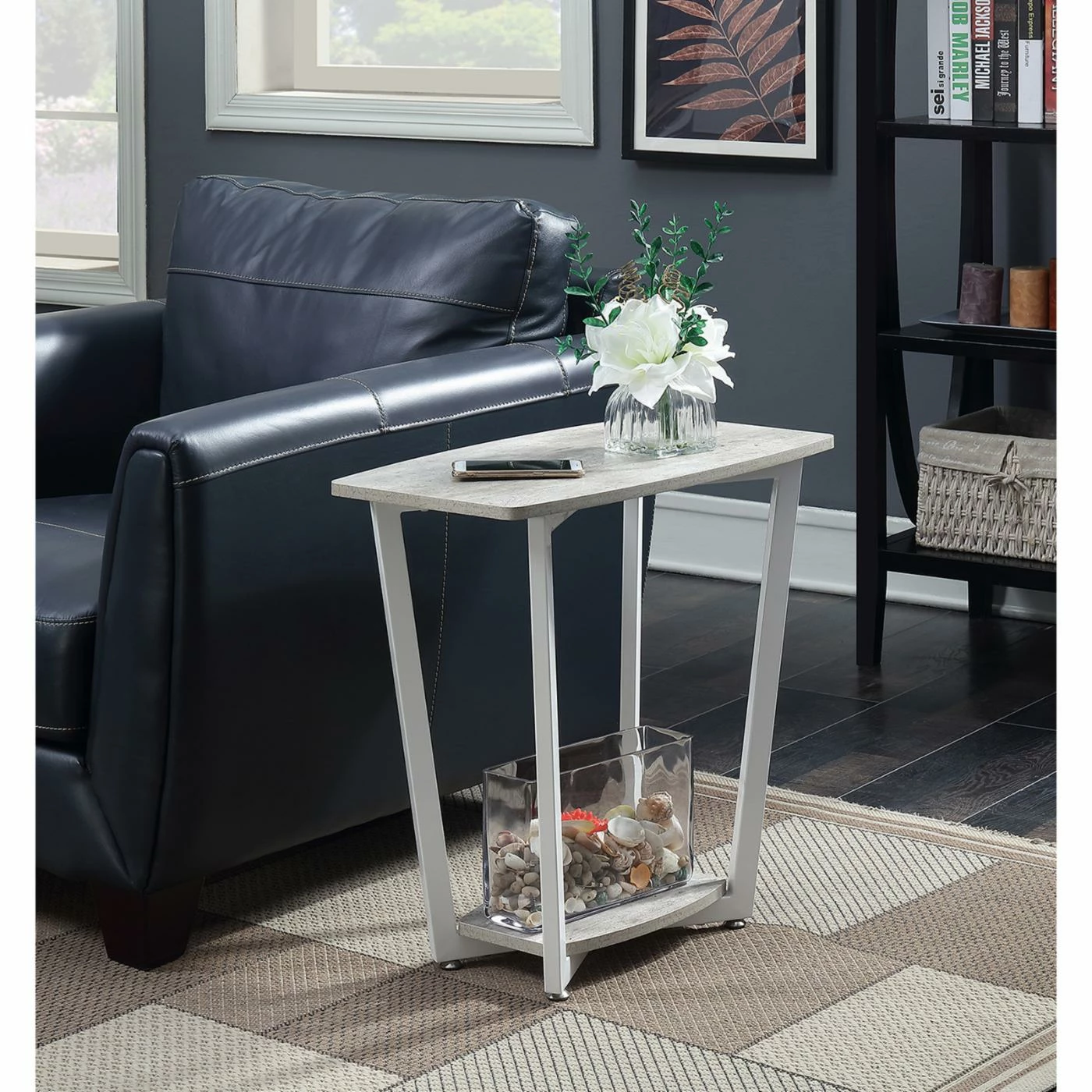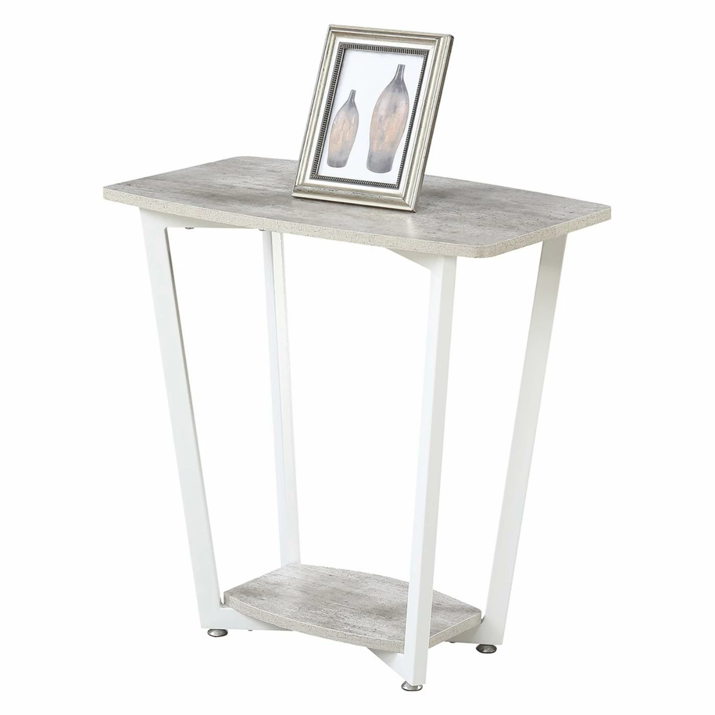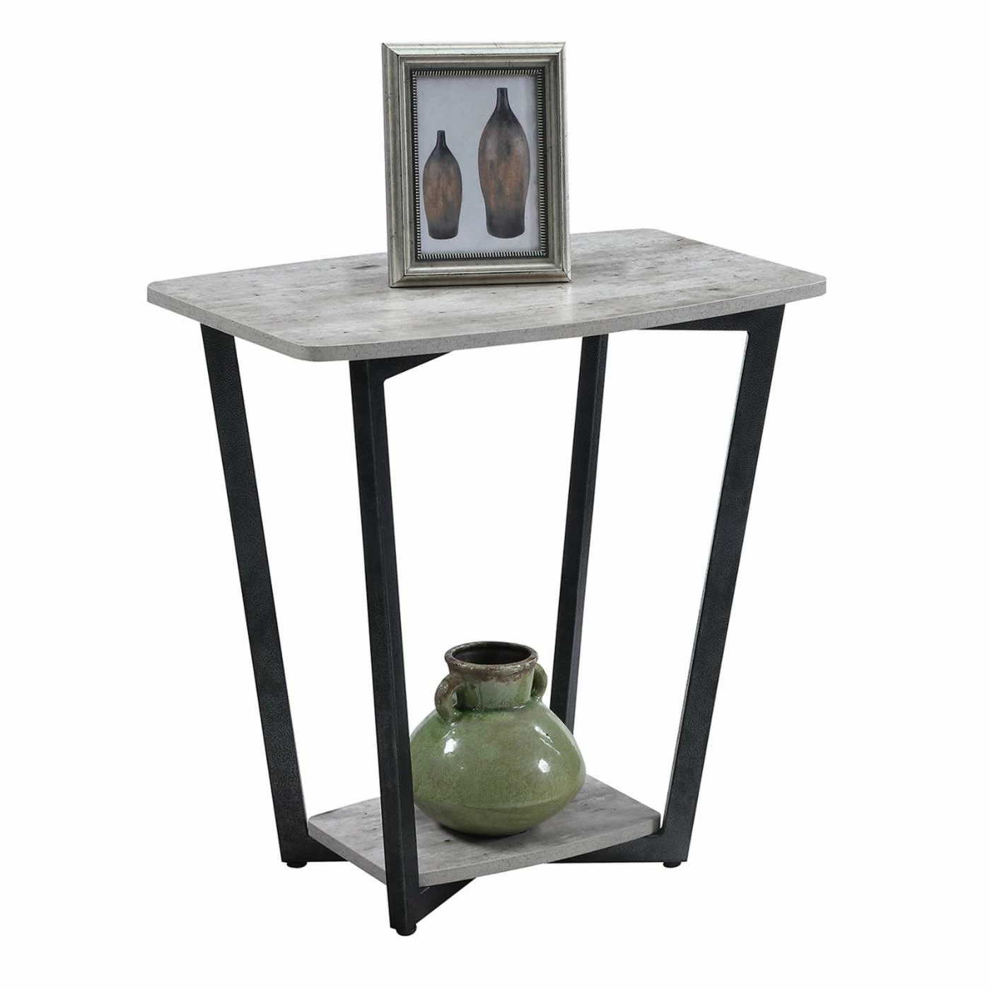 Add chic style to your living room or bedroom with the Convenience Concepts Graystone End Table featuring a unique contemporary shape. This durable end table has a powder-coated metal openwork frame in black that supports a top and bottom platform. A faux birch finish on the surface areas gives it a warm gray, wood grain-like look. Display photos, books, or decorative items on the open bottom shelf while enjoying plenty of room up top to place drinks, remote controls, and more.