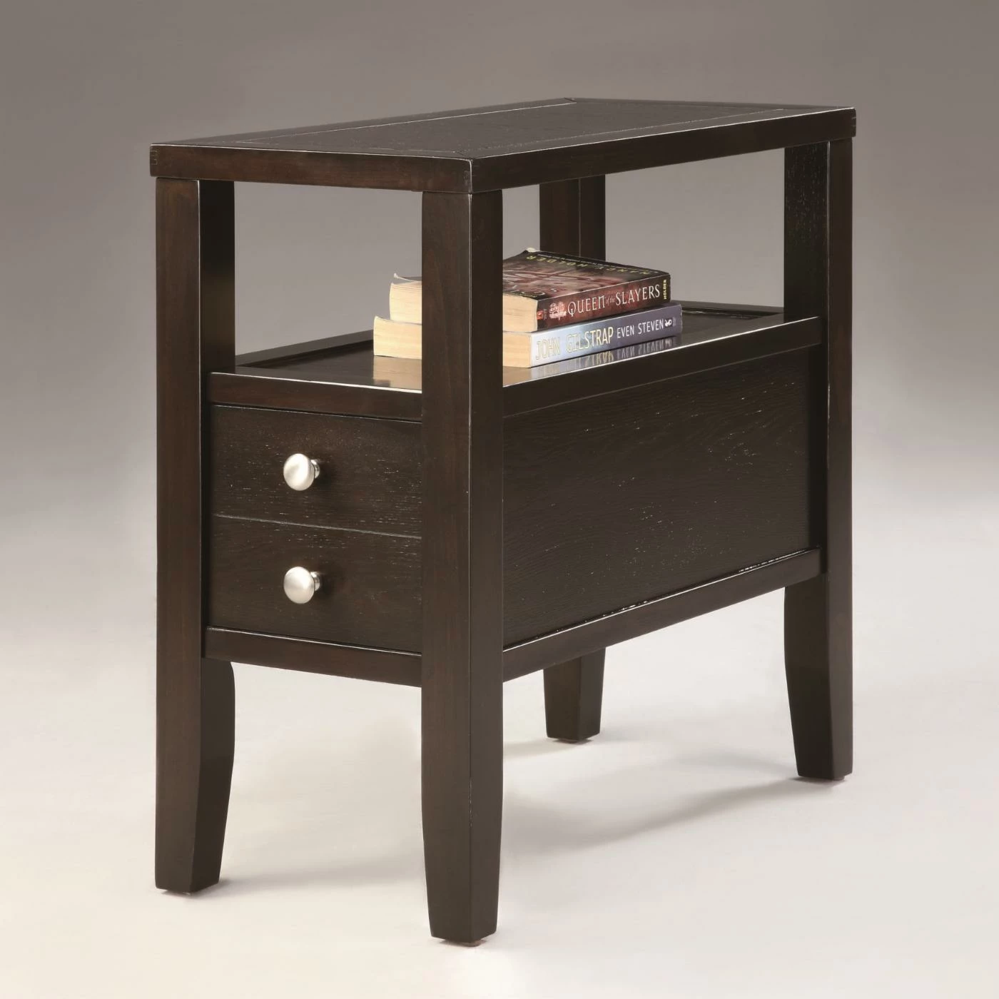 The Crown Mark Matthew Rectangular Chair Side Table with Drawer features a spacious top for you to add a lamp, plant, or decorative items. A single shelf sits in the middle of this side table for even more organizing space. The drawers feature silver round metal drawer pulls for your convenience. The slightly curved legs add interest to this piece. The poplar wood construction of this side table comes in a dark espresso finish.