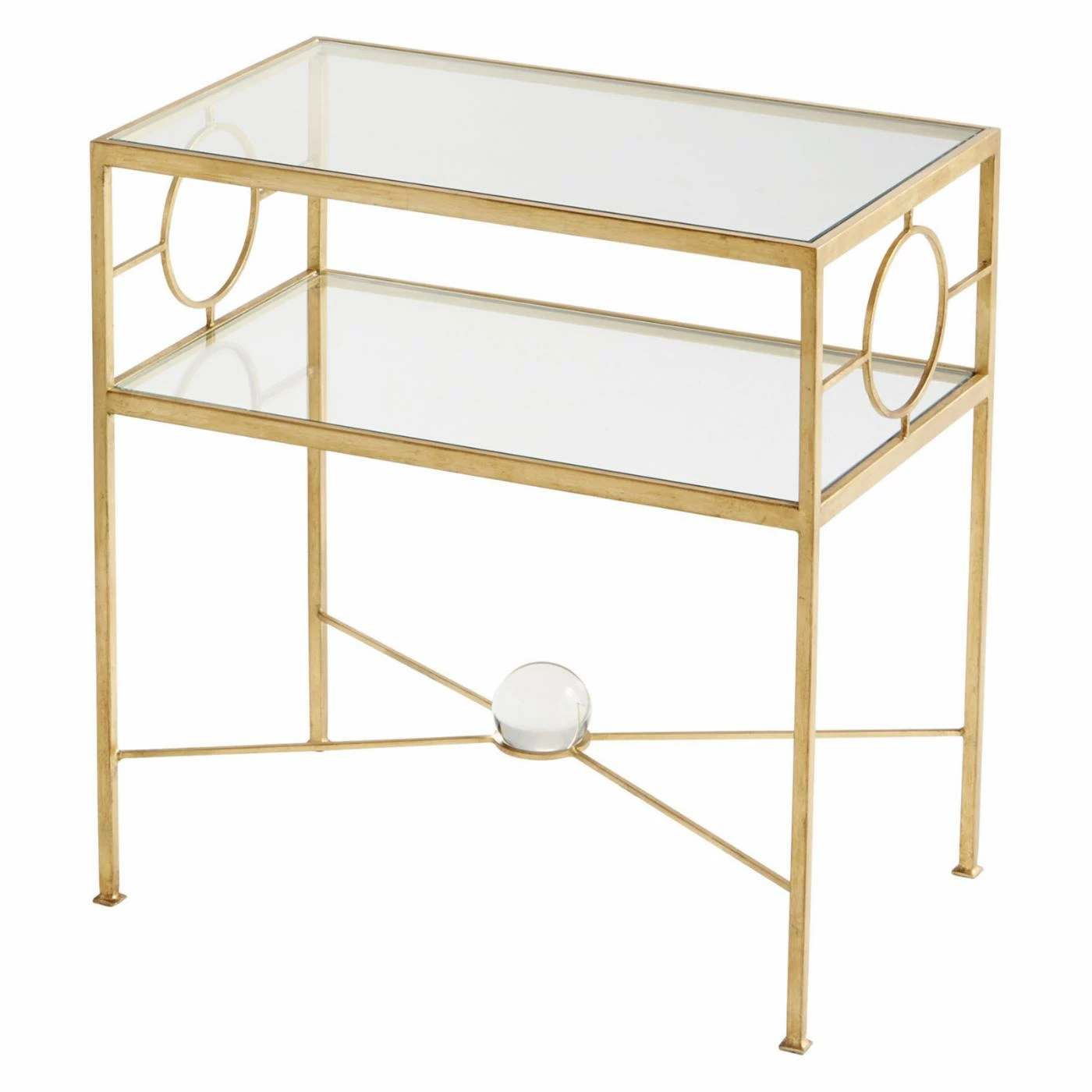 Showcase decorative accents in sleek, modern style with the Cyan Design Auric Orbit Table. A clear glass shelf gives you a place to flaunt sculptures, vases, and other home décor, and you can see whatever you display through the clear glass top. For a touch of mystery, the crisscross stretchers of the gold-leafed iron base meet at a glass orb finial. Circular metalwork on the ends of the table echo its shape.