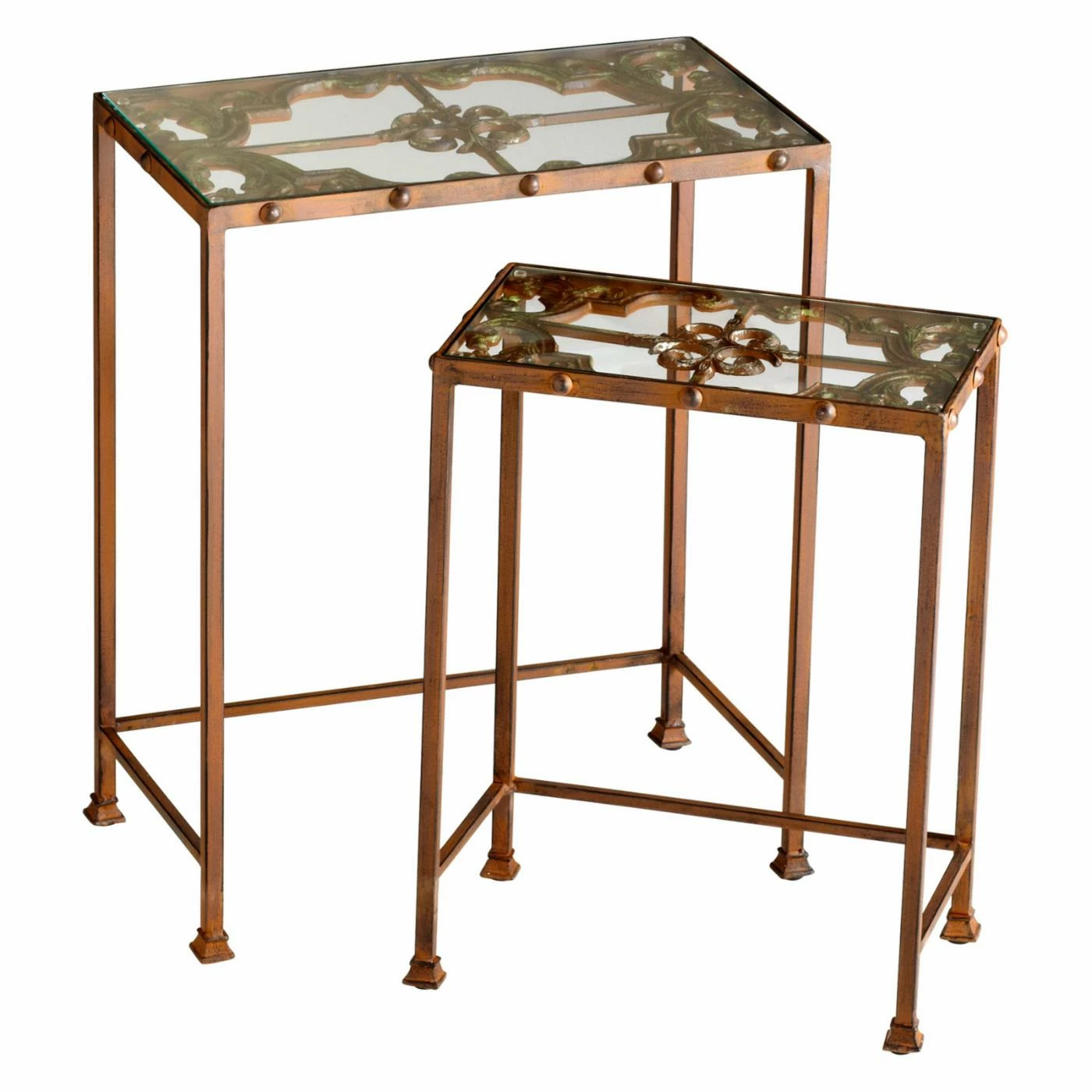 Beautify your seating area with the opulent Old World design of the Cyan Design Gunnison Nesting Tables. The small and large tables feature rusted bronze iron bases with intricate scrollwork tops. Clear glass allows you to easily admire the ornate detail of the ironwork.