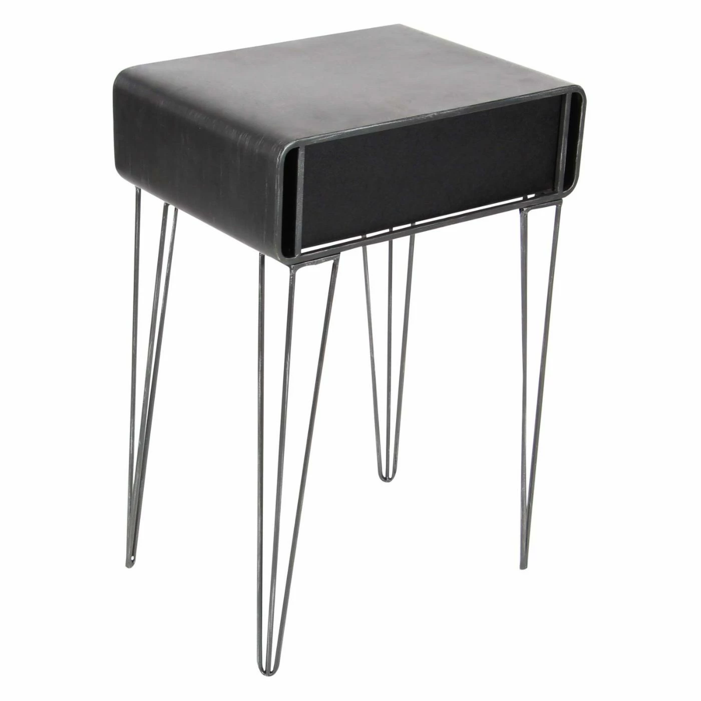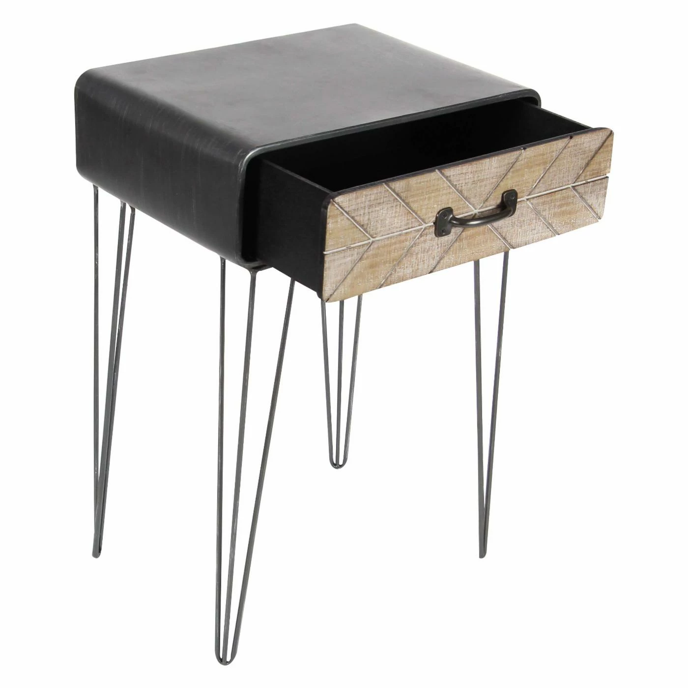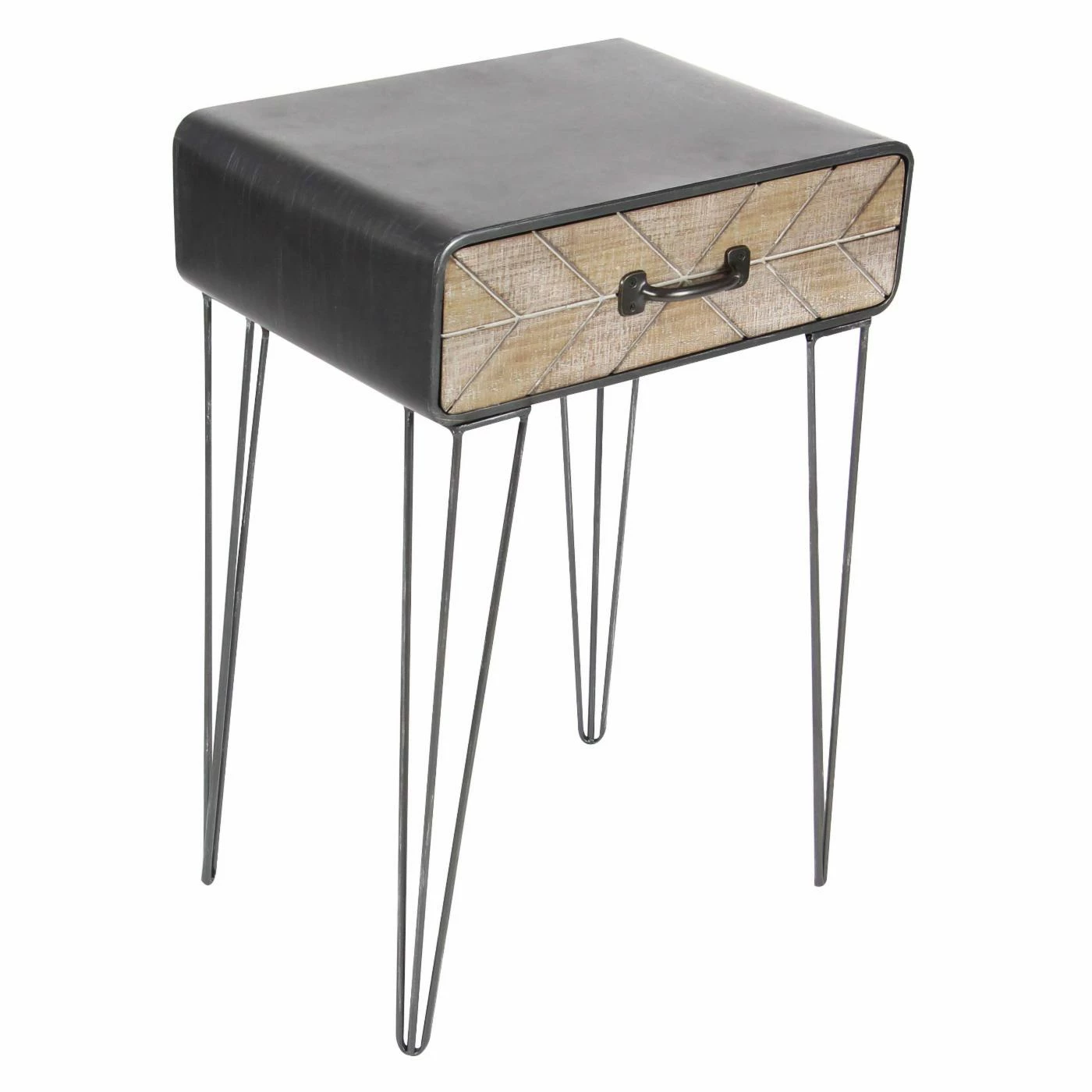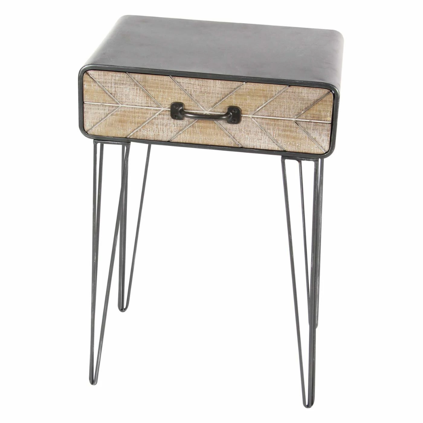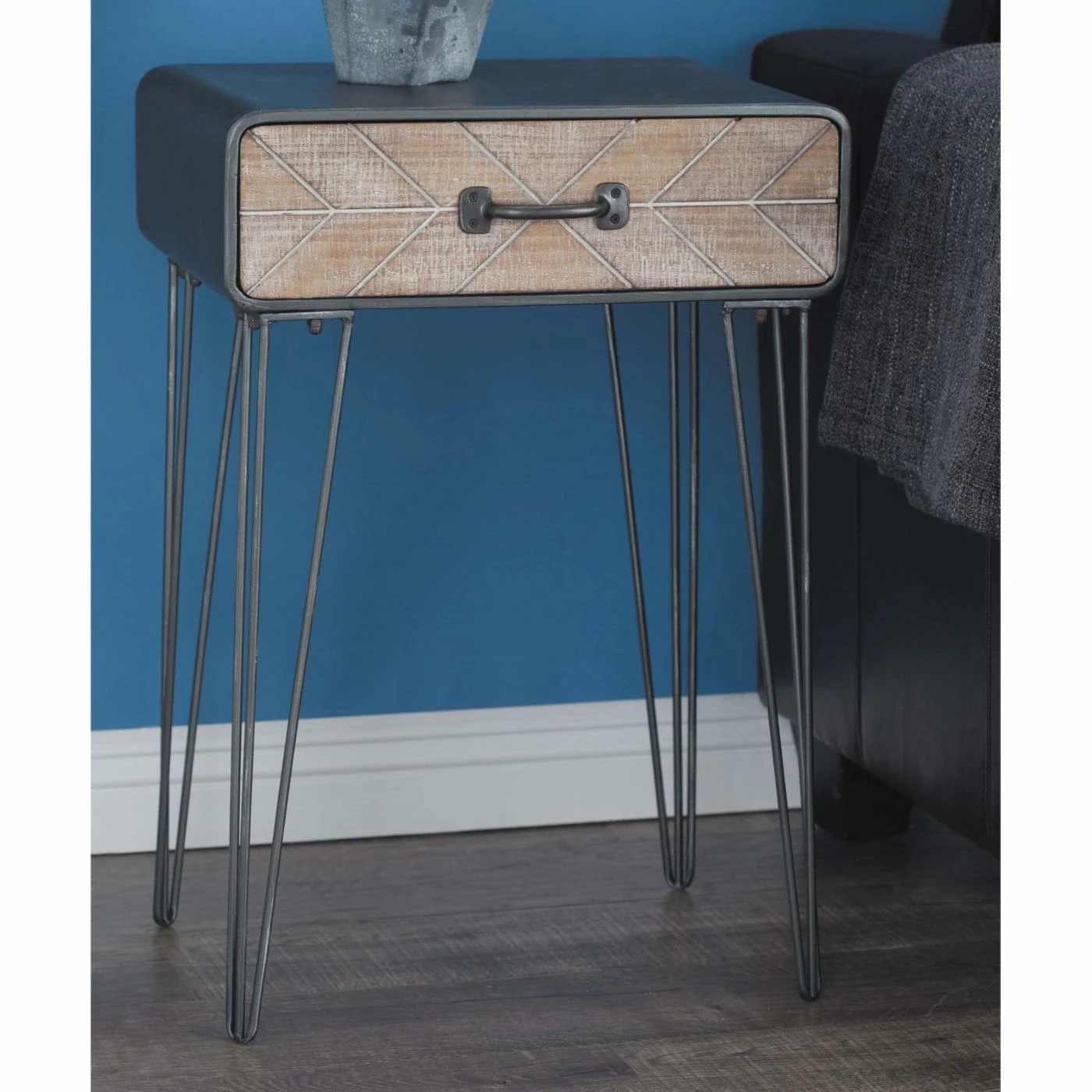 Mix modern and rustic dΓ©cor with the DecMode Chevron Drawer End Table. Crafted from engineered wood, this end table features a flat top to display photos and accent pieces, and a drawer underneath to store your personal items. The drawer is decorated with a chevron pattern in light brown, while the body and iron legs are finished in sleek silver for a contemporary touch.