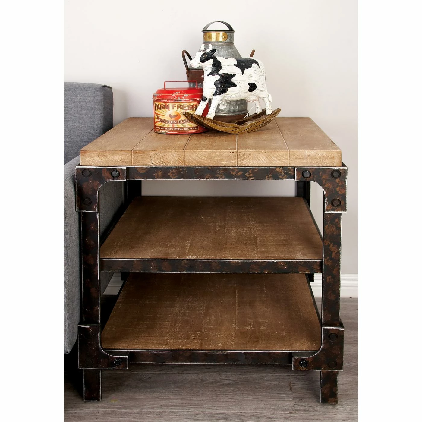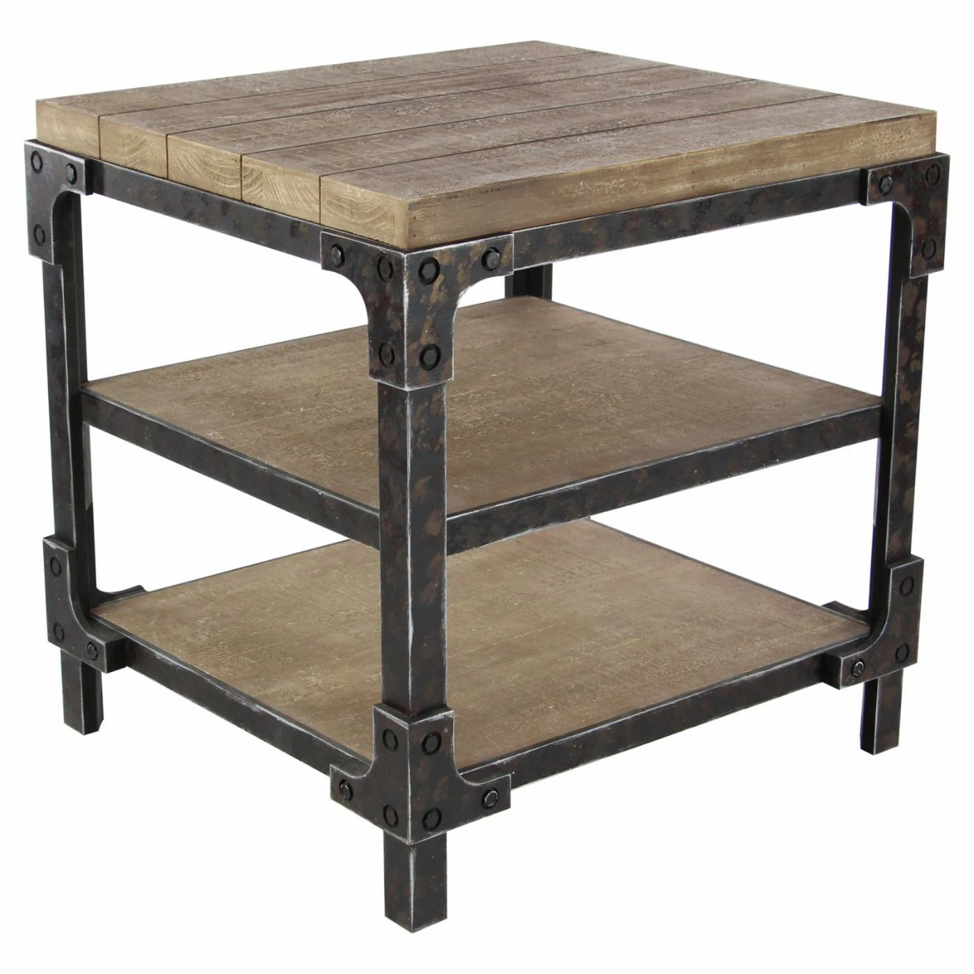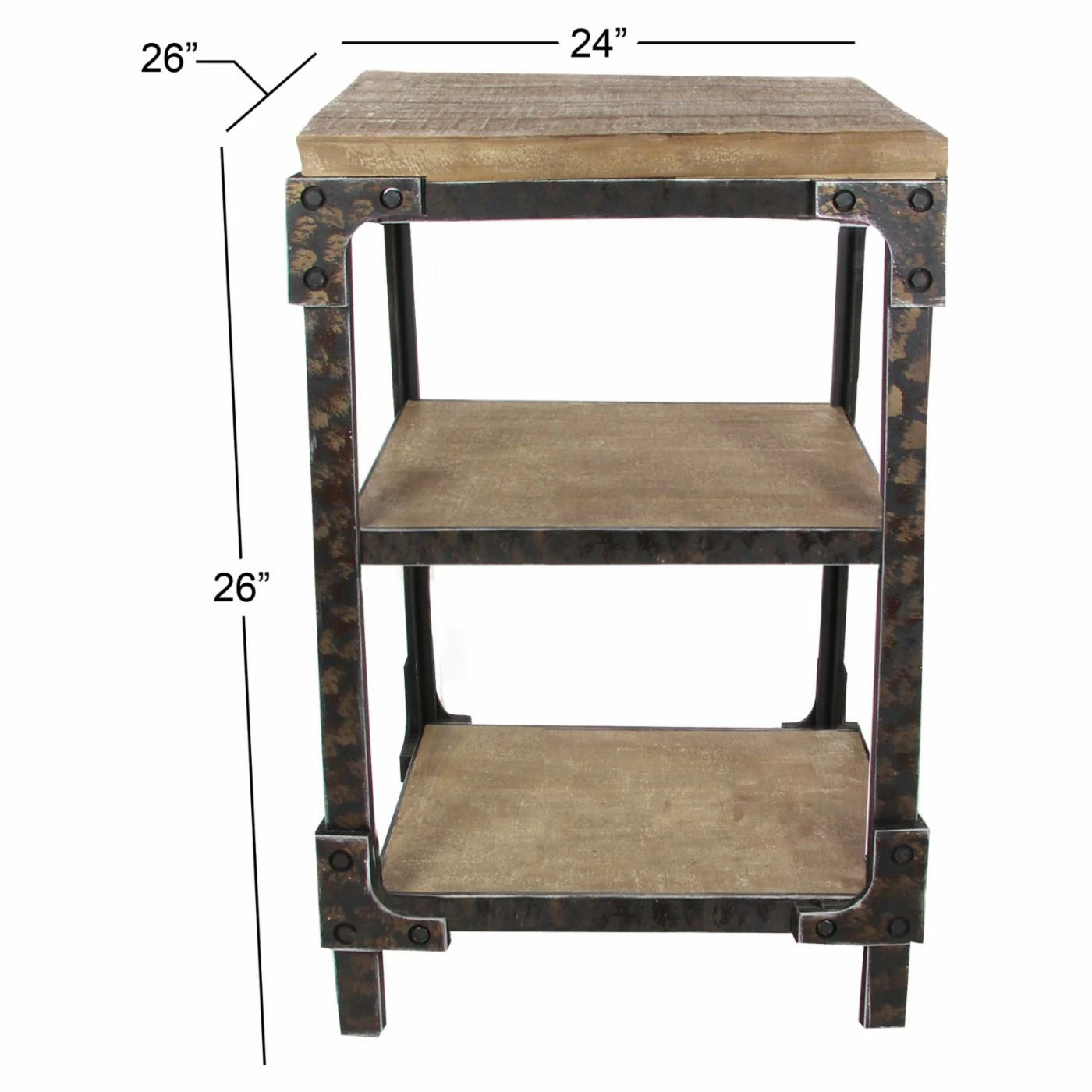 Three-tiered shelves give you plenty of space to store reading material, remotes and more on the DecMode Industrial 3 Tiered Side Table. Rustic iron forms an industrial-styled frame for this table. The shelves are crafted from slabs of Chinese fir and engineered wood. Natural brown finishing completes the look with vintage charm.