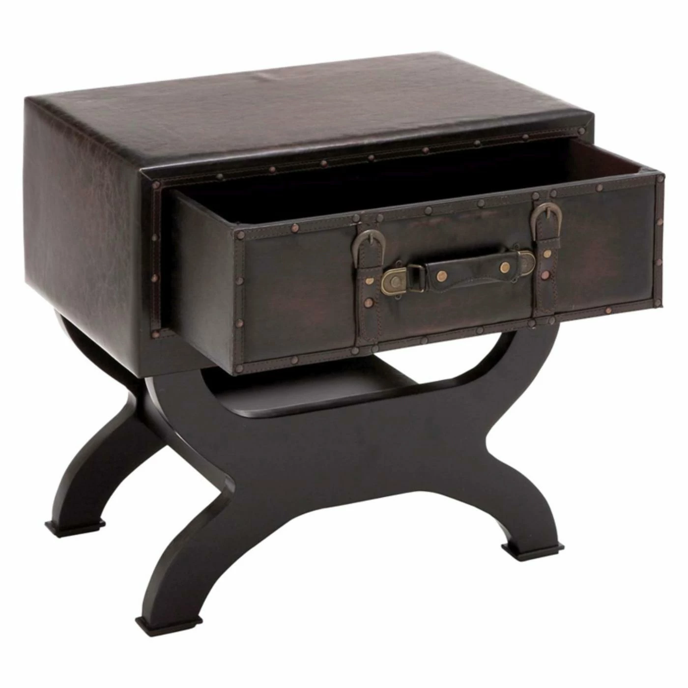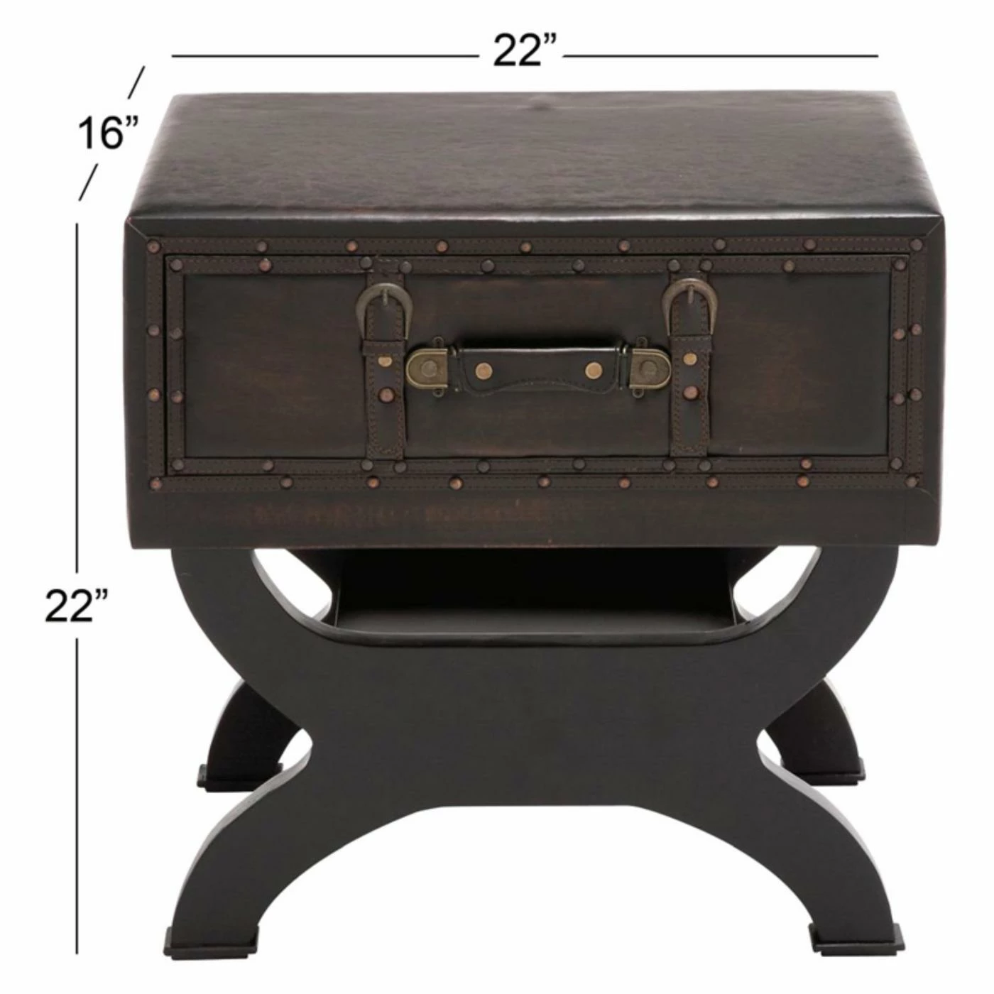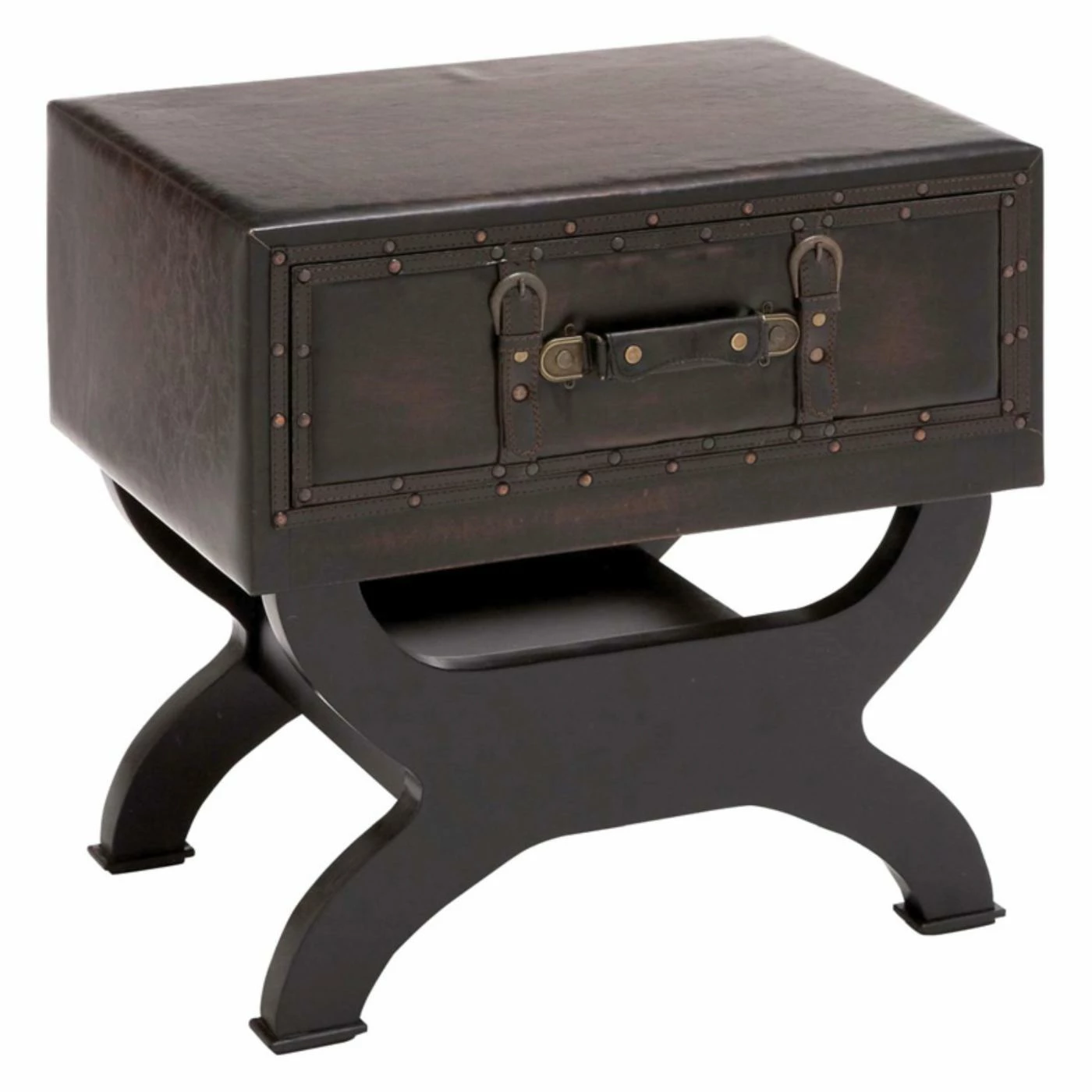 The brown faux leather trunk style top on the DecMode Leather Trunk End Table with Drawer features a single drawer detailed with leatherette straps and buckles. This end table boasts a curvy framework and distressed brown finish.