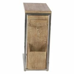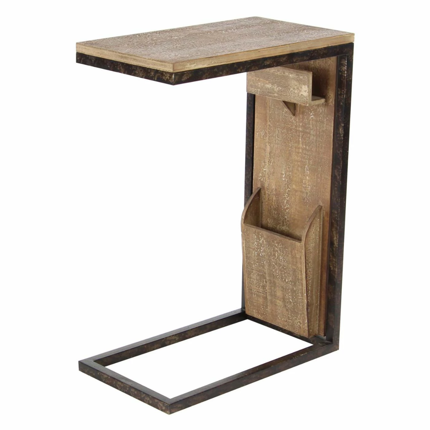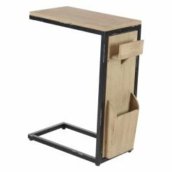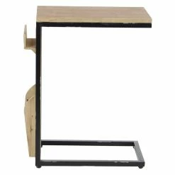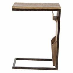 The DecMode Rustic Fir Wood and Iron Rectangular Open Frame C-Shaped Side Table boasts an innovative design and fir wood construction. Two storage slots of different sizes adorn the side, perfect for a remote control and other household odds and ends. Stack books, magazines, and decorative items on top of this side table. Choose from multiple finish options.