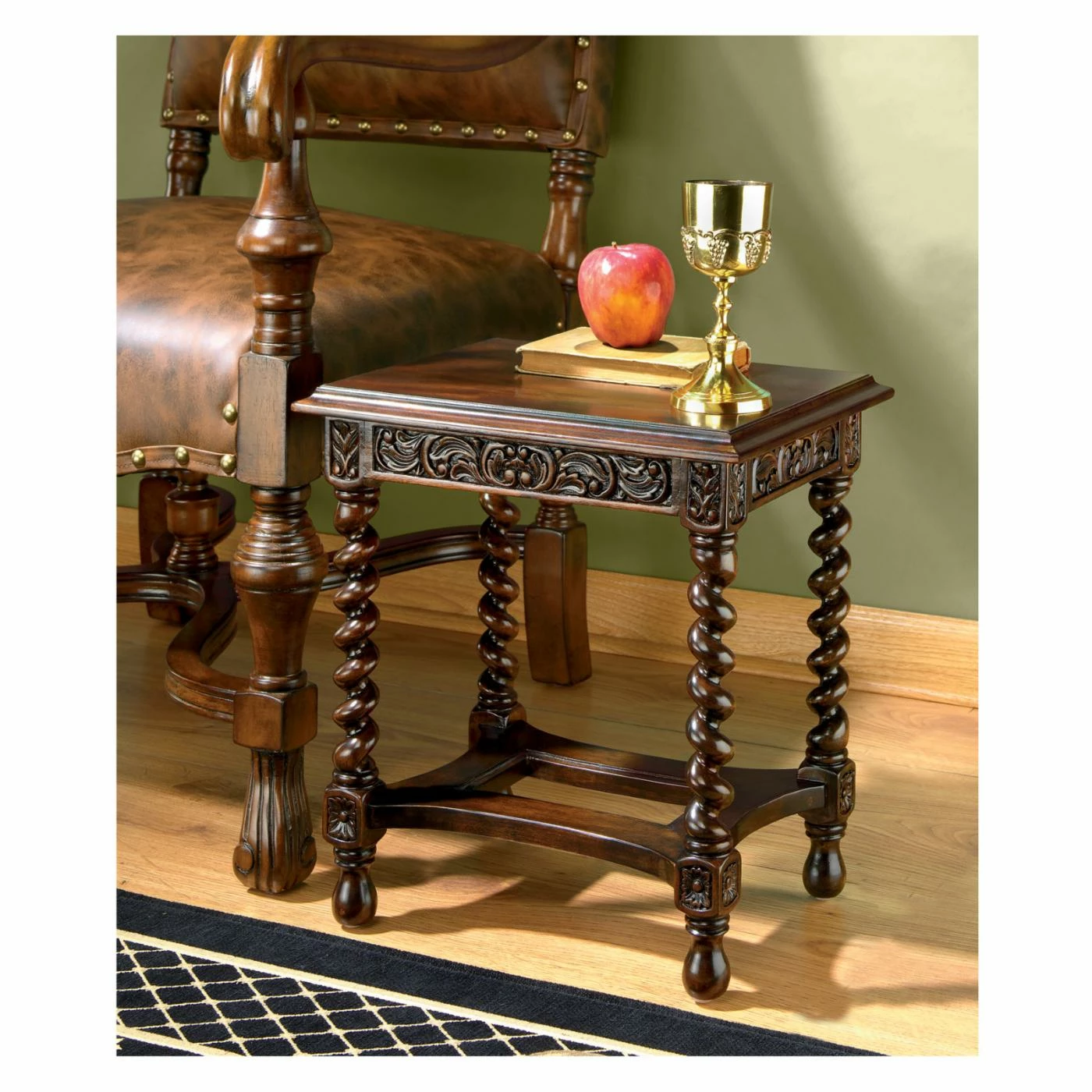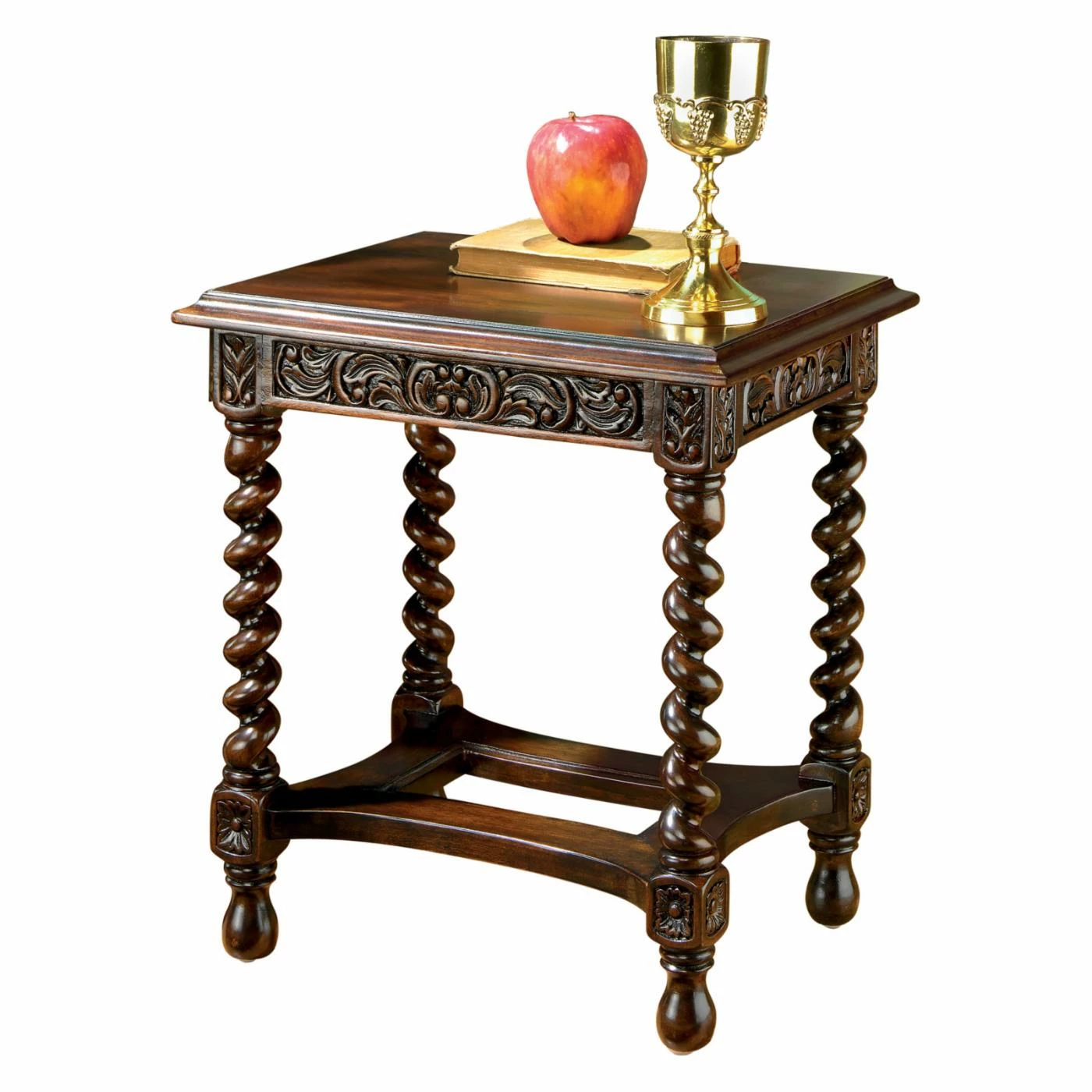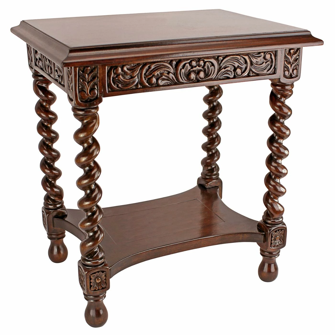 An antique replica, this Design Toscano Camberwell Manor Medieval Petite Side Table is intricately detailed and hand-carved of solid mahogany. Its smaller scale ensures this side table will work in any setting. Its acanthus carved apron gives way to barley twist legs anchored by block and turned joint stops. This side table is truly an artisan piece.