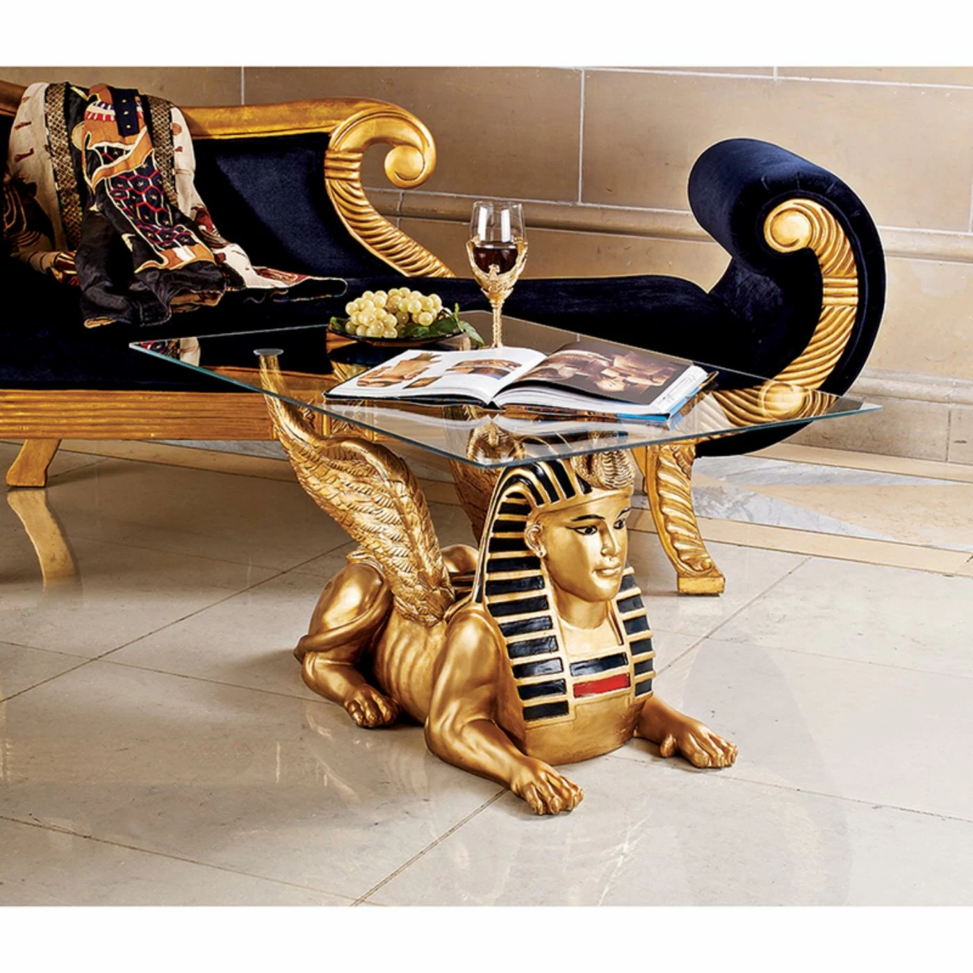 The Design Toscano Golden Egyptian Sphinx Glass-Topped Table is an artistic rendering of an ancient Egyptian artifact. The masterfully detailed sphinx is cast in designer resin and hand-finished in a traditional Egyptian palette, rich with gold and black. A rectangular clear glass top with a beveled edge transforms this sculptural piece into a practical cocktail table.