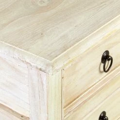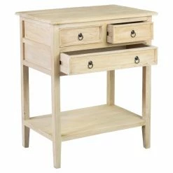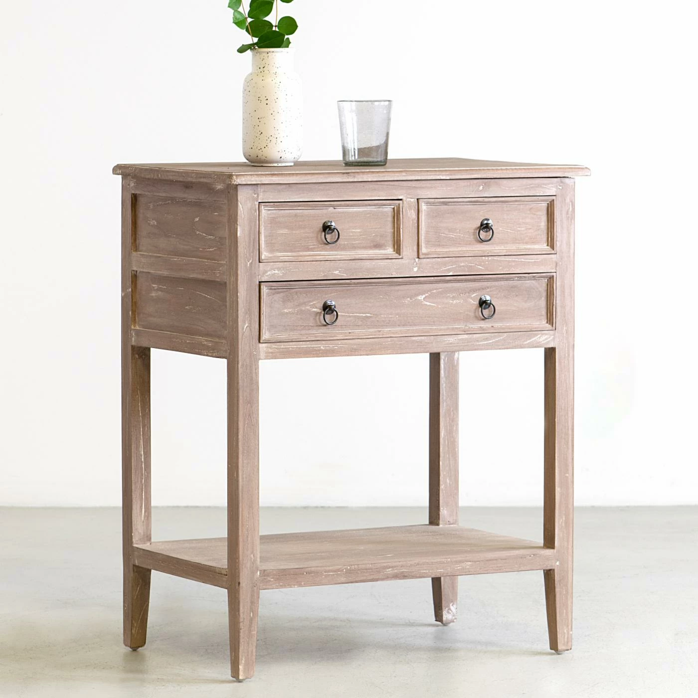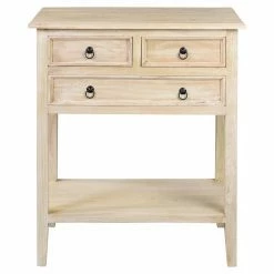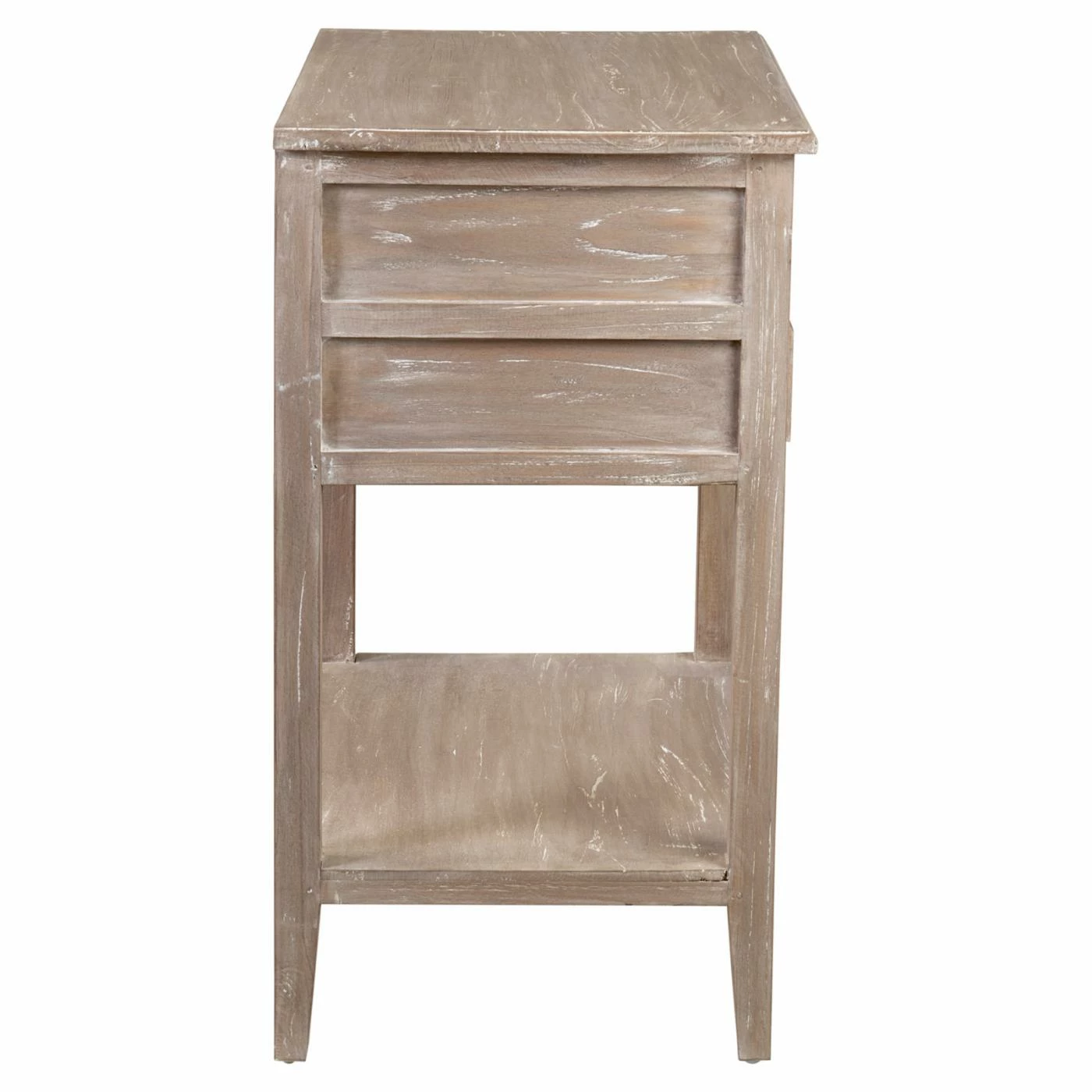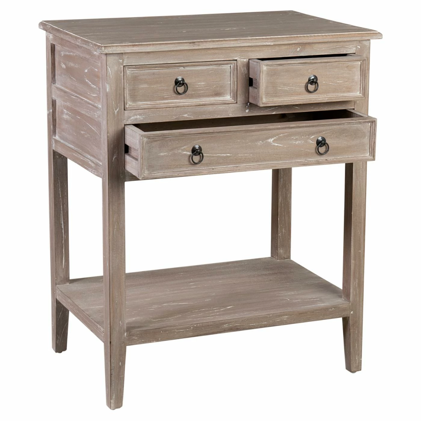 Place the East at Main Eculid End Table in your entryway or bedroom for storage and rustic style. This table is durably constructed from solid mindi wood and covered with a washed grey finish. It’s equipped with two small drawers and one full-length drawer, each with metal ring pulls for opening and closing. For display, it’s outfitted with a lower shelf.