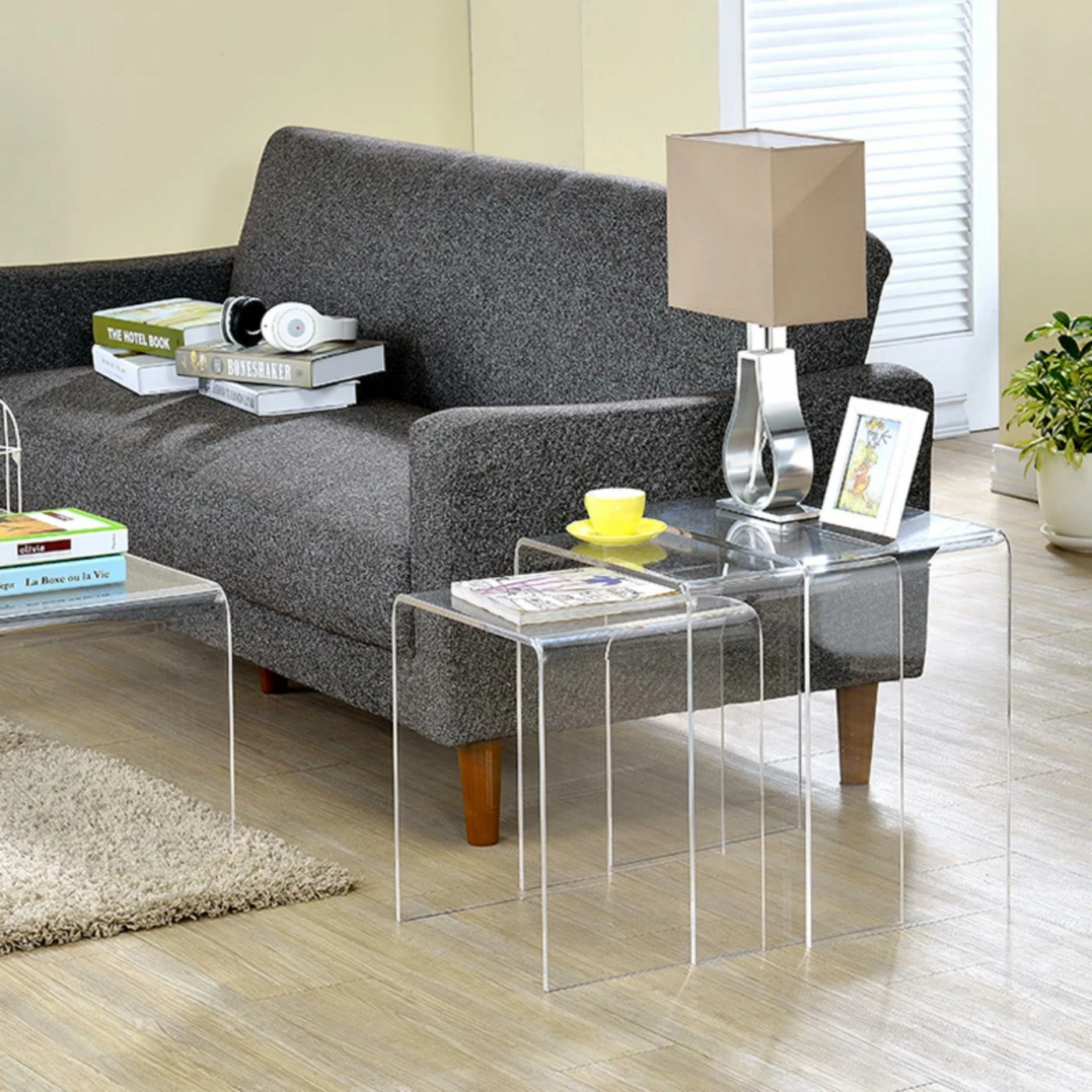 Modern meets functional in the Fox Hill Trading Acrylic Nesting Side Tables -Set of 3. Including three matching side tables, these tables can be nested beneath one another for convenient storage, staggered for a tiered look, or displayed completely independent of each other. Thick, clear acrylic constructs the table, each boasting curved corners and waterfall legs. You’ll find a place for everything on these accent tables. No assembly required.