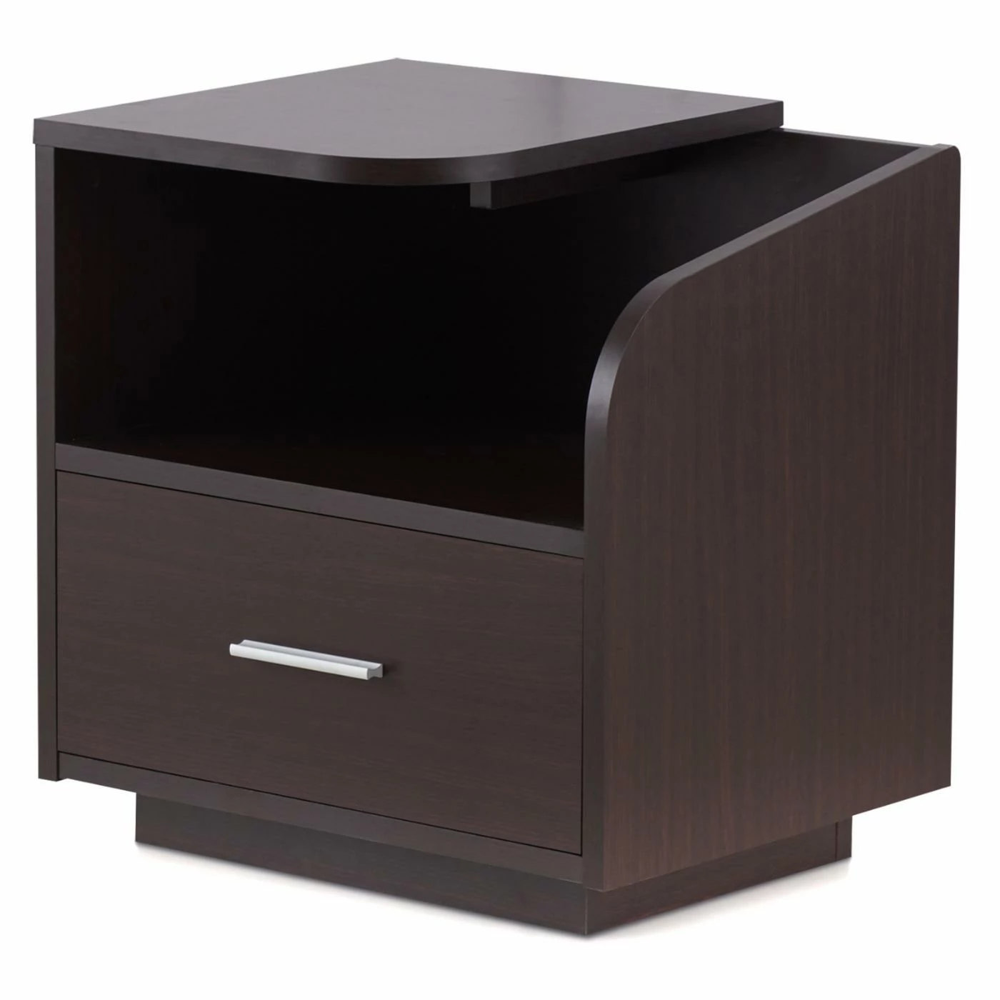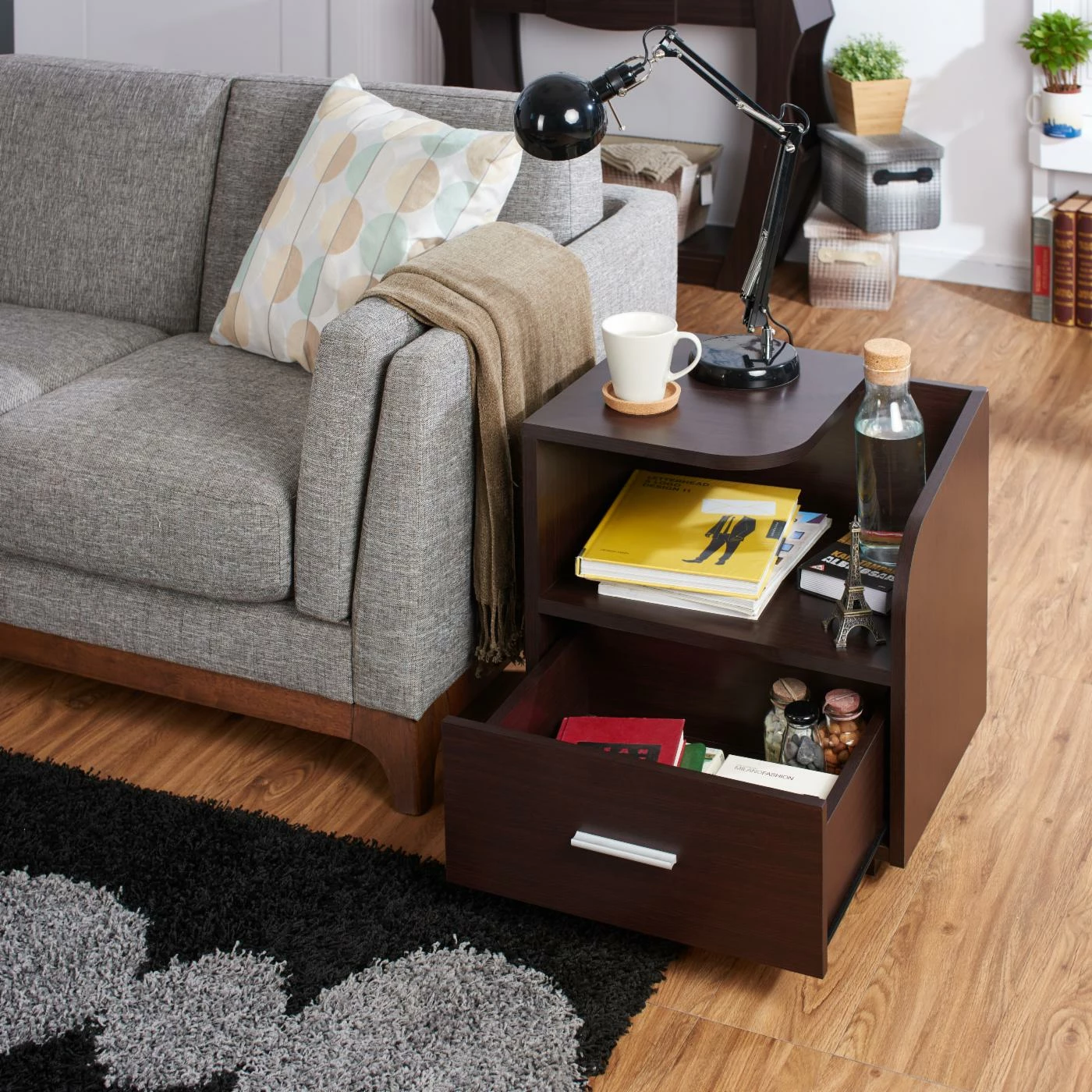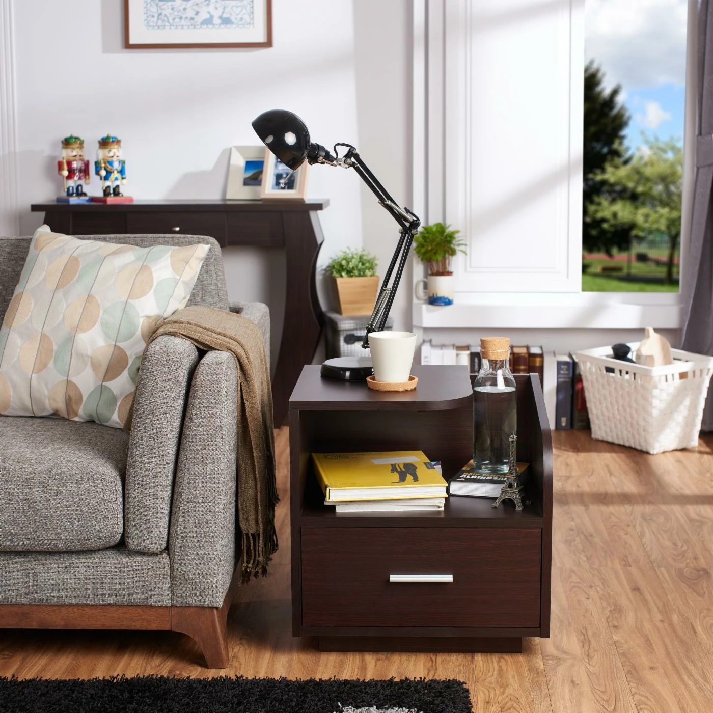 The simple touch of a cut-out from the top makes the Furniture of America Bocha Modern Cut Out End Table into a piece that you can’t help but stare at. It’s okay, take some more time just to look. This contemporary table is crafted from rugged and warp-free engineered wood with a veneered exterior in a rich shade of espresso. The rounded top sits over a roomy space that’s a perfect place to keep a few of those must-have items. Below that is a pull-out drawer that moves on smooth, metal glides, and provides more storage that makes this piece fun as well as functional.