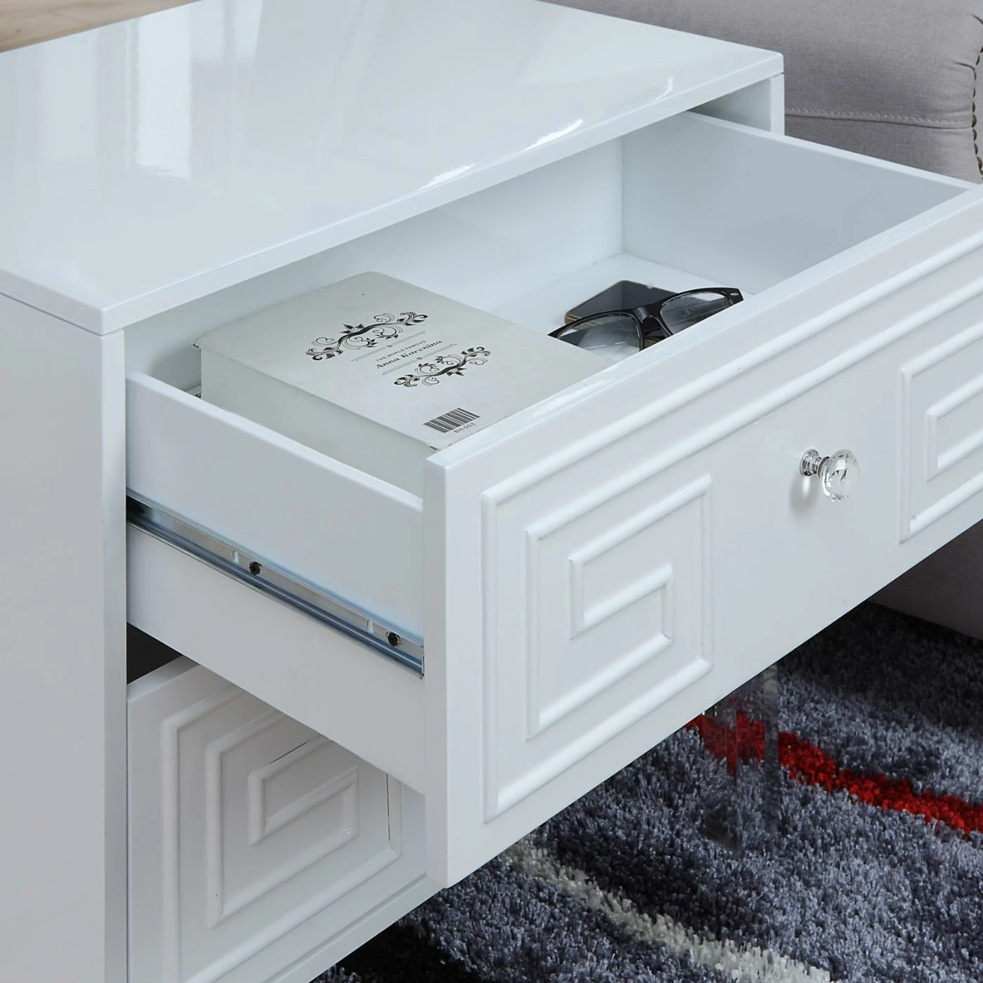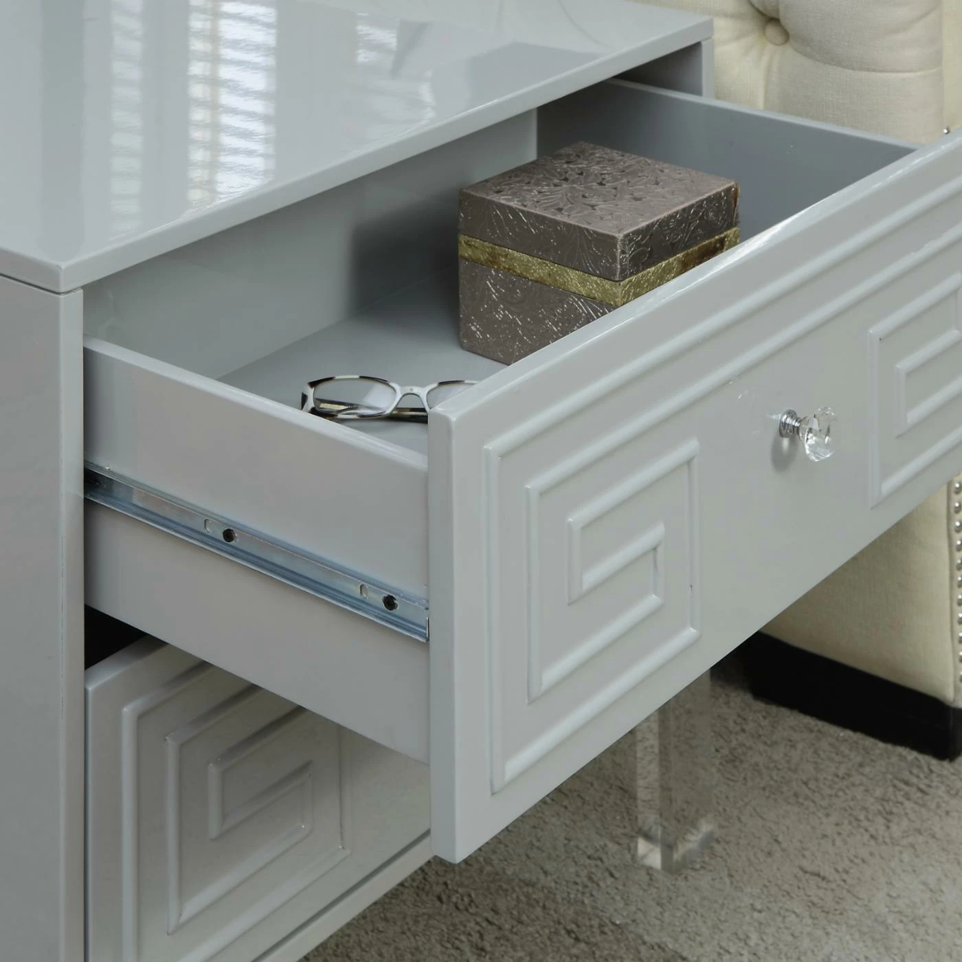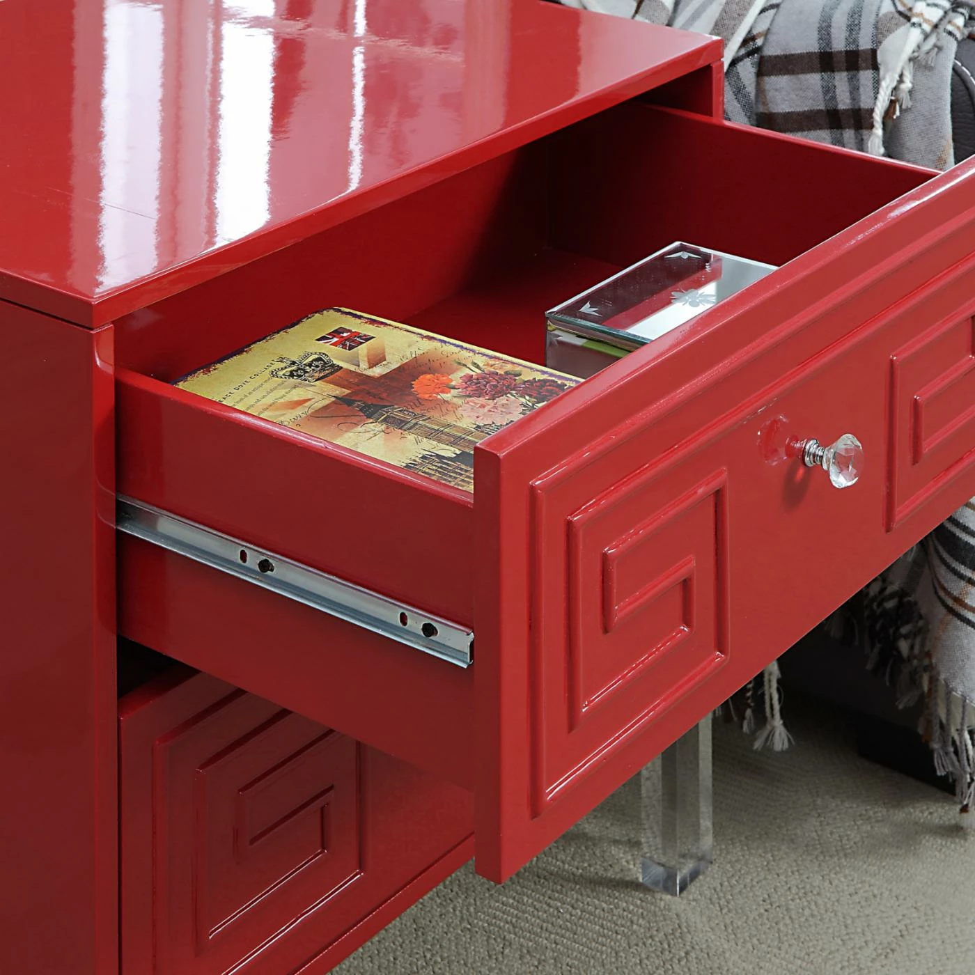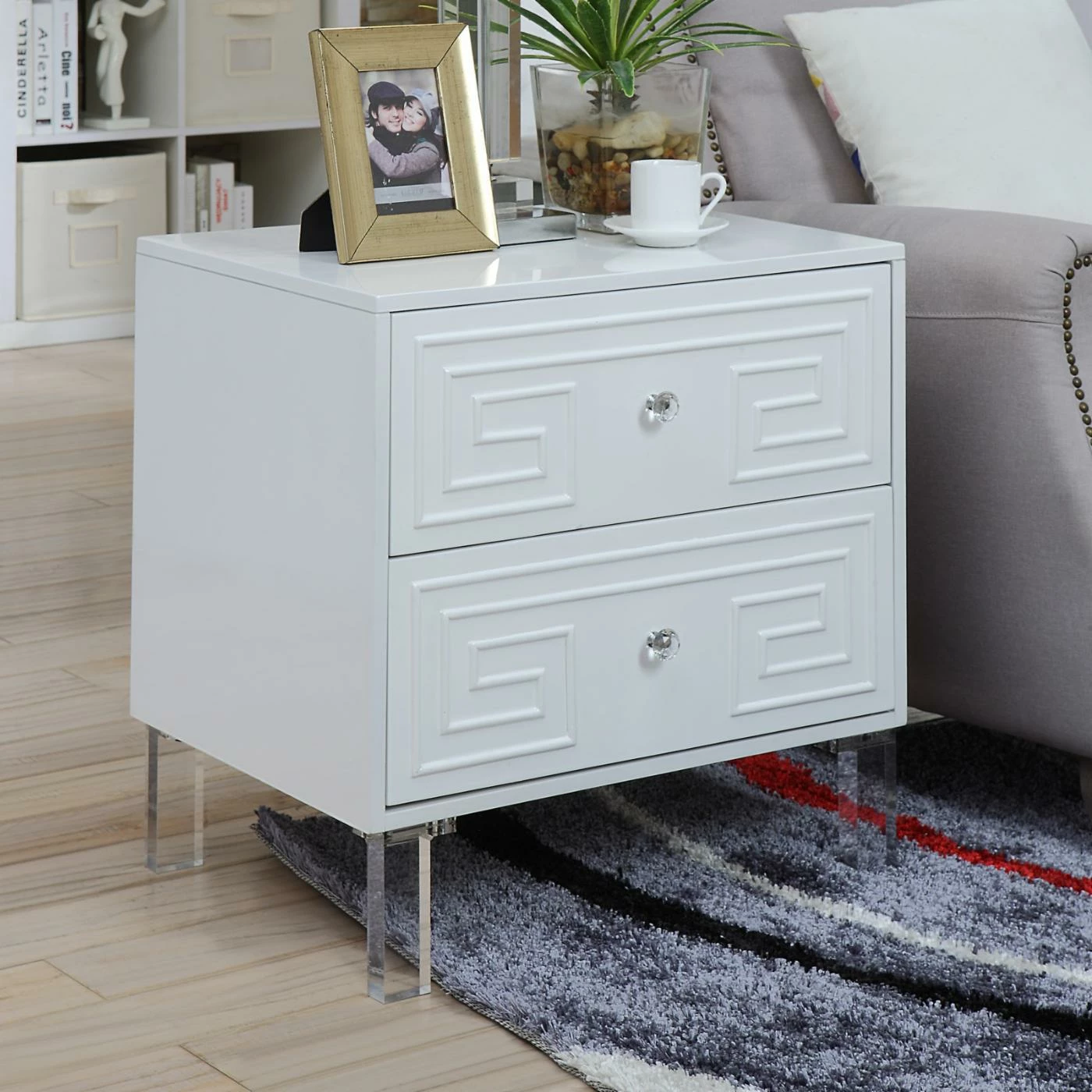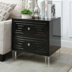 You’ll love the old school style of the Furniture of America Lela Contemporary Side Table. The perfect blend of modern and vintage design elements, this side table boasts clear acrylic legs and a durable wood veneer and engineered wood frame in your choice of available colors. Two drawers provide ample space to hold books, magazines, office supplies, cords, devices, and more.