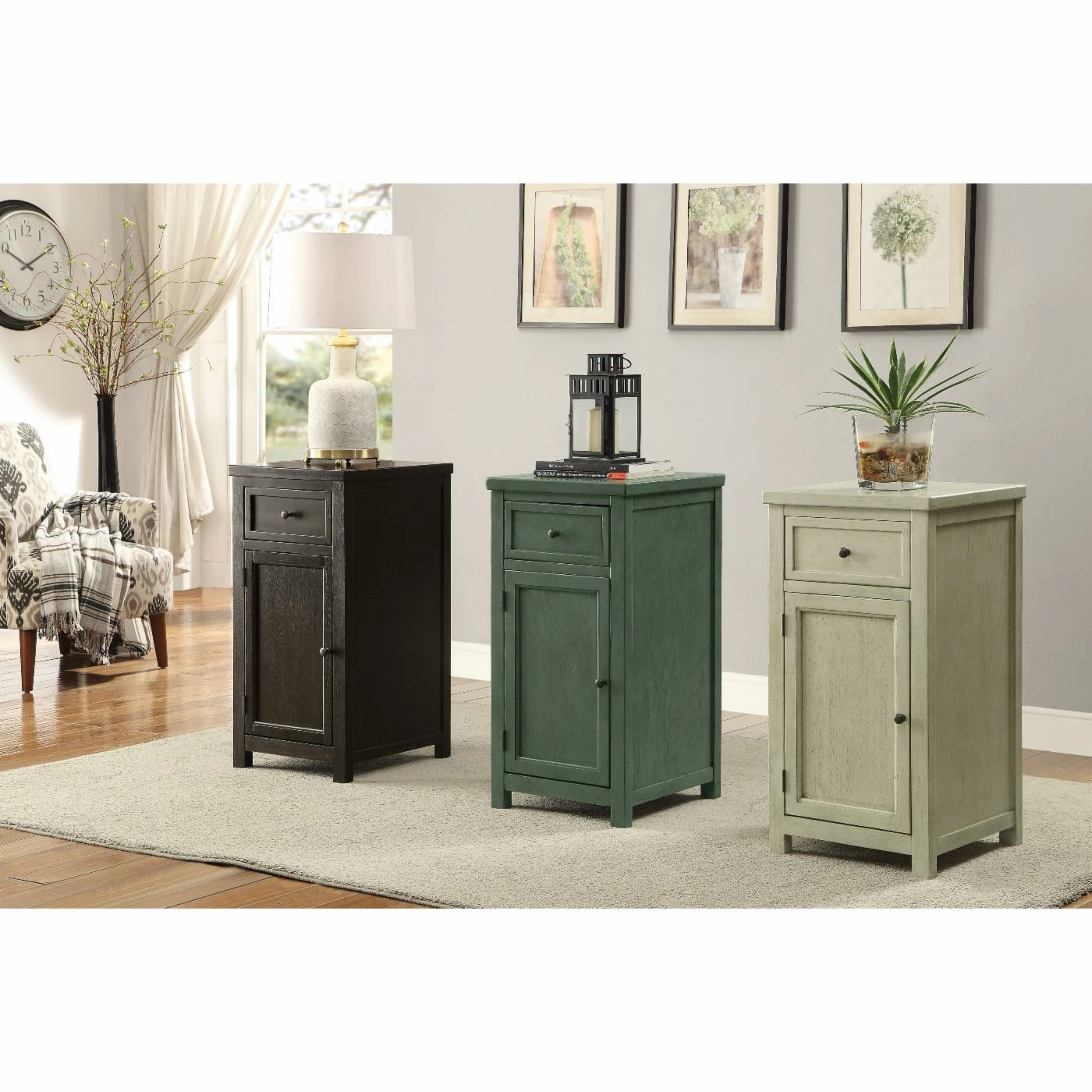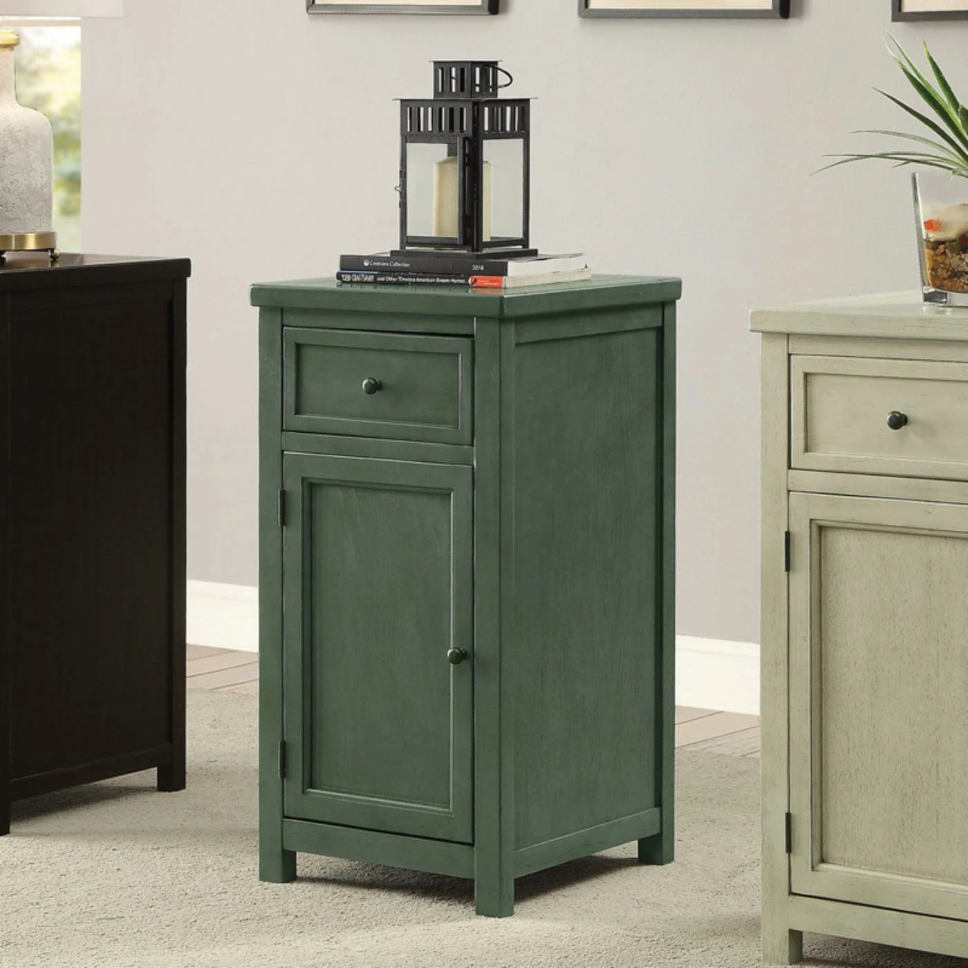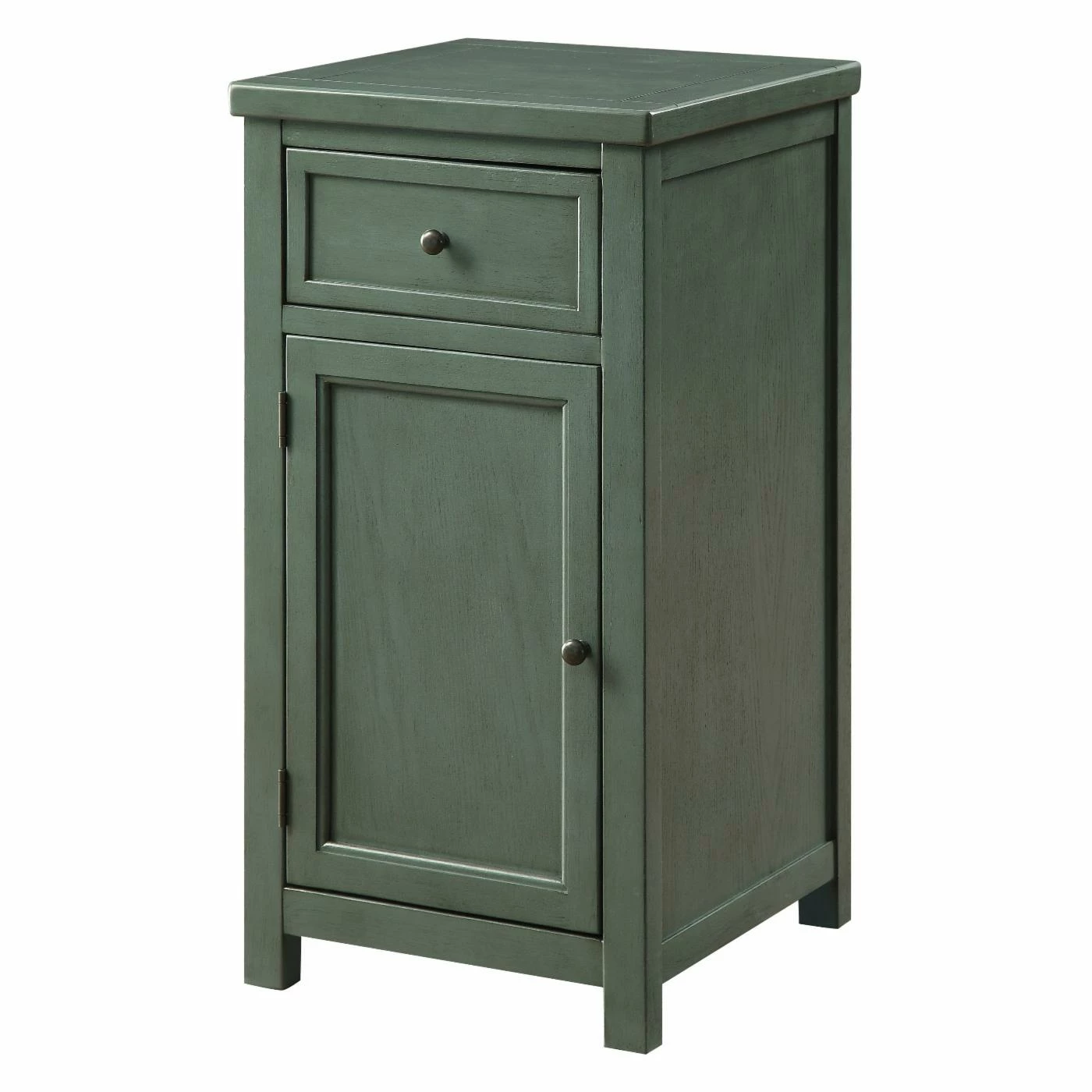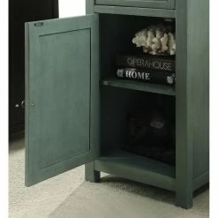 The Furniture of America Pebble Vintage Side Table is an antique stunner with space-saving storage options. A single drawer rests on smooth-moving glides for easy in and out. The bottom cabinet is perfect for storing household items. This side table is finished in a distressed teal hue.