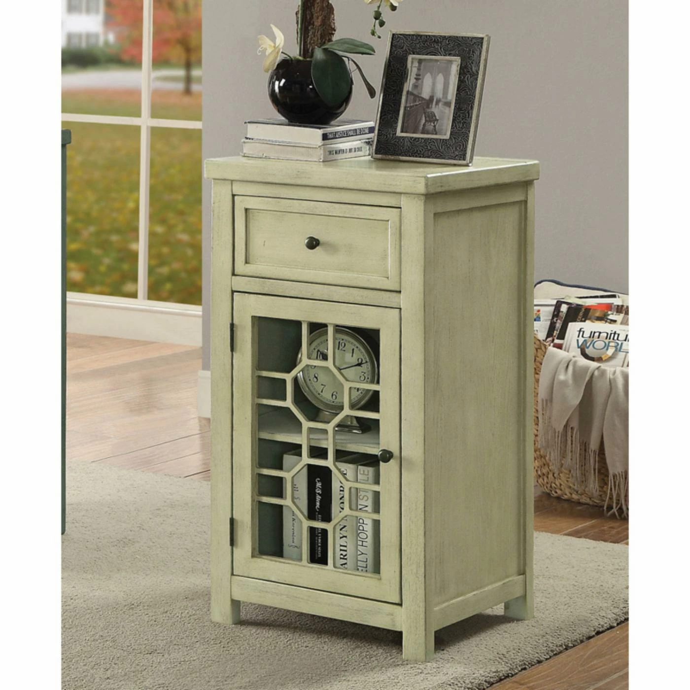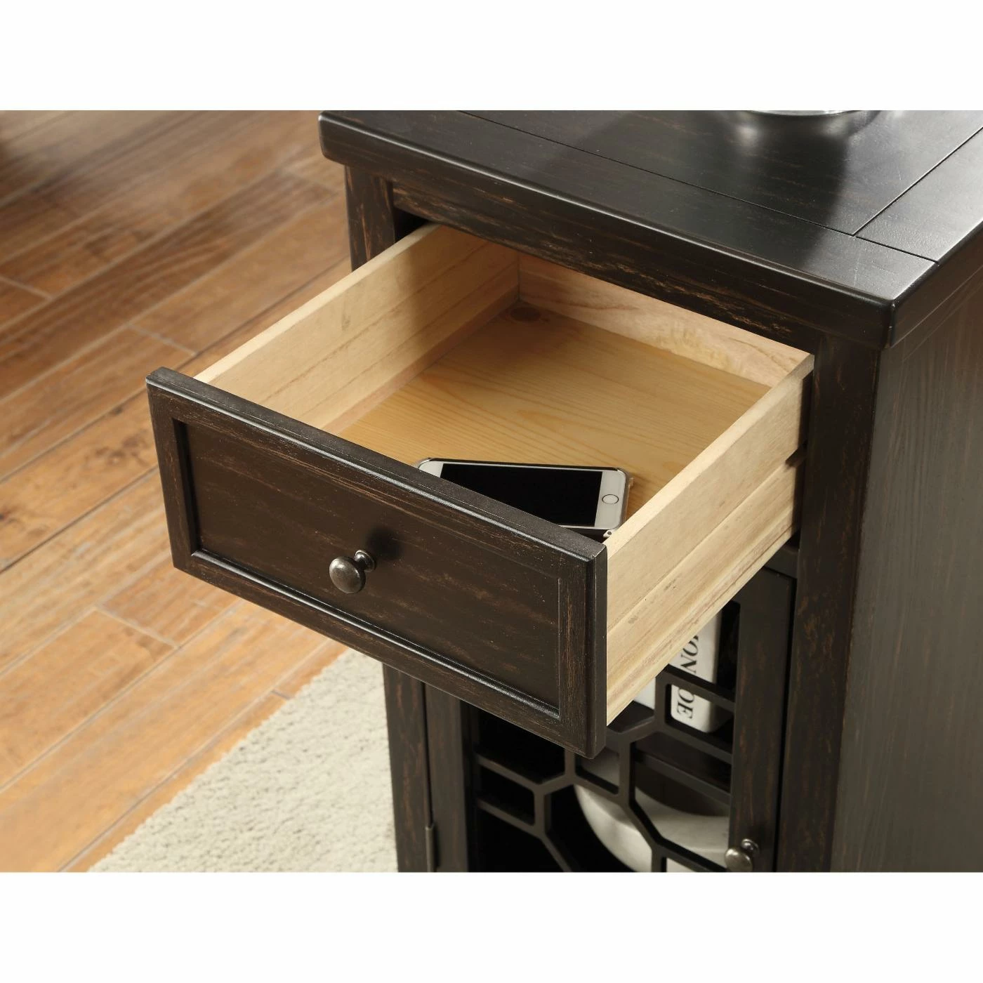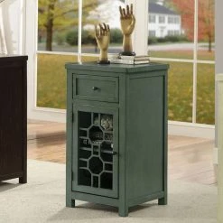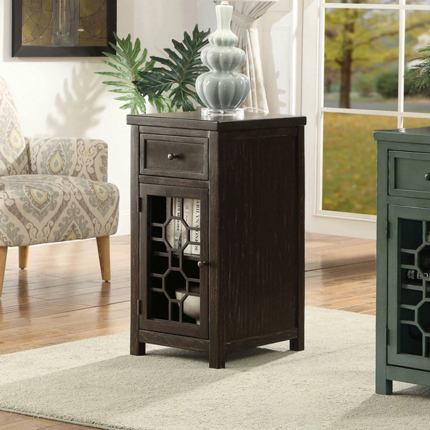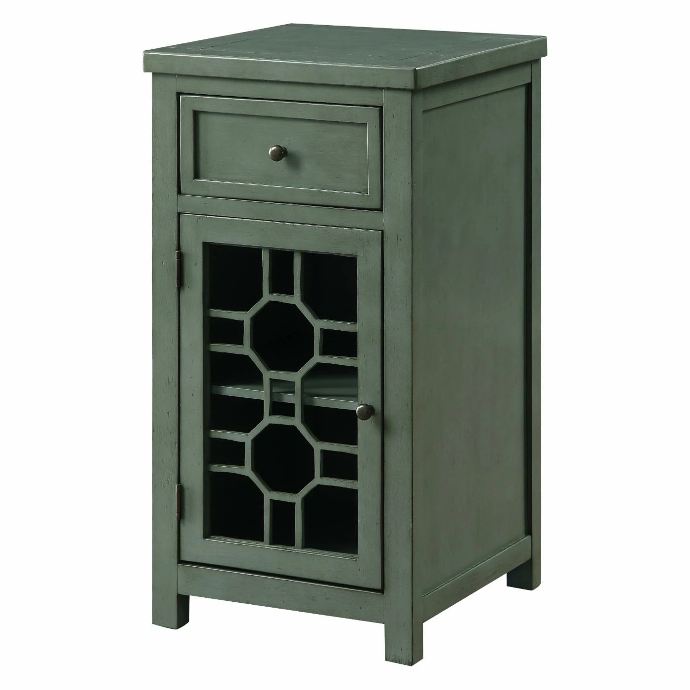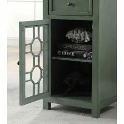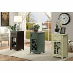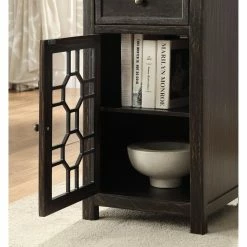 The Furniture of America Sally Side Table warms up any space with its rustic design. This wooden side table features a top drawer that rests on smooth-moving glides for easy in and out. The bottom cabinet boasts a striking geometric motif on the door. Choose from the available finish options.