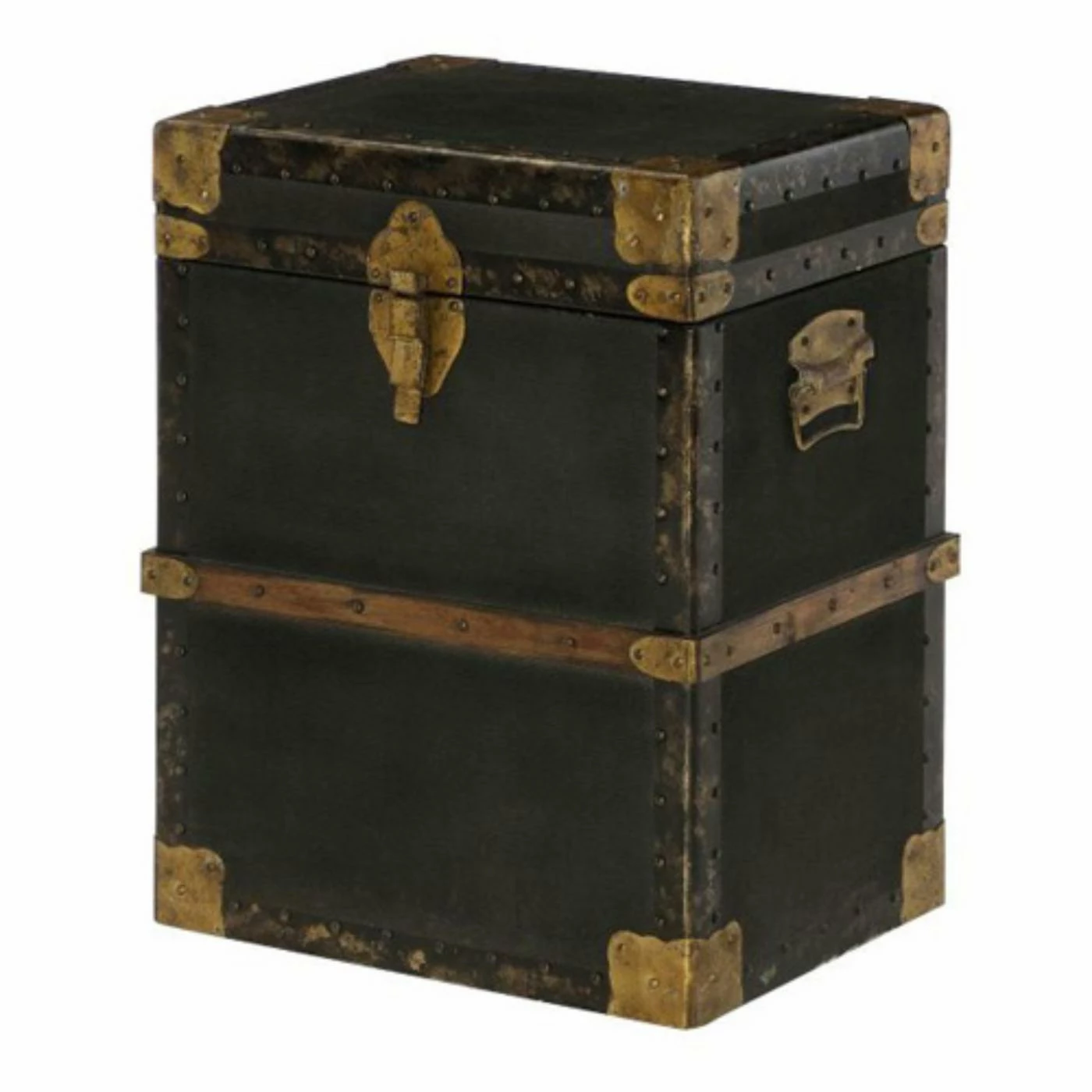 Enhance the worldly charm of your living room or sitting area with the Hammary Hidden Treasures Trunk End Table. This rustic trunk is covered in canvas and polished off with a distressed black finish. Leather and metal accents enhance the vintage appeal of this end table. Even the inside of this storage trunk is finished and features vent holes to promote proper air circulation. Store books, magazines, or extra blankets within this storage trunk.
