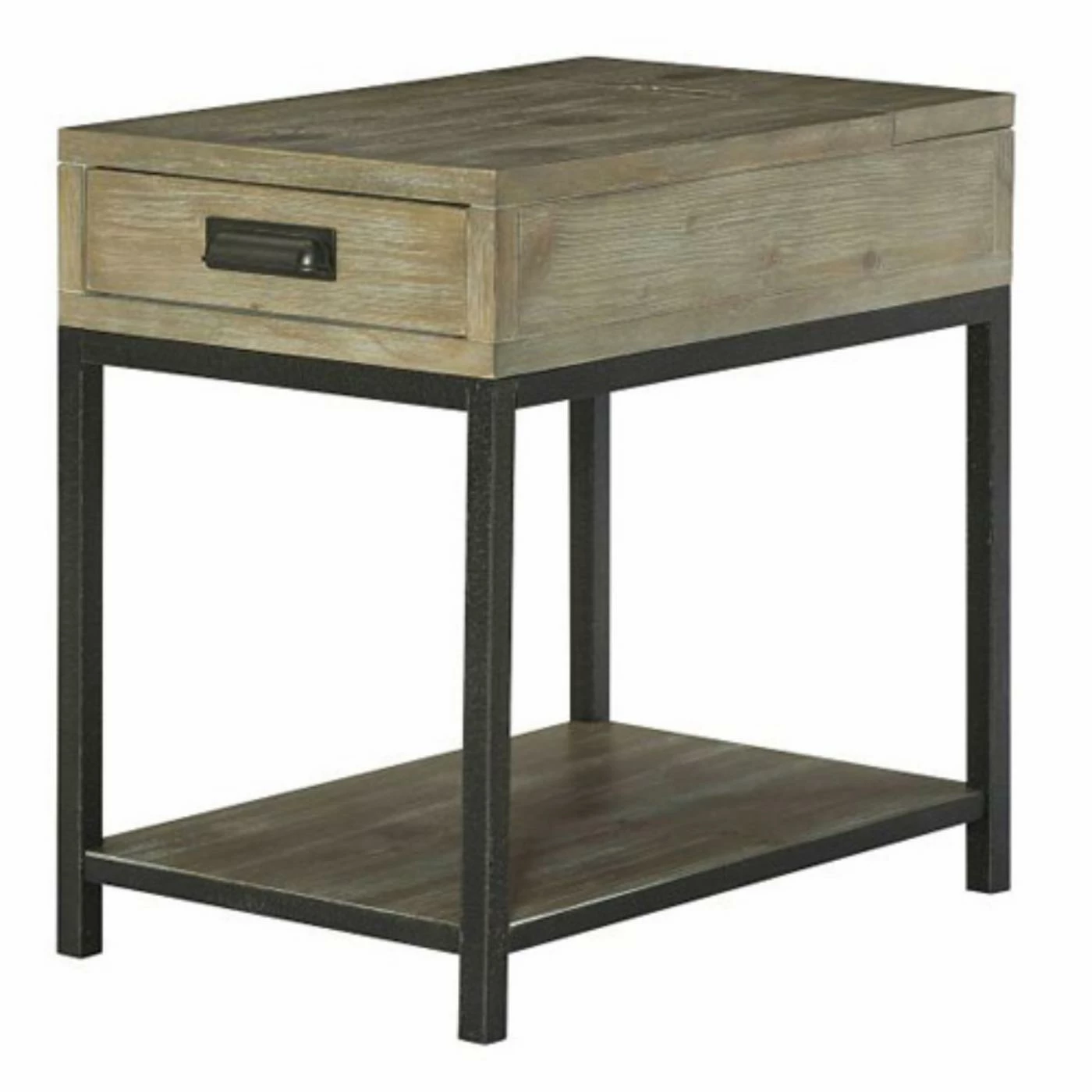 Make your favorite chair even more enticing by pairing it with the Hammary Parsons Charging Chairside Table. This rustic end table boasts a solid wood and metal construction. The clean style lines enhance the rustic and modern style of the table. For a bit of added function, the drawer of this table features a sliding surface inside to reveal a power bar complete with a USB port for the convenient charging of your electronic devices. Showcase it along with coordinating pieces from the Parsons collection.
