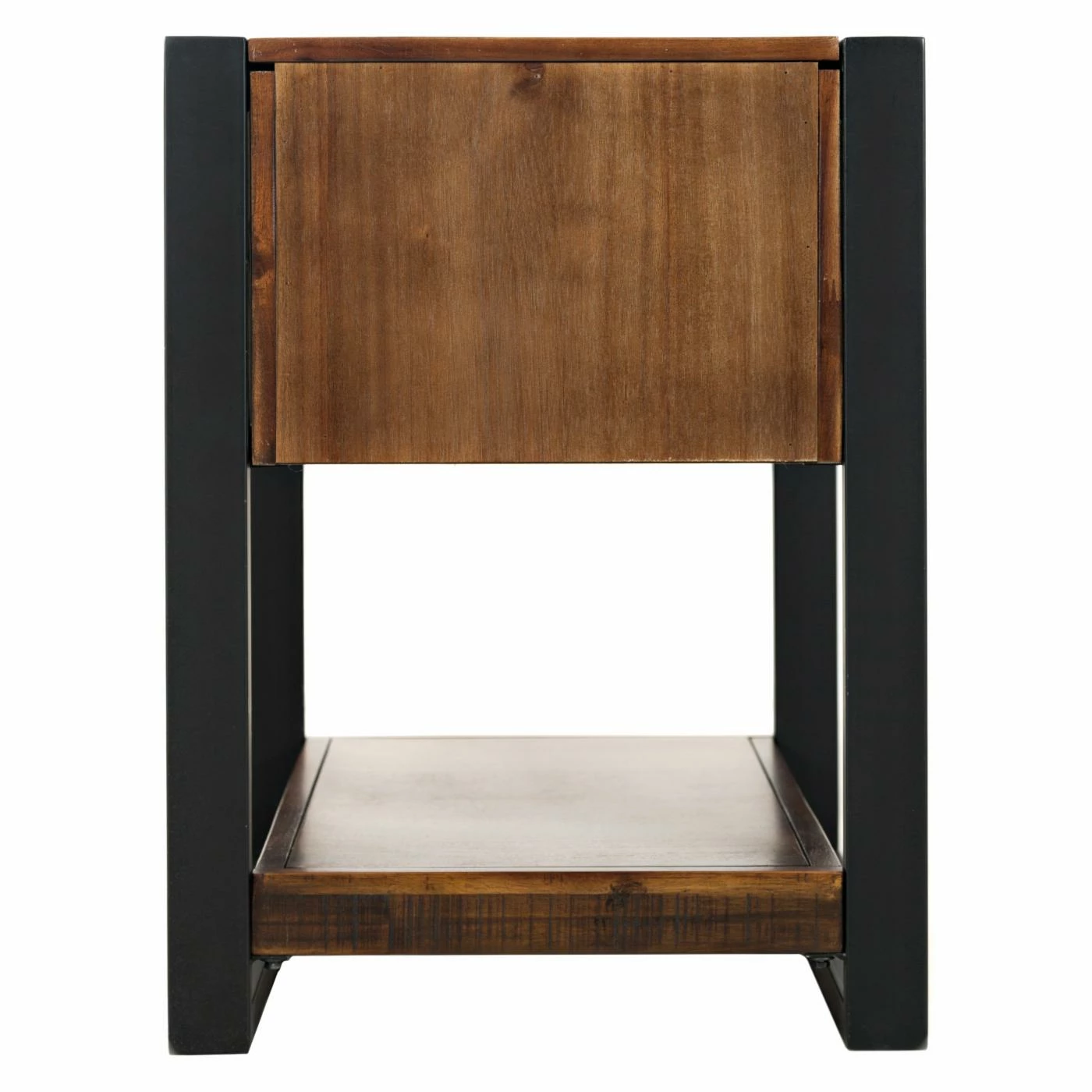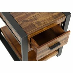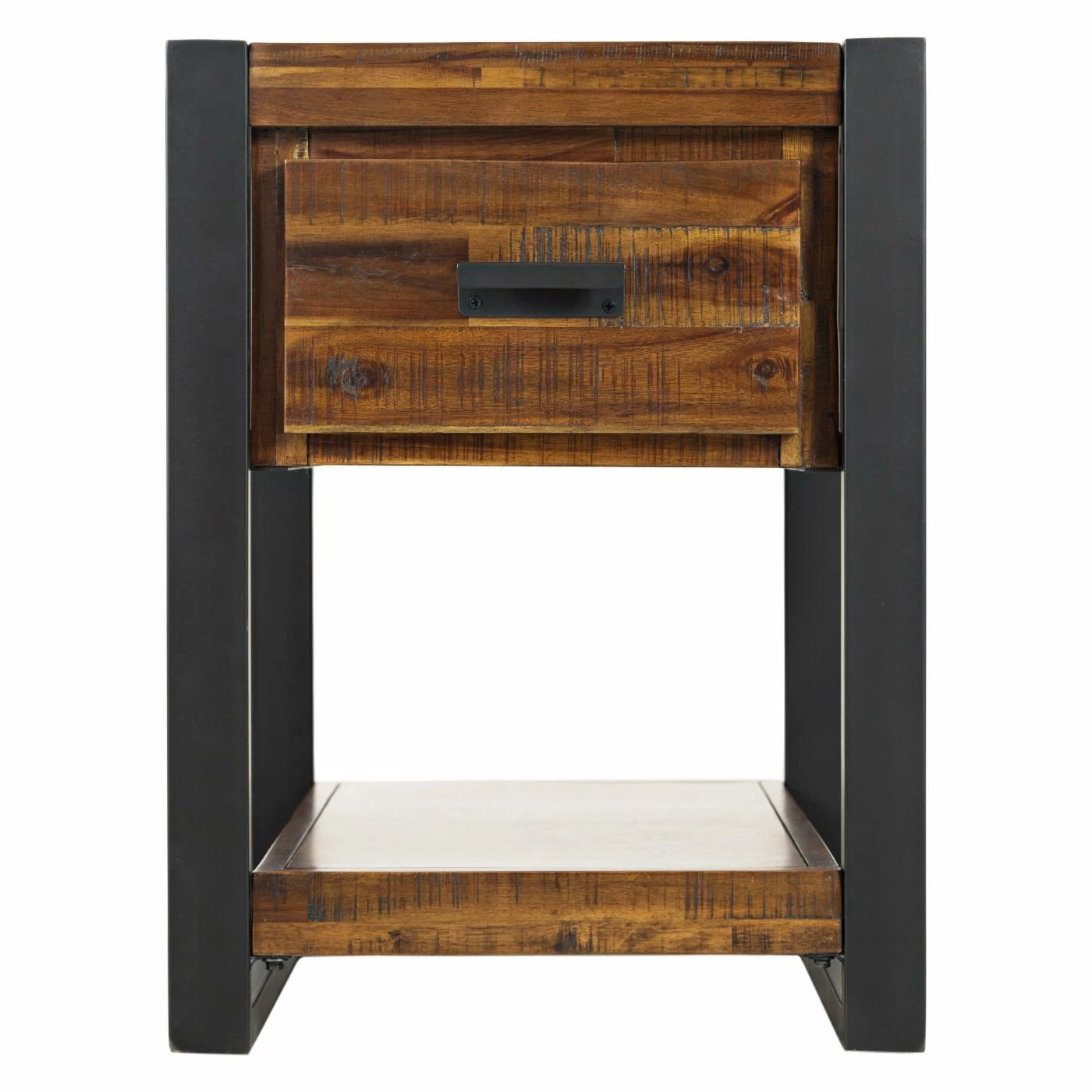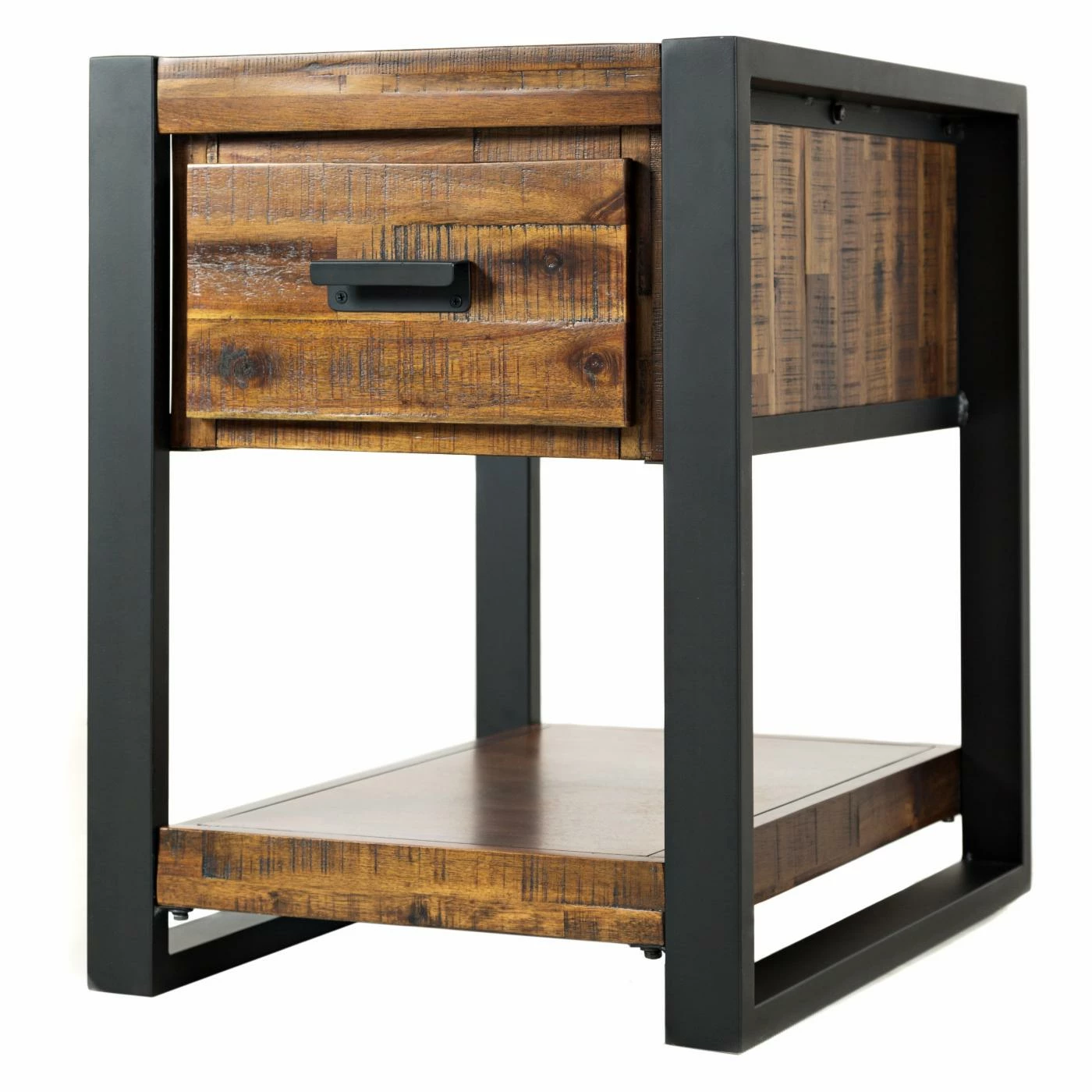 Contrasting textures make the Jofran Loftworks Chairside Table with Drawer an intriguing addition to your bedside, living room, or home office. Wood plus metal creates an industrial-chic feel, made even more interesting due to the solid acacia woodβs rough-hewn texture. Steel supports wear a matte black finish.