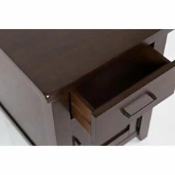 The transitional style of the Jofran Twin Cities Chairside Table allows it to easily blend with your existing furnishings. Crafted from wood for durability, and finished in a rich brown, this chairside table adds warmth and sophistication to your living room. The single drawer is great for storing remotes and devices, while the cabinet will keep your favorite books and magazines within easy reach.