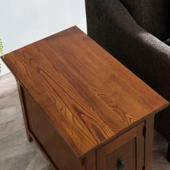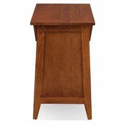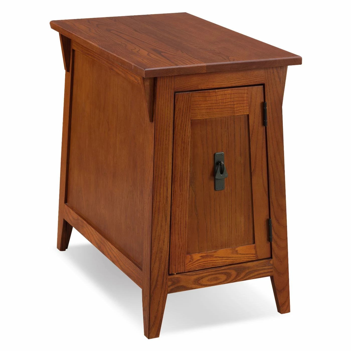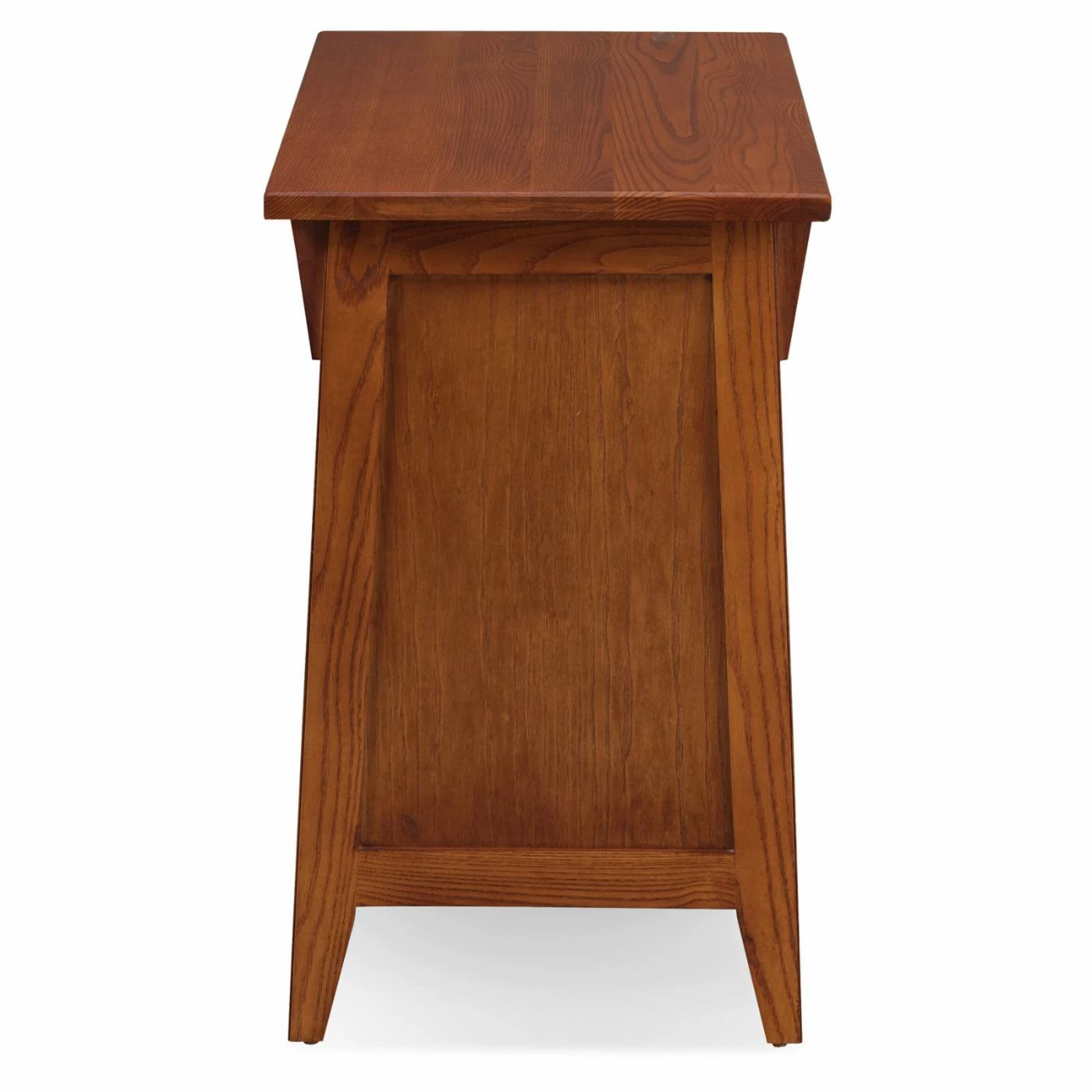 The Leick Home 1032RS Favorite Finds Mission Cabinet End is an ideal end cabinet to accentuate your living room ambience. This cabinet features a canted design with wedge corbels and provides ample storage space. Its door opens to reveal a roomy interior with a shelf for easy organization. Made to be durable, this cabinet features a tough construction of oak veneers with a solid ash top. Blackened hardware and a russet finish add to the visual appeal of this unit.