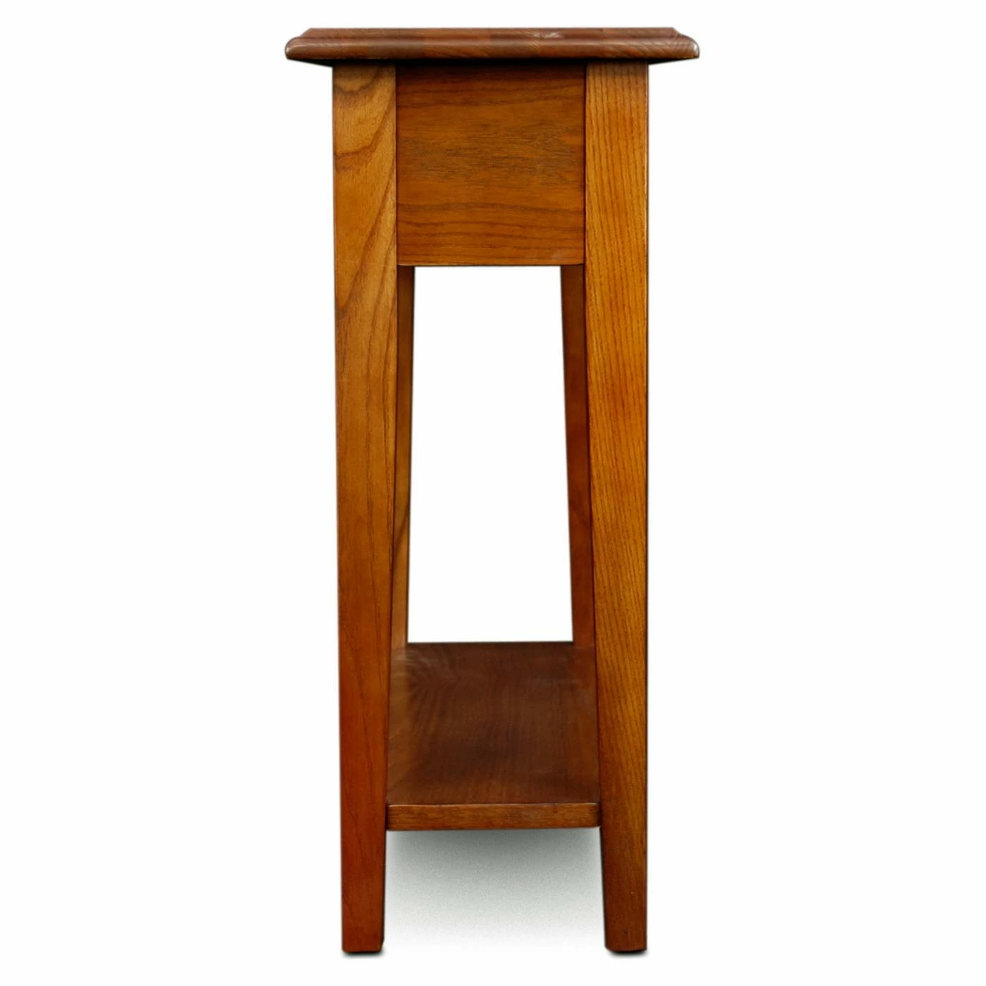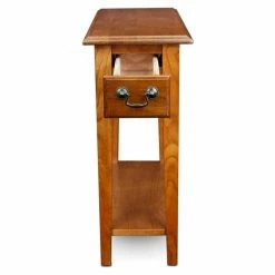 Shake things up a bit with the Shaker/Mission style of the Leick Home Hardwood 10-Inch Chairside End Table in Medium Oak. With distressed edges for antique appeal, this end table is crafted of solid ash, oak veneers, and covered in a rich, medium oak finish. It features a dovetailed, solid wood drawer box with a blackened metal drawer pull, a lower display shelf, and a top area for display.