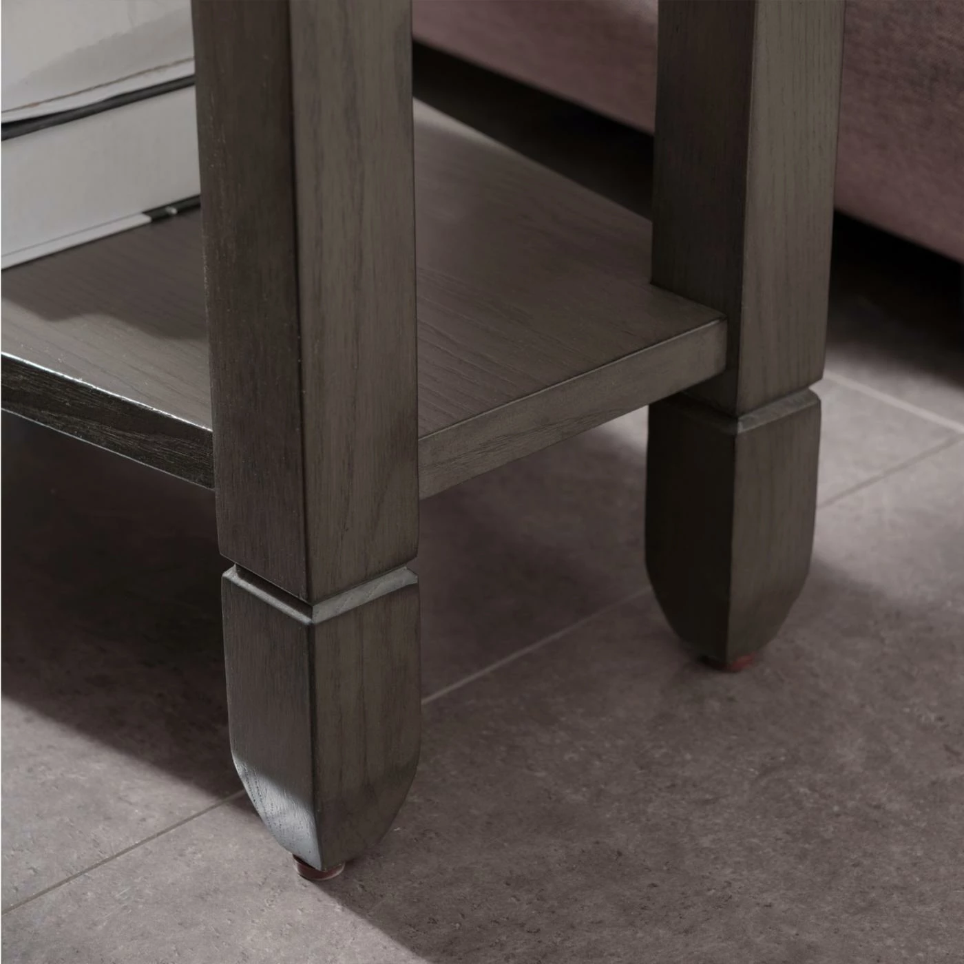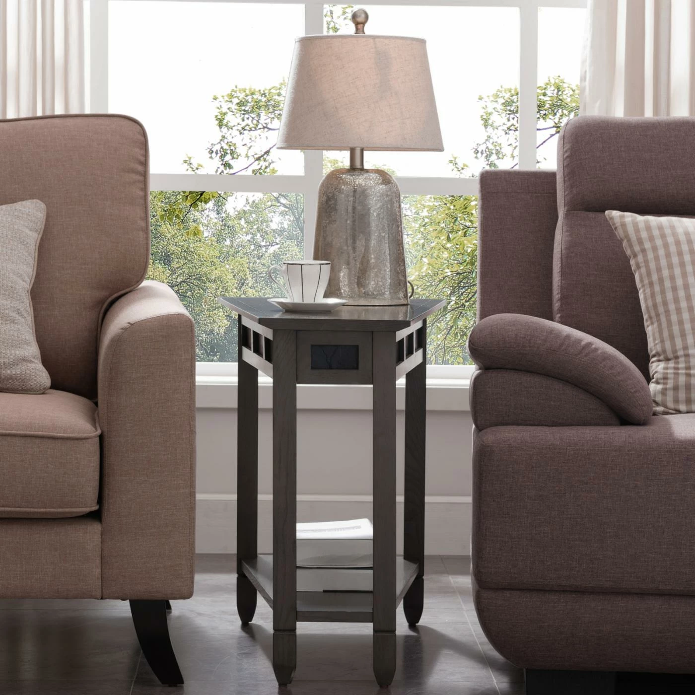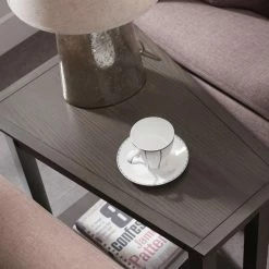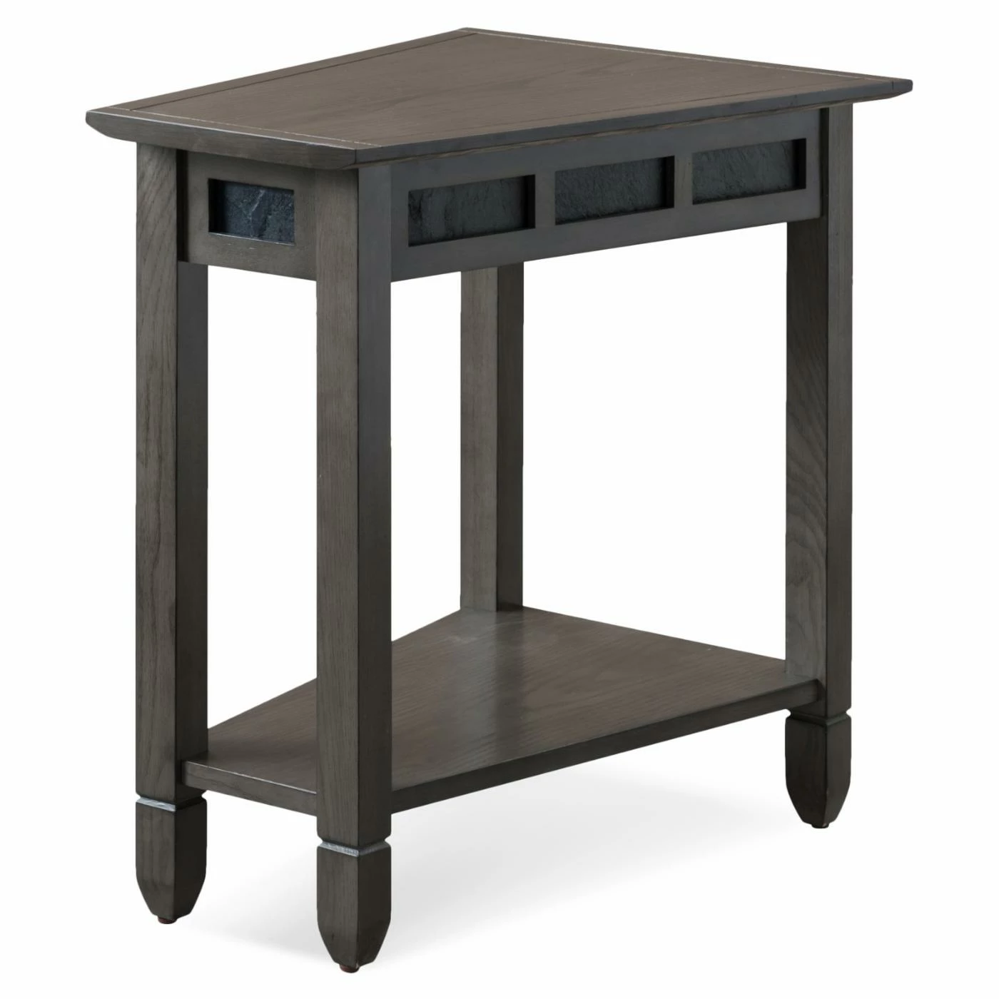 With its triangular shape and smaller scale, the Leick Home Wedge Table fits neatly between two chairs or beside your sofa. This wedge table is scaled to fit compact spaces and designed to make the most of it. It’s built of oak wood and finished in smoke gray with natural black slate details that lend a mission style.