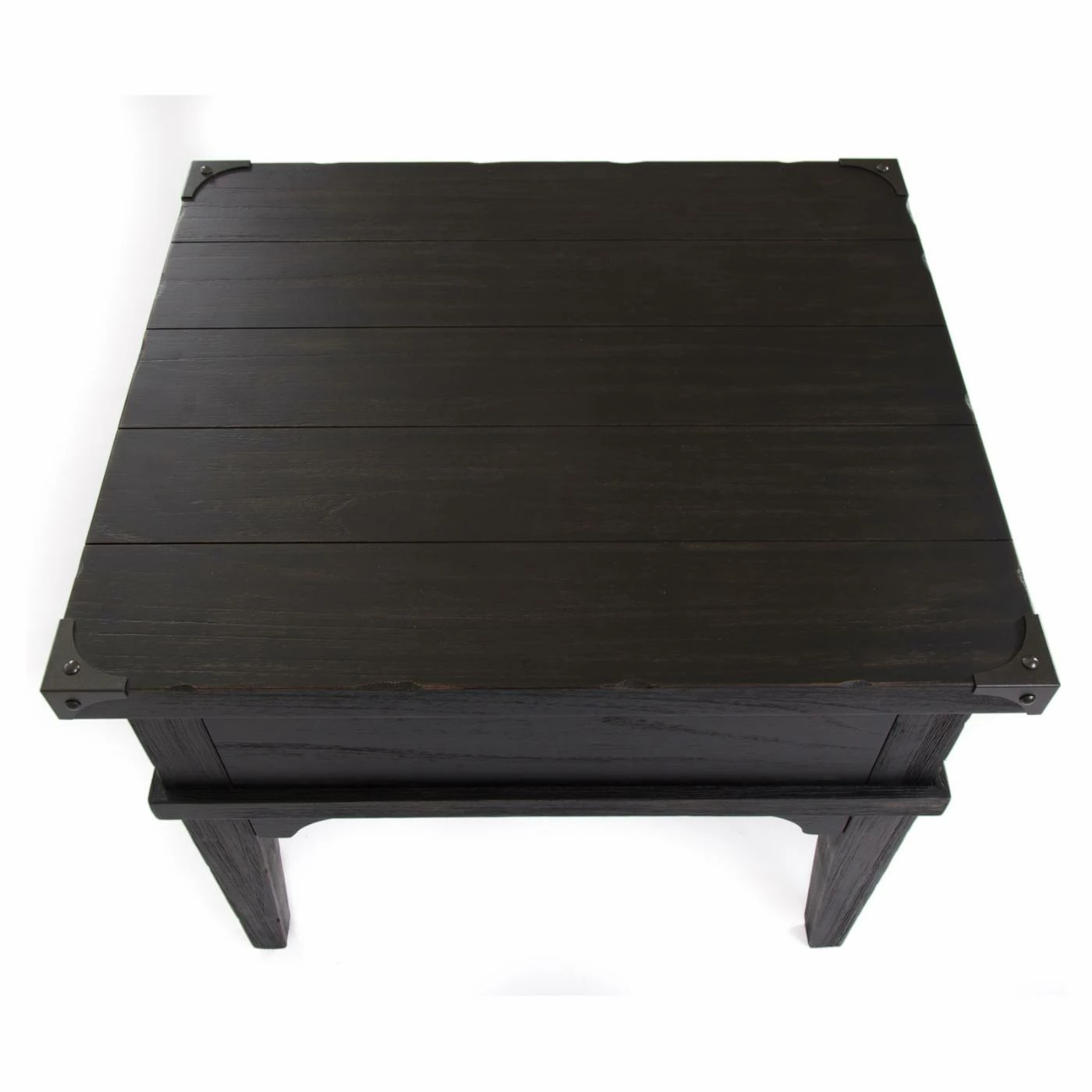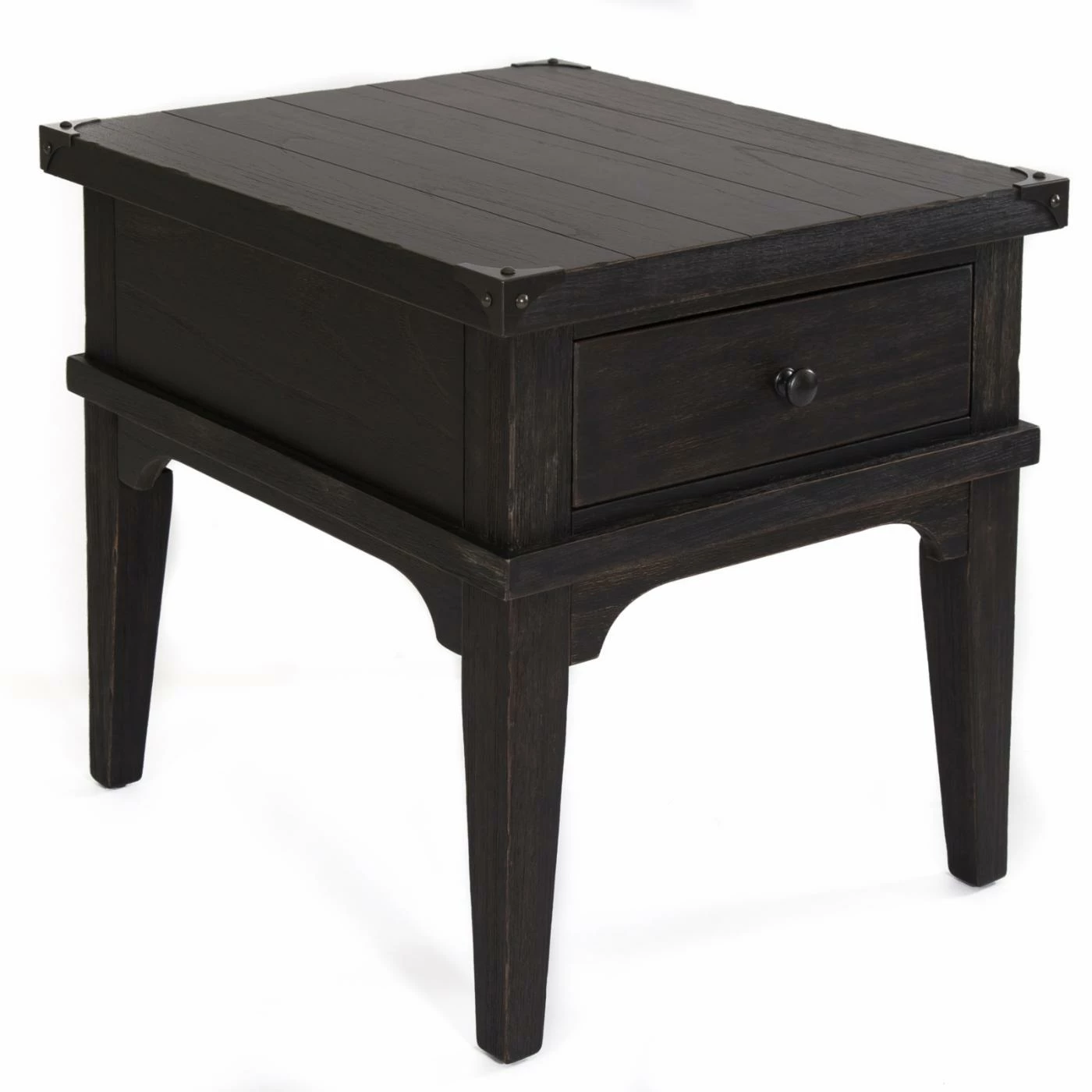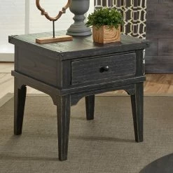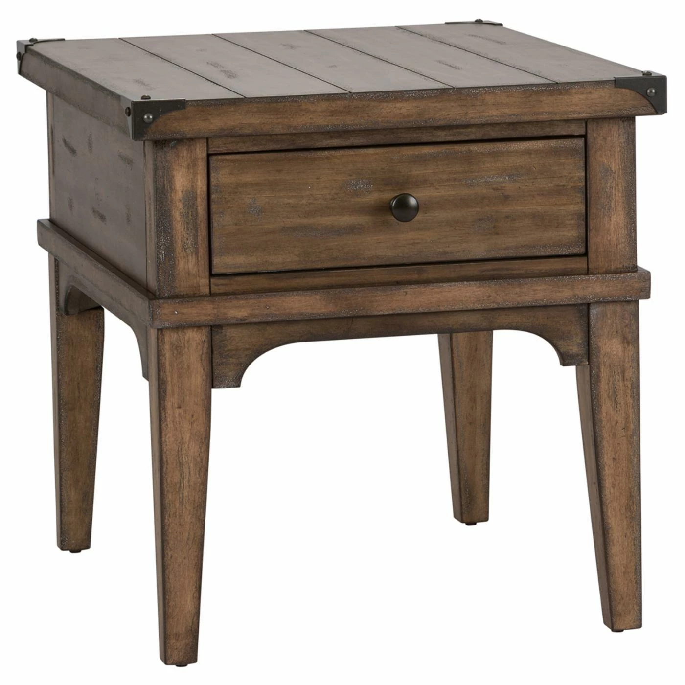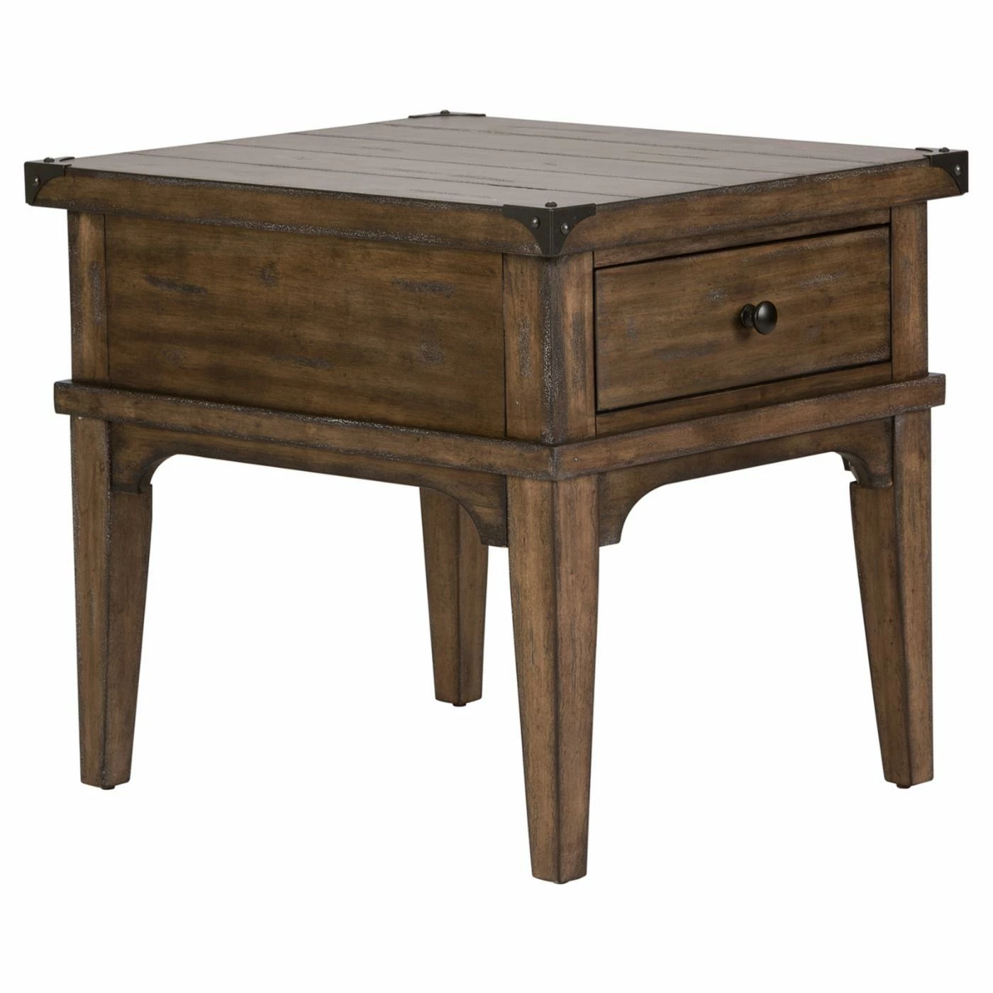 Capture an antique look for your den or living room with the Liberty Furniture Industries Aspen Skies End Table. This end table features a rustic plank-style tabletop accented by corner metal brackets. Its tapered legs and arched aprons lend a touch of elegance to the piece. Its sturdy wooden construction is offered in a choice of available finishes. What’s more, the table’s built-in sliding drawer provides plenty of handy storage for all manner of miscellanea.