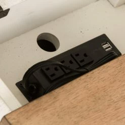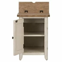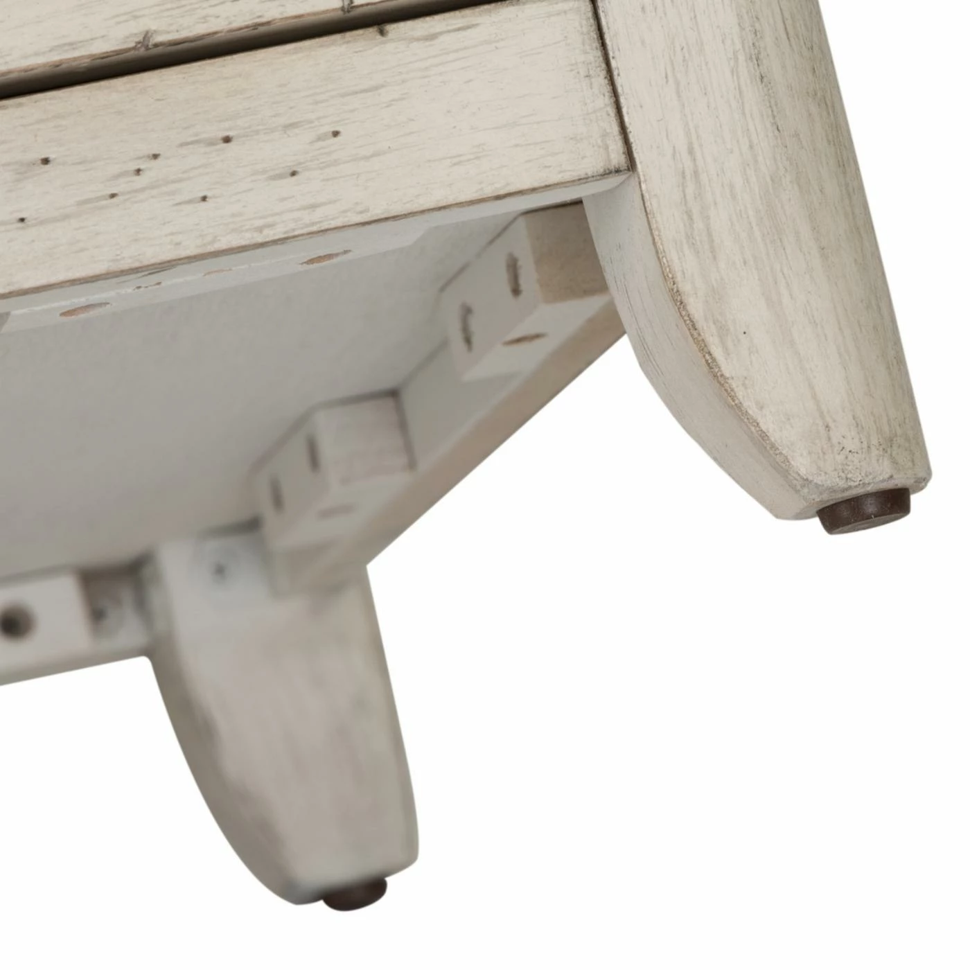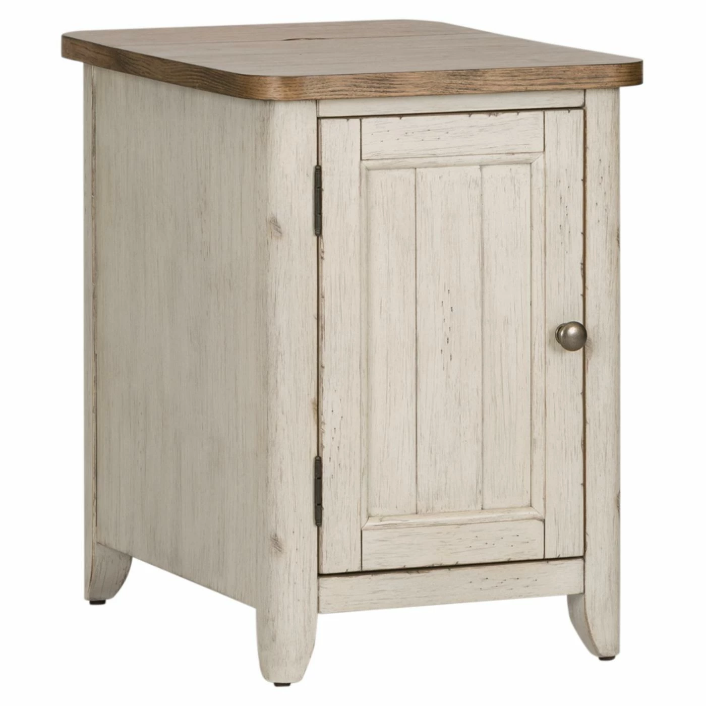 Modern versatility meets rustic farmhouse design with the Liberty Furniture Industries Farmhouse Reimagined Door Chair Side Table. Constructed from poplar and rubberwood solids, this beautifully crafted side table is adorned with weathered cottage white and chestnut finishes for an antique look. Its cabinet door is highlighted by a chamfered front and an aged brass knob. It opens to reveal spacious interior storage with built-in shelving. What’s more, the tabletop has a rear lid that hides a small compartment with an opening where wires can be run, allowing you to power electronic devices with the use of a power strip or USB hub.