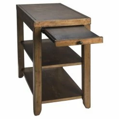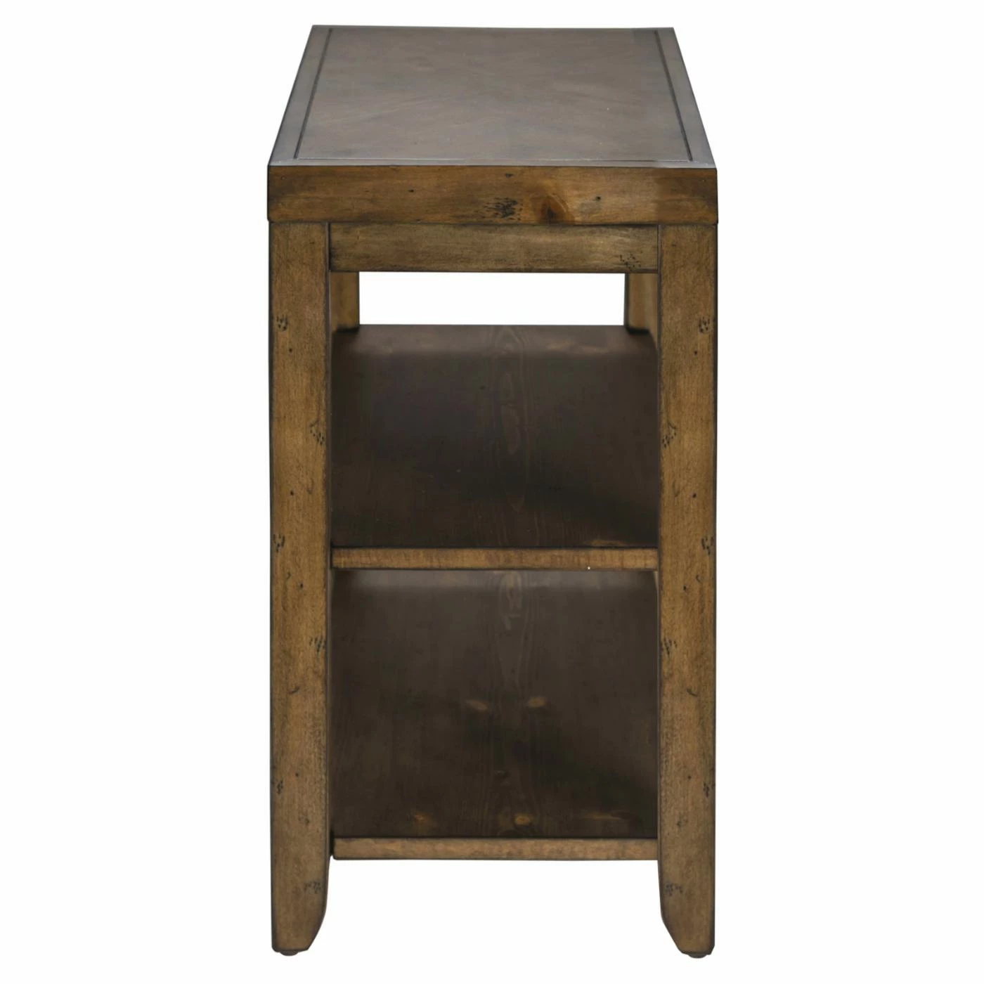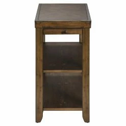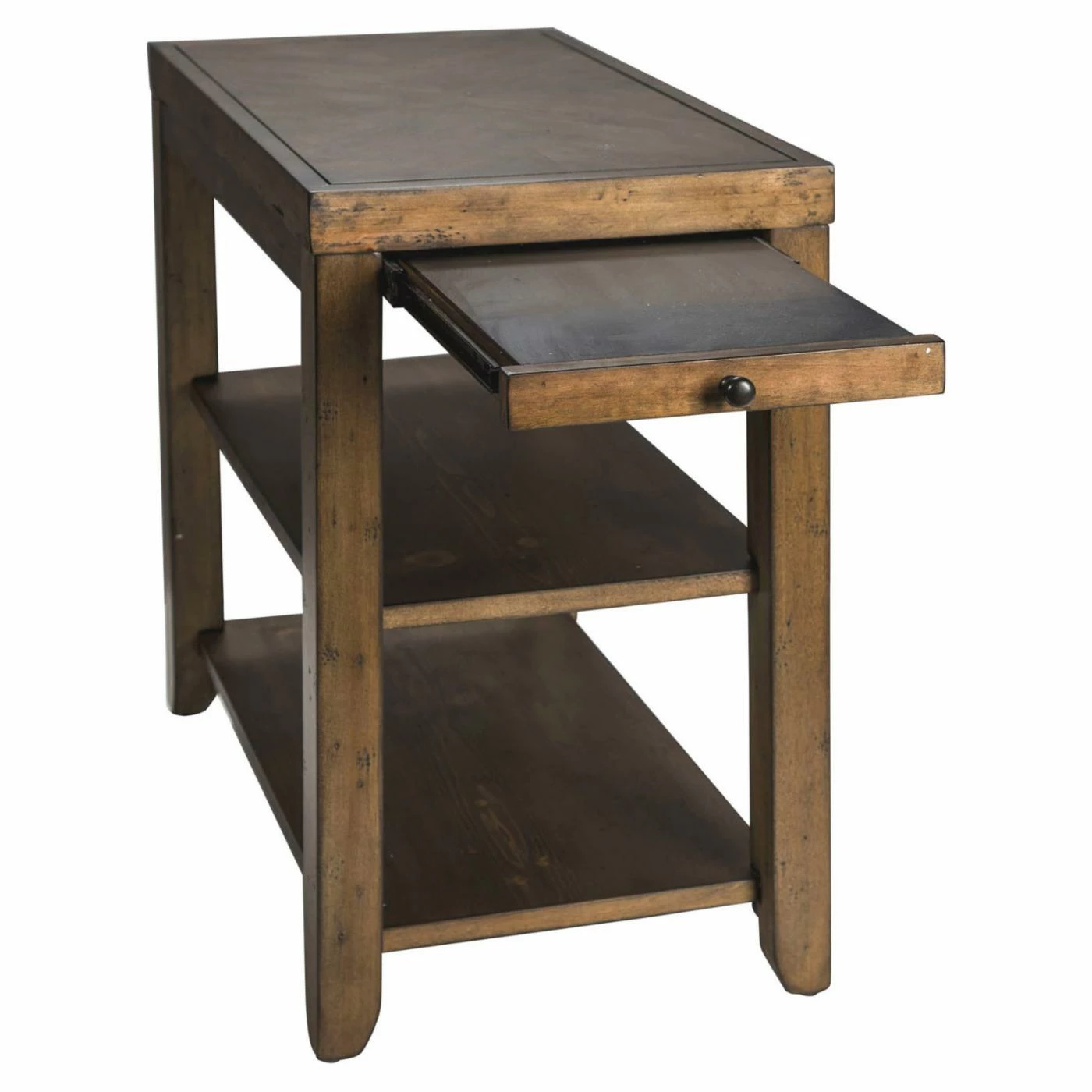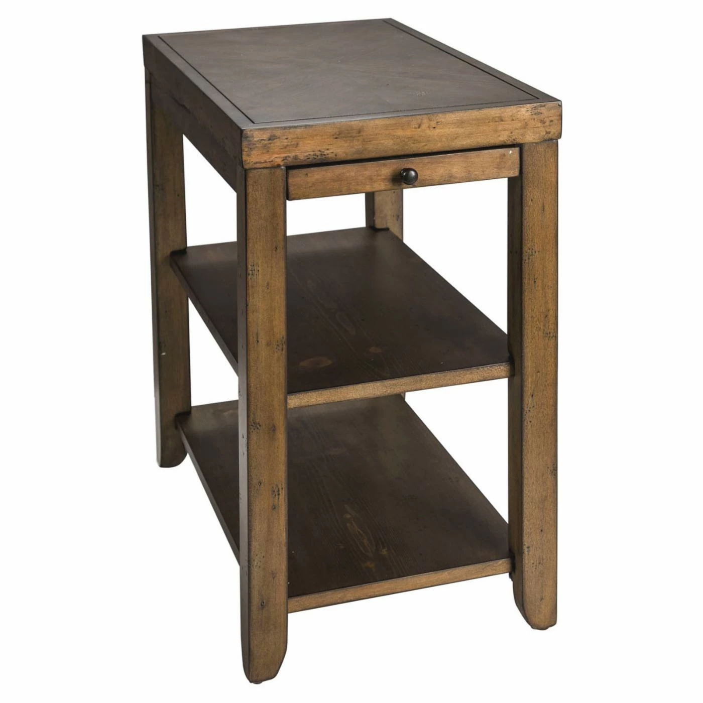 Classic style and clever versatility come together with the Liberty Furniture Industries Mitchell Chair Side Table. Featuring a parquet-style tabletop with cedar veneers in a warm nutmeg finish, this side table showcases an elegant transitional design that complements just about any space. A sliding tray accented by a metal pull allows you to augment its surface space as needed, providing a handy place to set a beverage as you relax on the sofa. Additionally, two lower shelves offer extra storage for various items such as books and magazines.