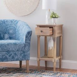 - Measuring just 13 by 14 inches this slim table fits perfectly between two large chairs or in a tight corner