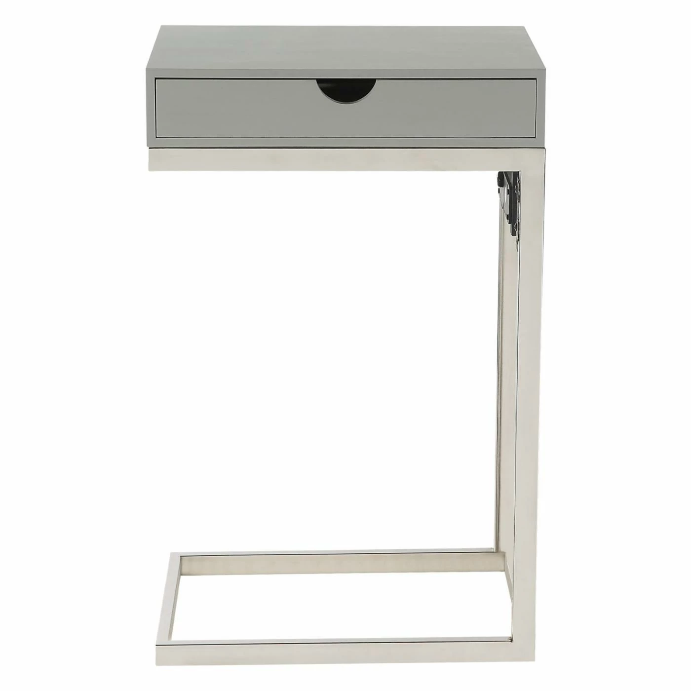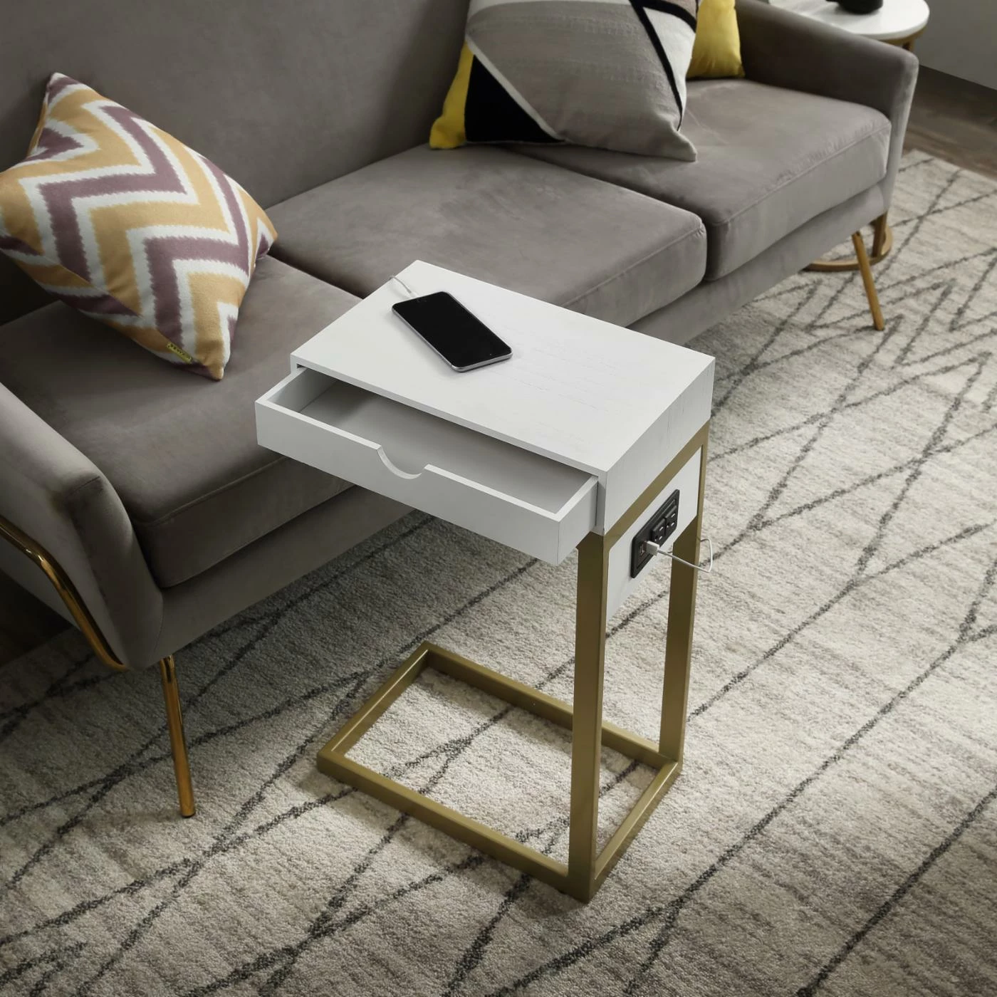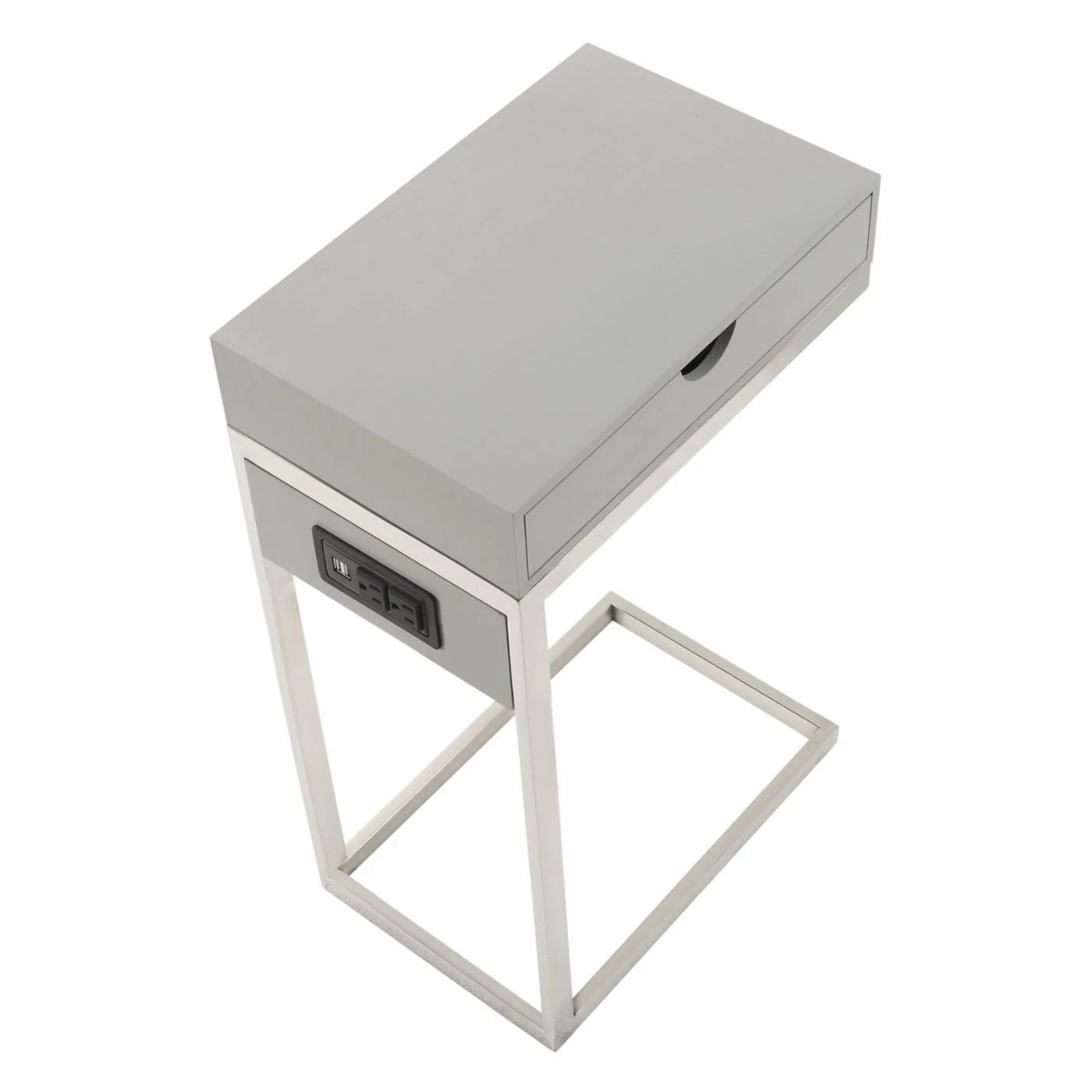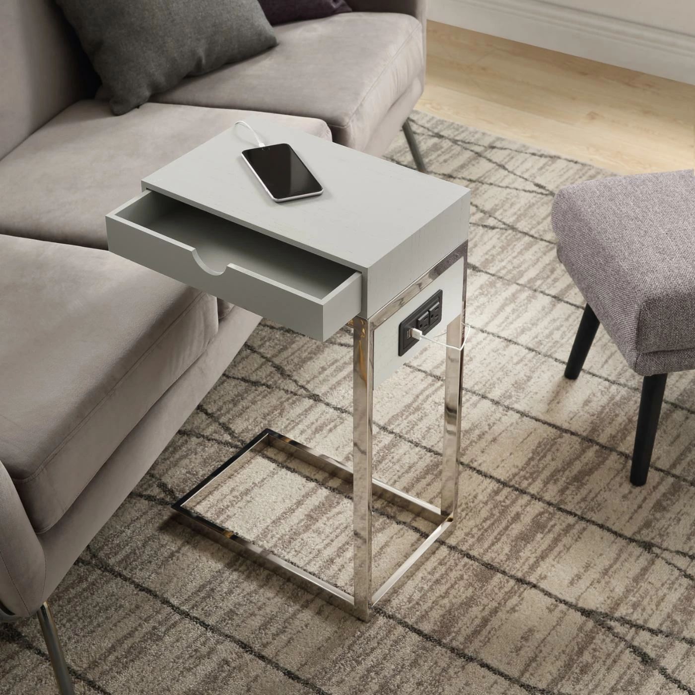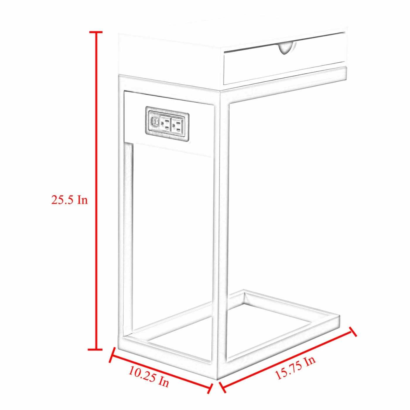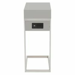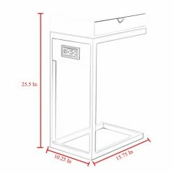 Providing a convenient resting place for your cup of coffee or current novel, the Loft Lyfe Brecken C Table / End Table also gives you compact storage space and a mini charging station. This C-shaped table slides up to your sofa or armchair as a sleek, modern companion piece. The table has a small drawer in the top as well as two USB outlets and two standard outlets.