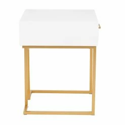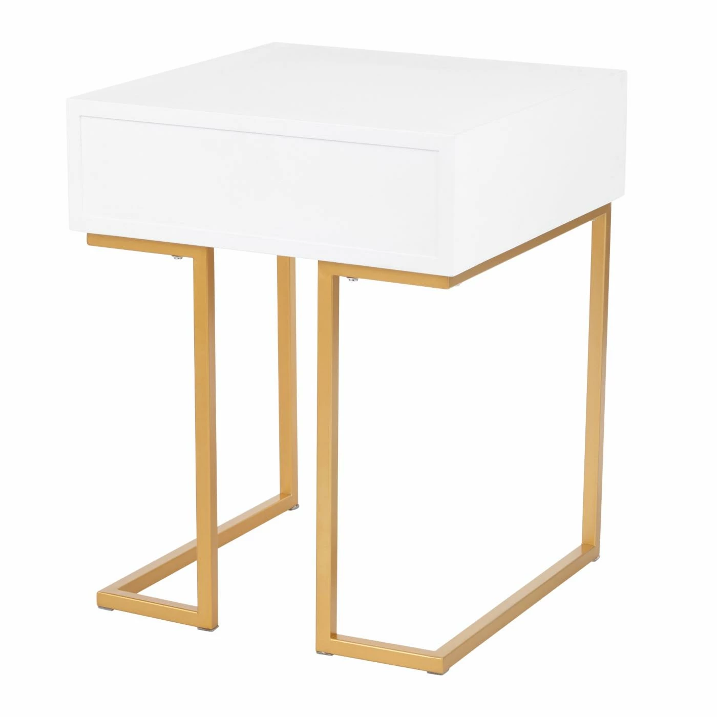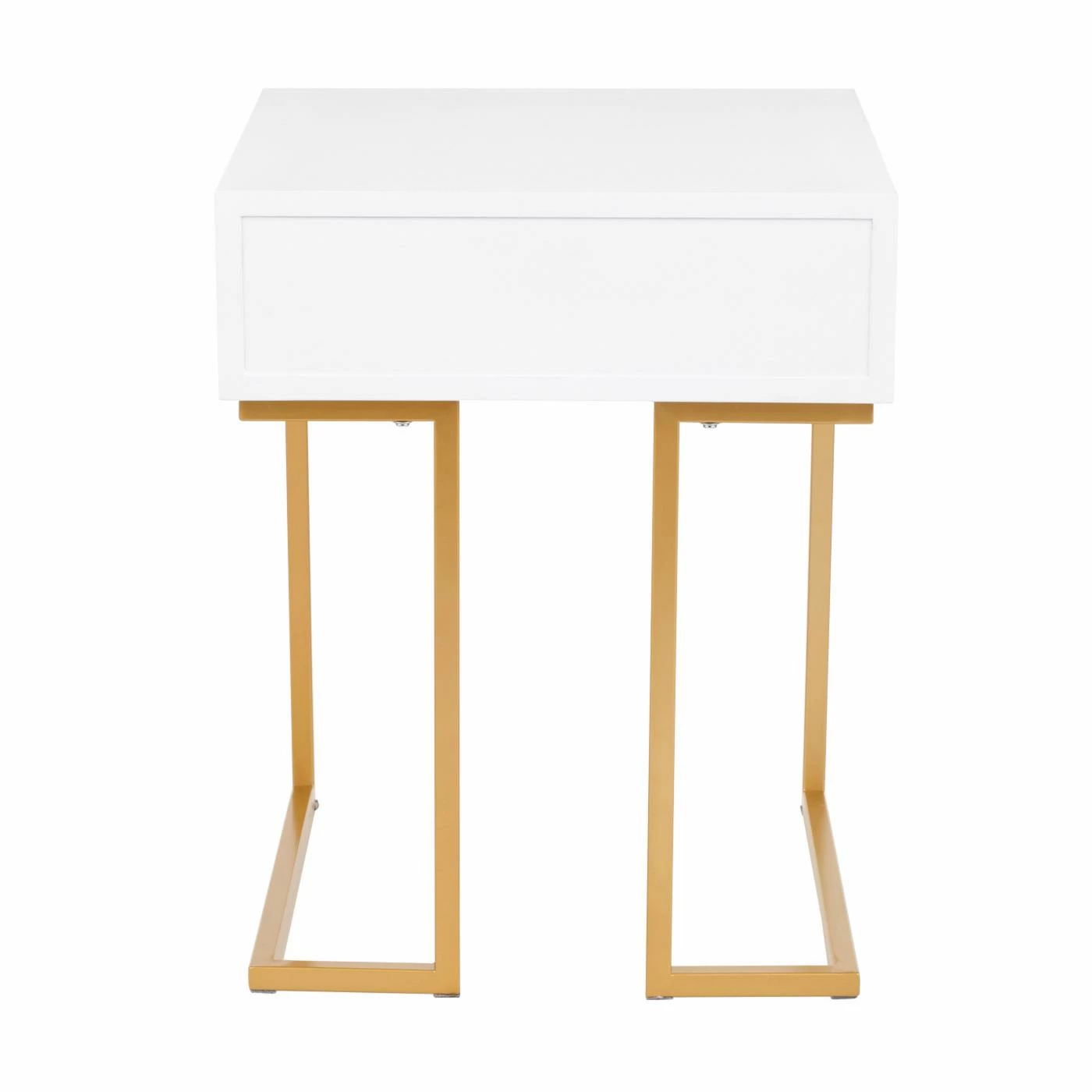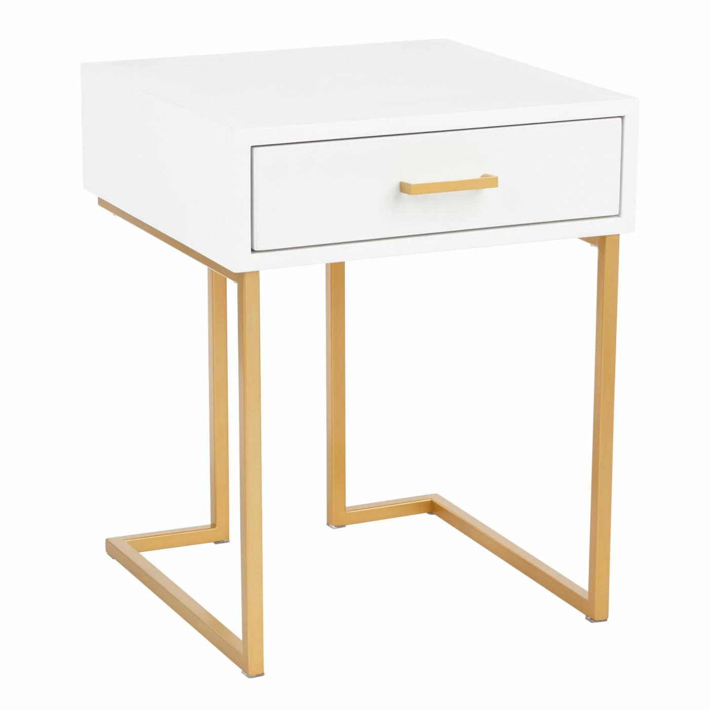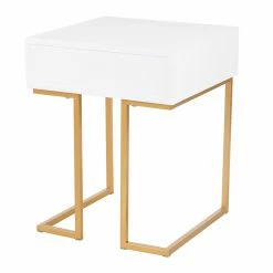 White and gold finishes on the LumiSource Midas Contemporary Side Table with Wood Table Top give it a glamorous look. This end table features a chunky, open geometric base that’s made of steel. The beech wood tabletop is equipped with a drawer for storage. The legs are equipped with glides to protect your floors.