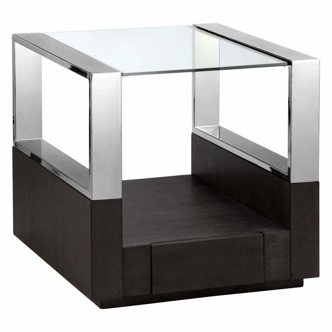 With its sleek and sophisticated design, the Magnussen Revere Contemporary Glass Top End Table with Storage is the perfect choice for your modern home. This two-toned end table boasts chrome end caps and a thick wood base with a deep graphite finish. A single storage drawer in the bottom, open shelving in the center, and a clear glass top brings the piece together for a functional work of art.